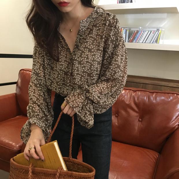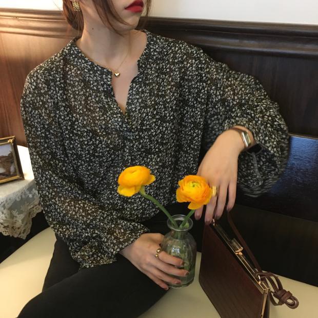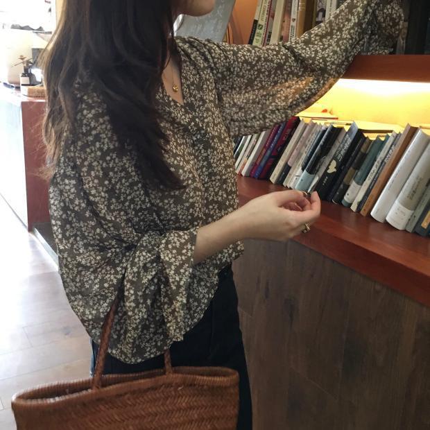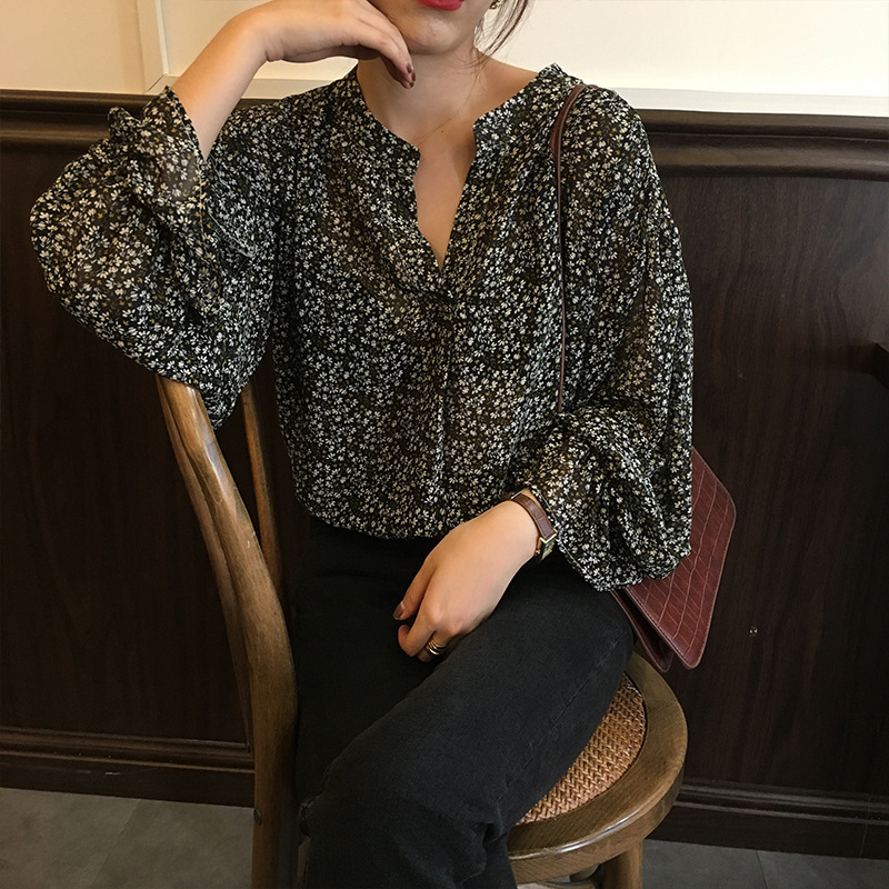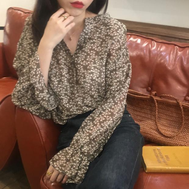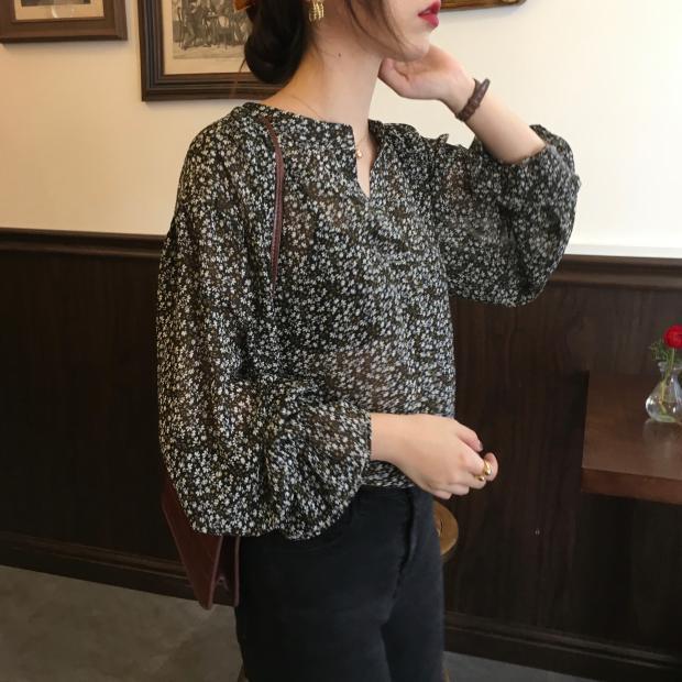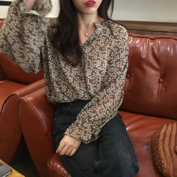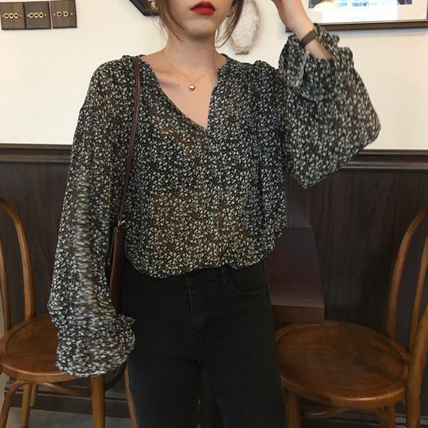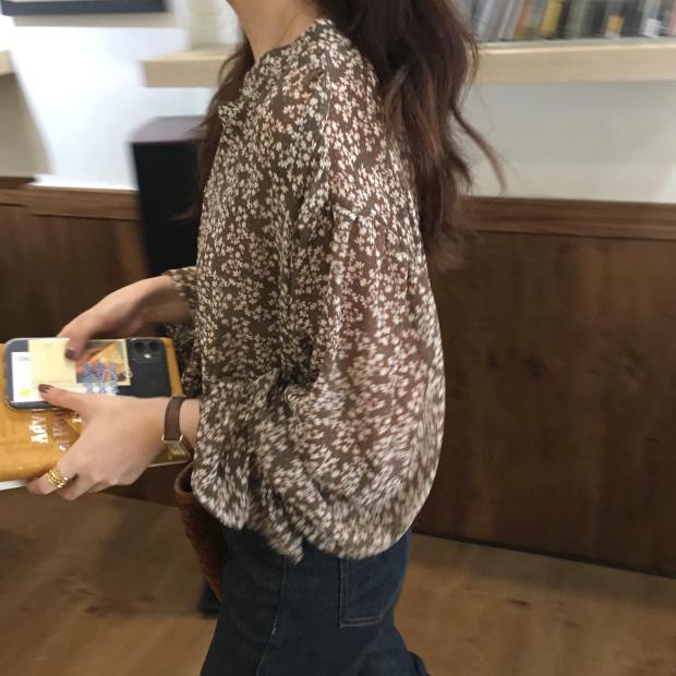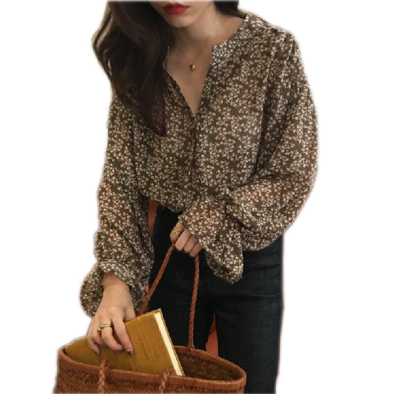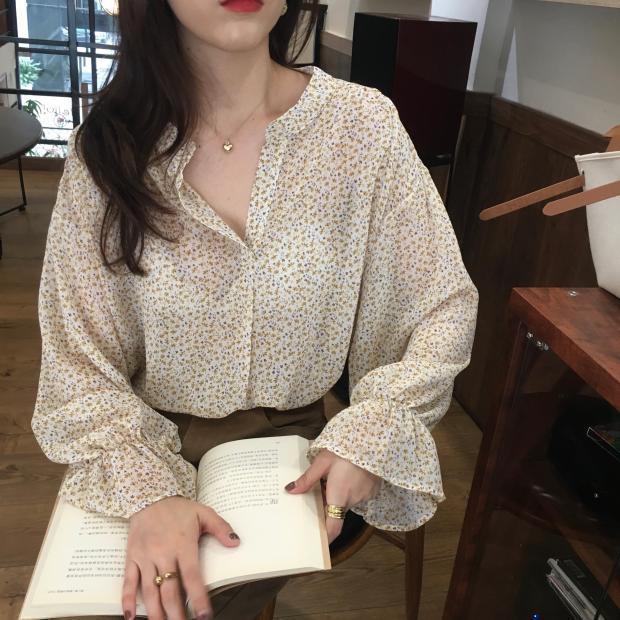 2023 달콤한 꽃 쉬폰 셔츠 여성용 낮은 칼라 트럼펫 슬리브 자외선 차단제 탑 긴 소매 봄과 가을 내부 베이스 셔츠스토어 가기