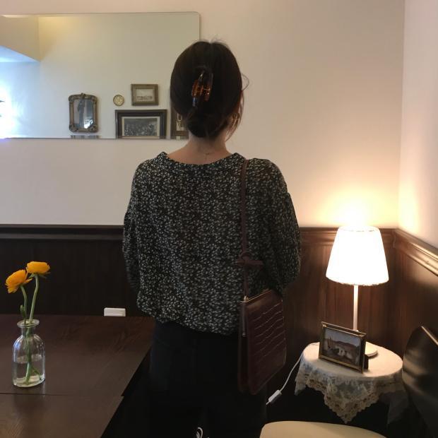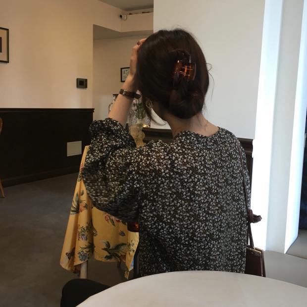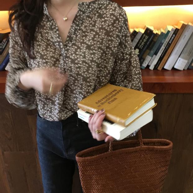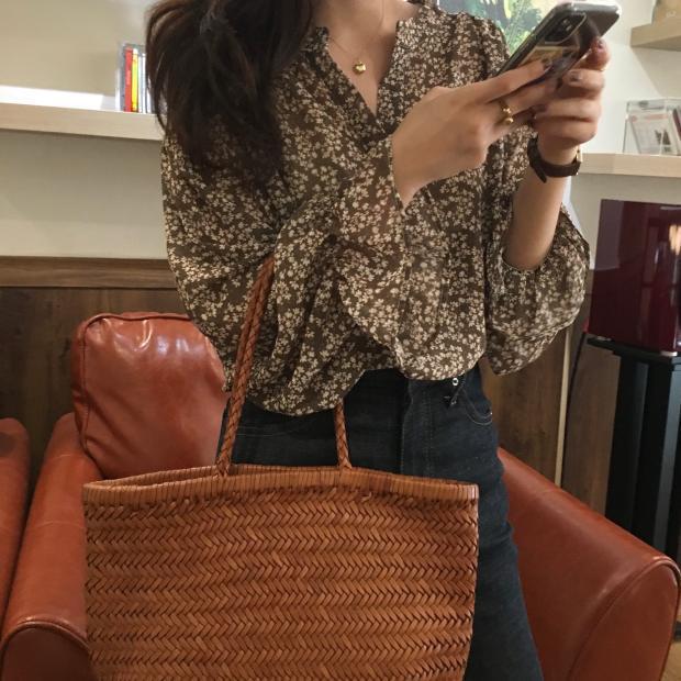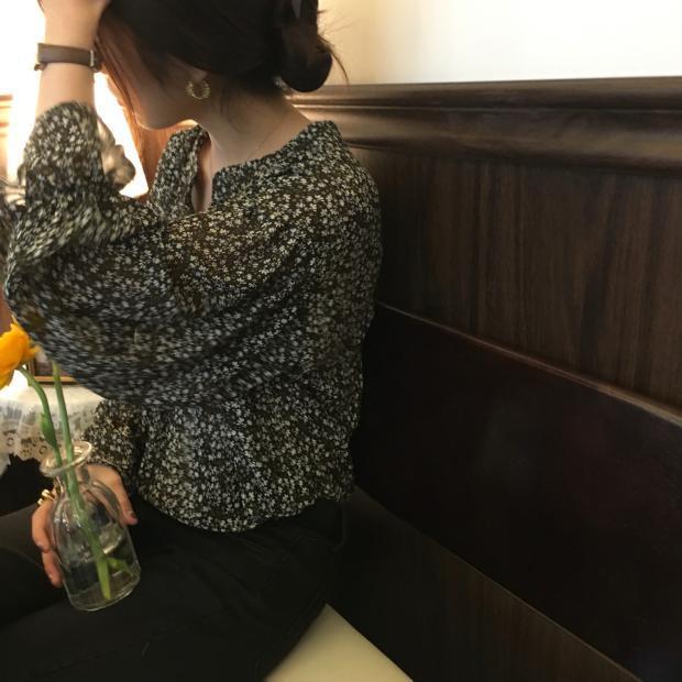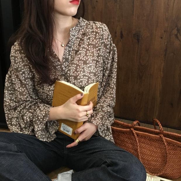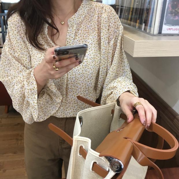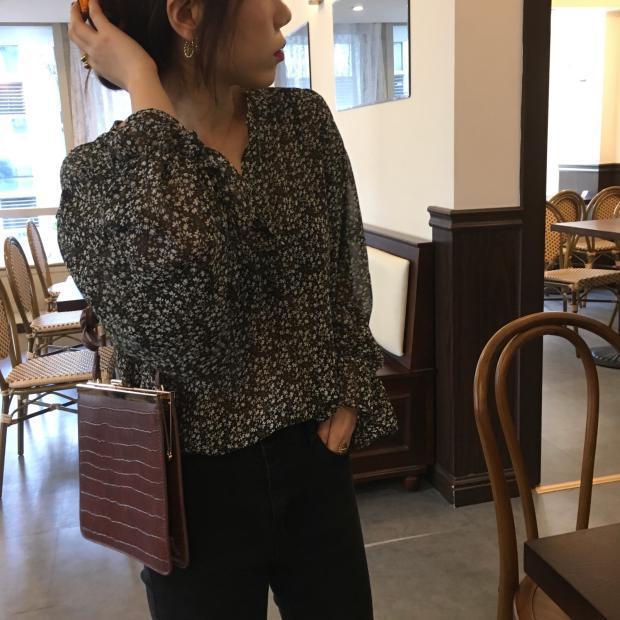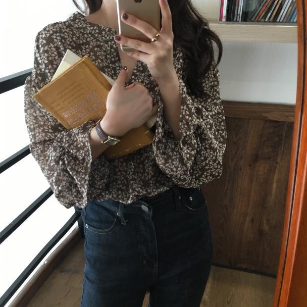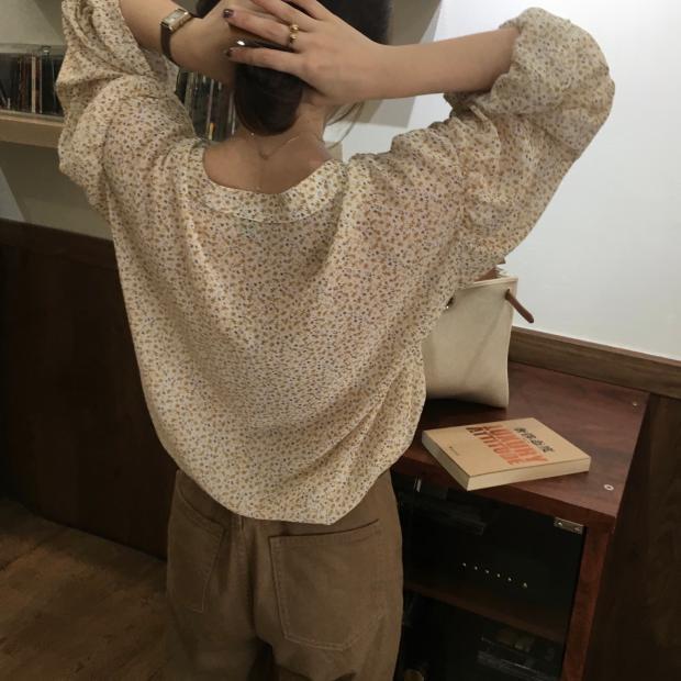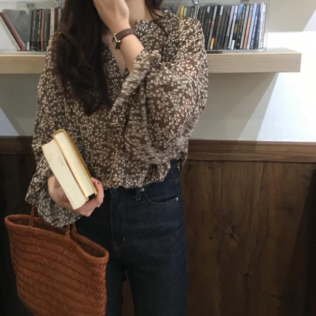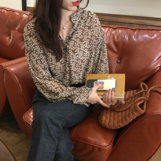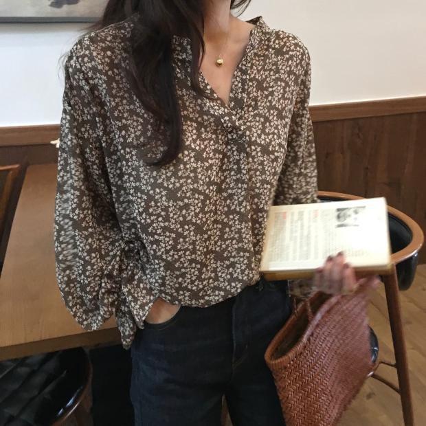 2023 달콤한 꽃 쉬폰 셔츠 여성용 낮은 칼라 트럼펫 슬리브 자외선 차단제 탑 긴 소매 봄과 가을 내부 베이스 셔츠스토어 가기