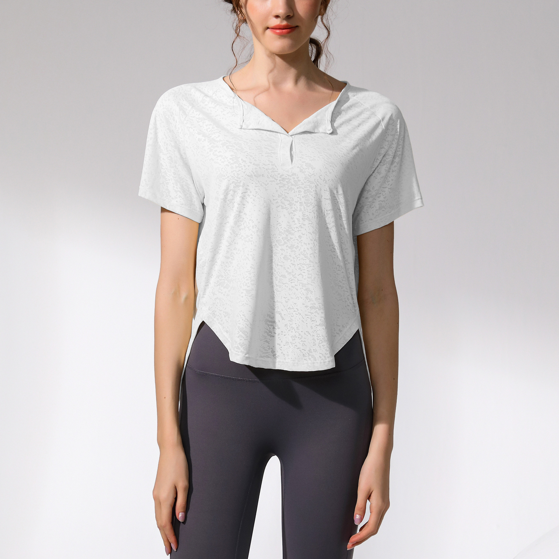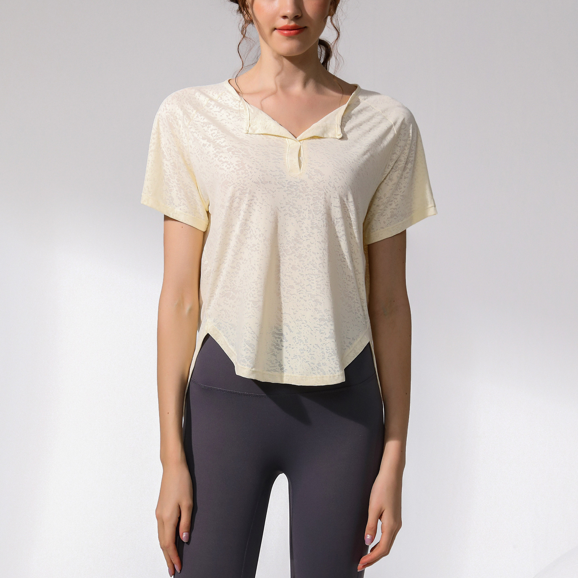 요가 의류 여성용 여름 V-넥 쿨 느슨한 슬리밍 통기성 반팔 티셔츠 러닝 스포츠 블라우스 피트니스 탑