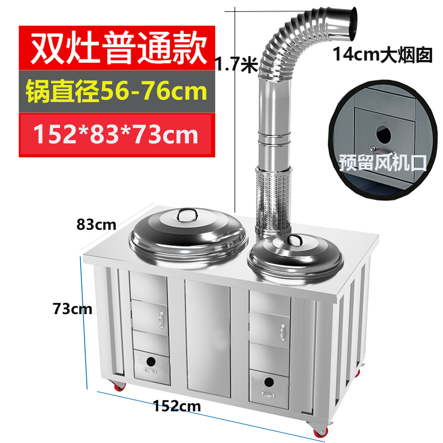 • 더블 스토브 모델: 76-56cm 웍 + 측면 패널 + 구리 물 탱크(14cm 대형 굴뚝은 화력이 높고 연기가 돌아오지 않음)