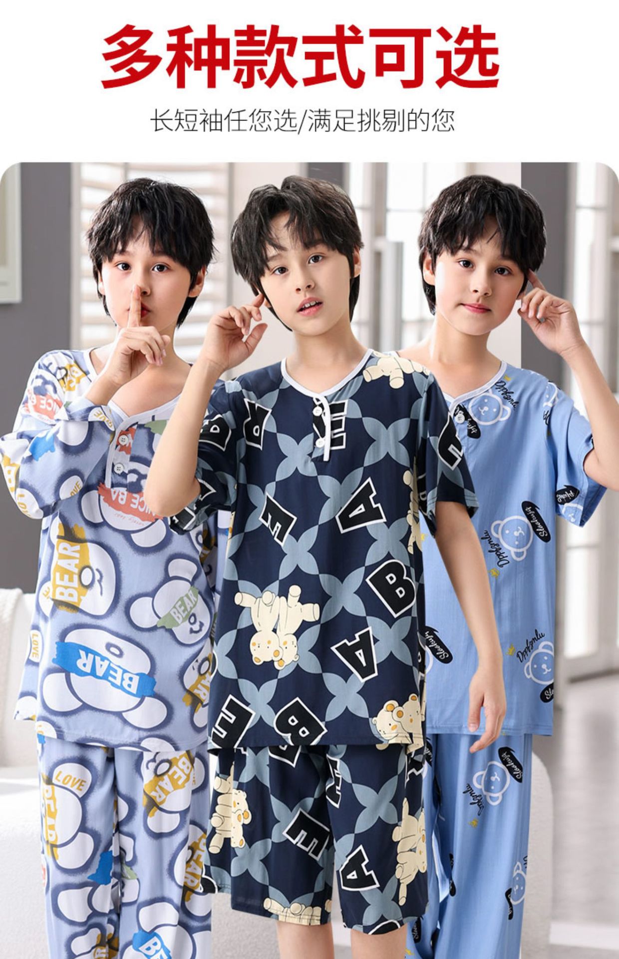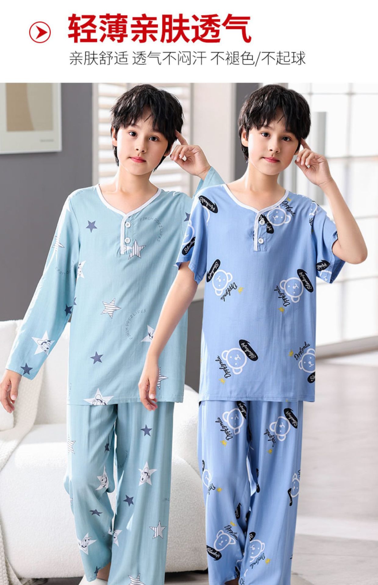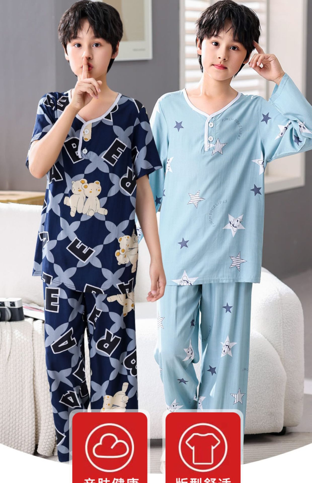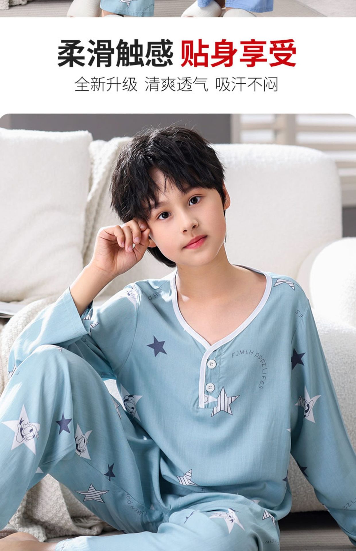 십대 면 실크 잠옷 남자의 중학교 긴 소매 세트 느슨한 면 실크 에어컨 세트 여름 얇은 중대형 어린이스토어 가기