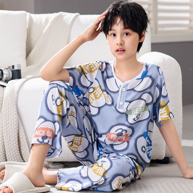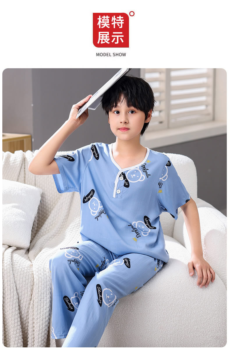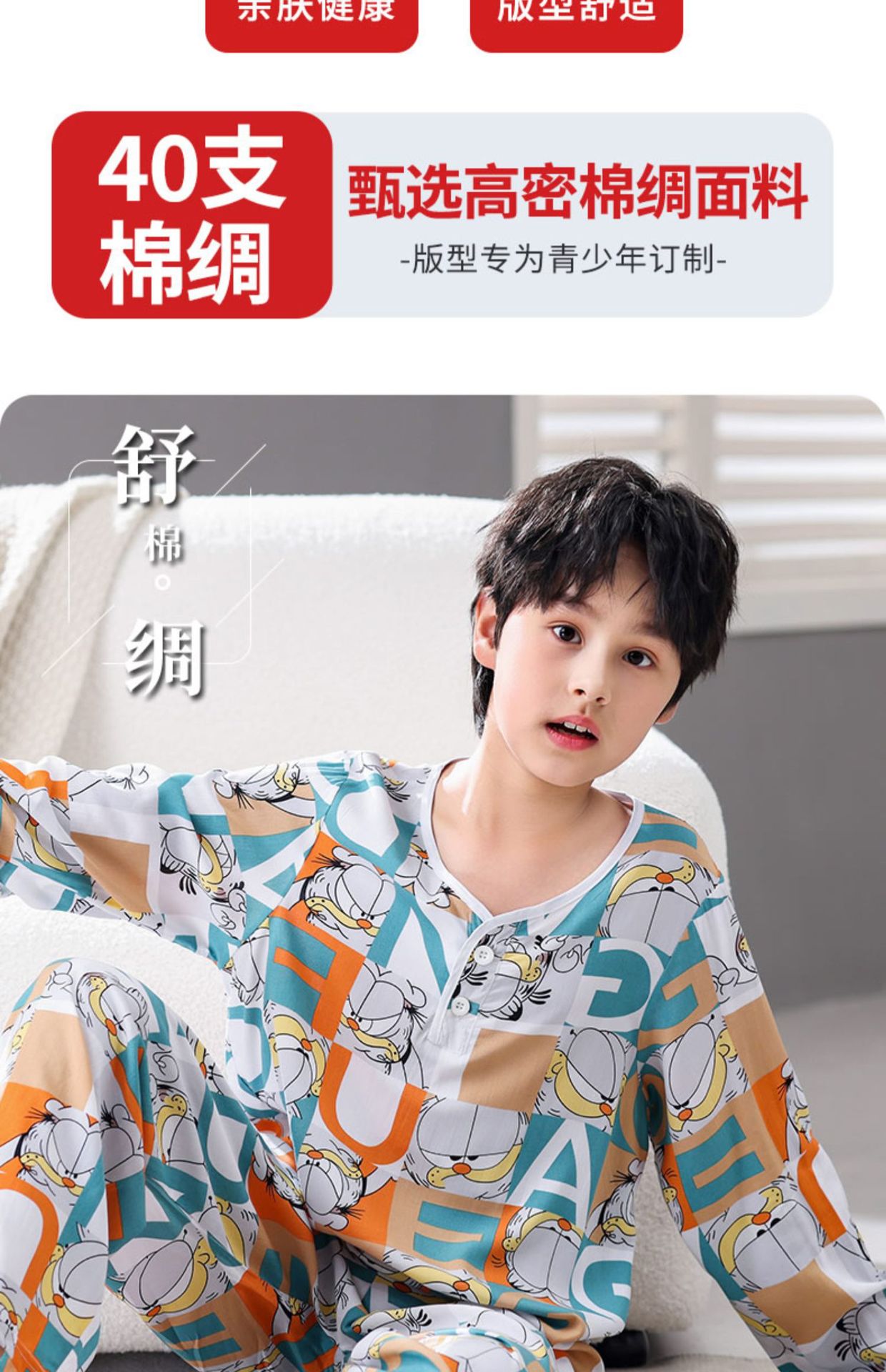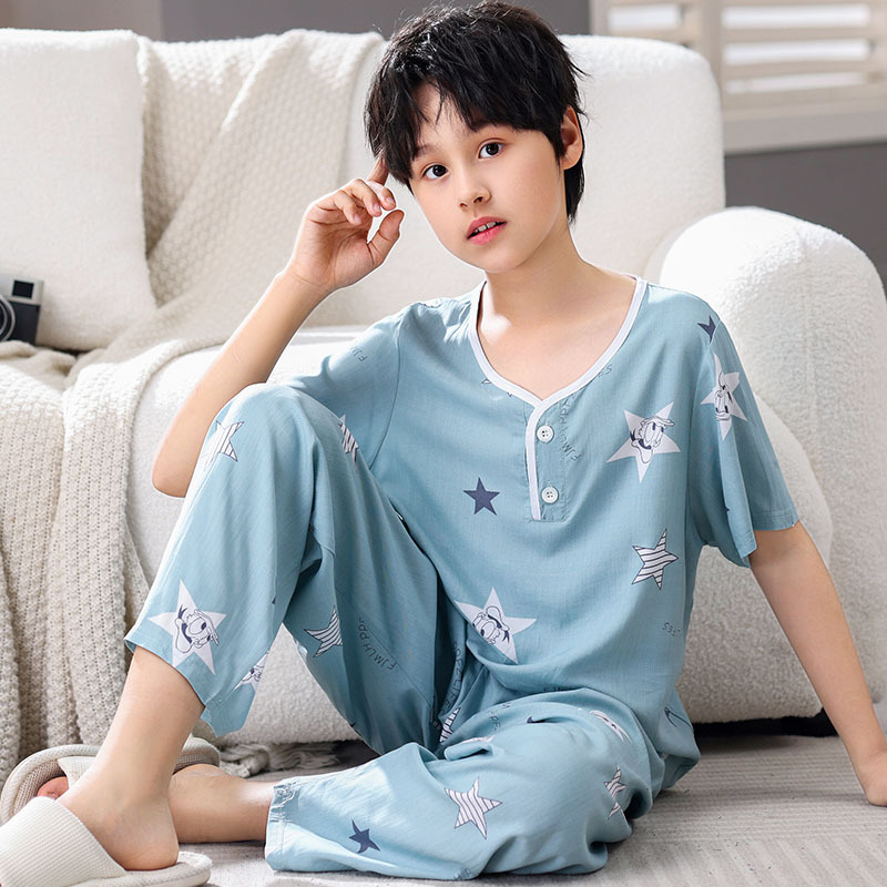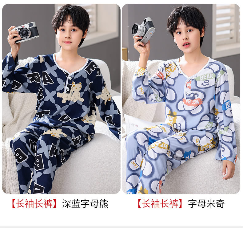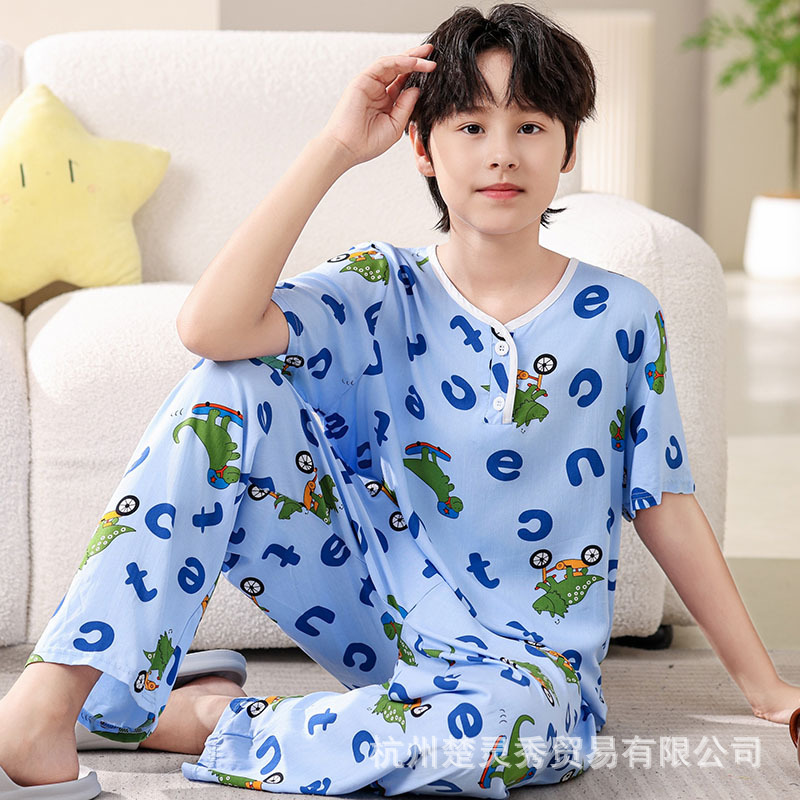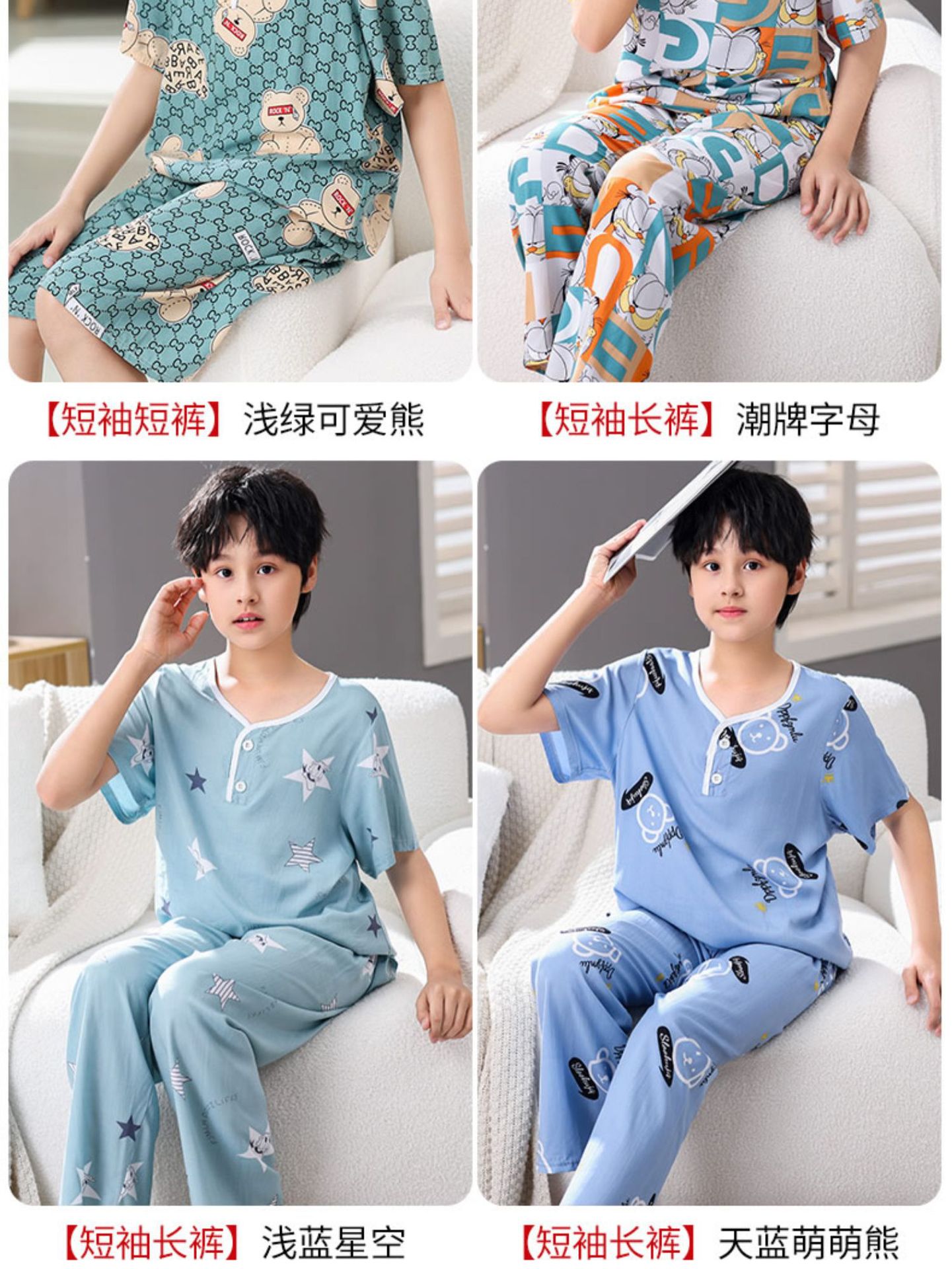 십대 면 실크 잠옷 남자의 중학교 긴 소매 세트 느슨한 면 실크 에어컨 세트 여름 얇은 중대형 어린이스토어 가기
