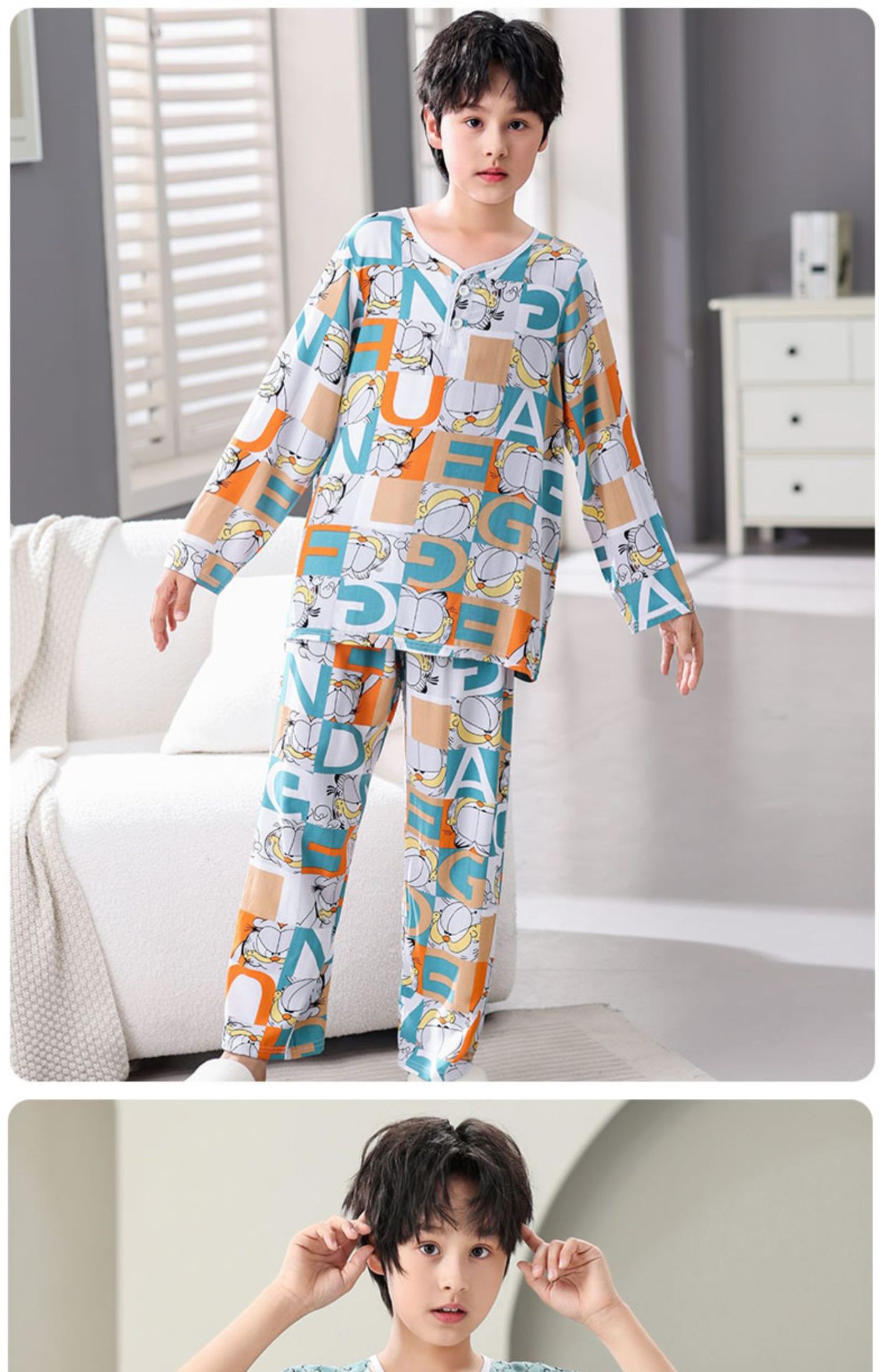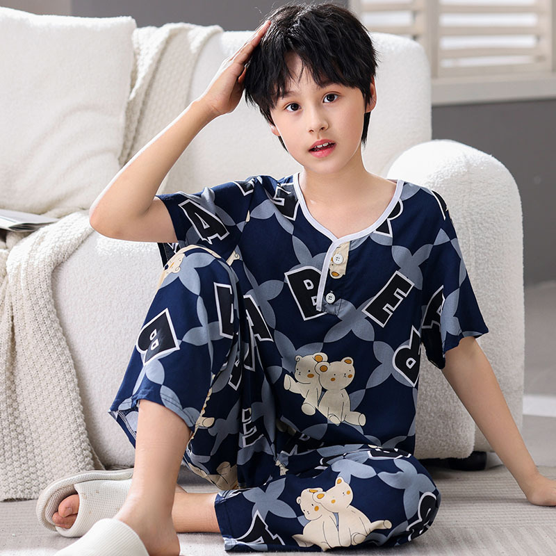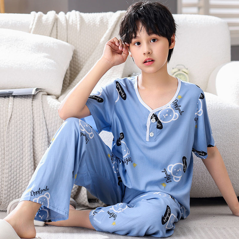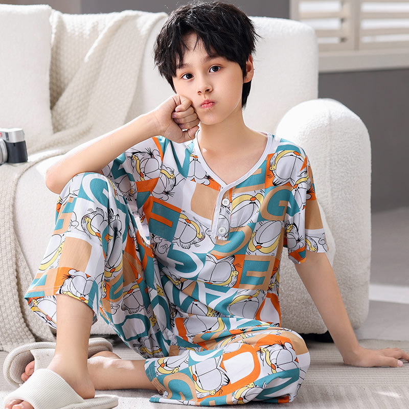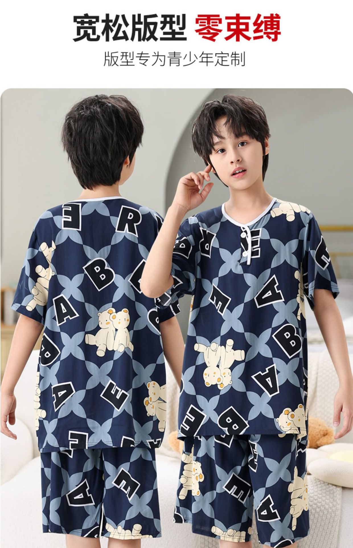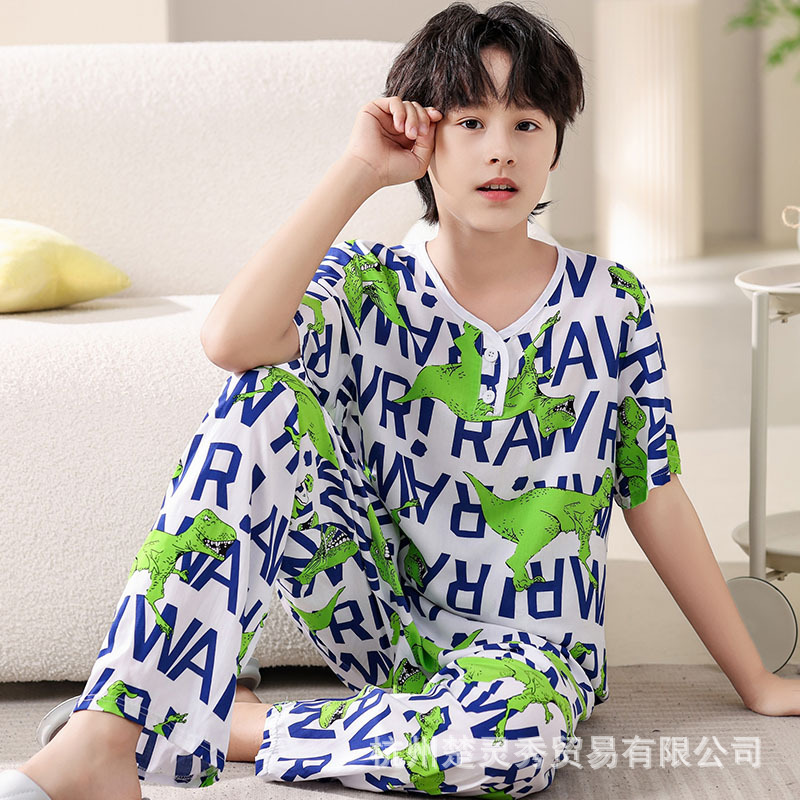 십대 면 실크 잠옷 남자의 중학교 긴 소매 세트 느슨한 면 실크 에어컨 세트 여름 얇은 중대형 어린이스토어 가기