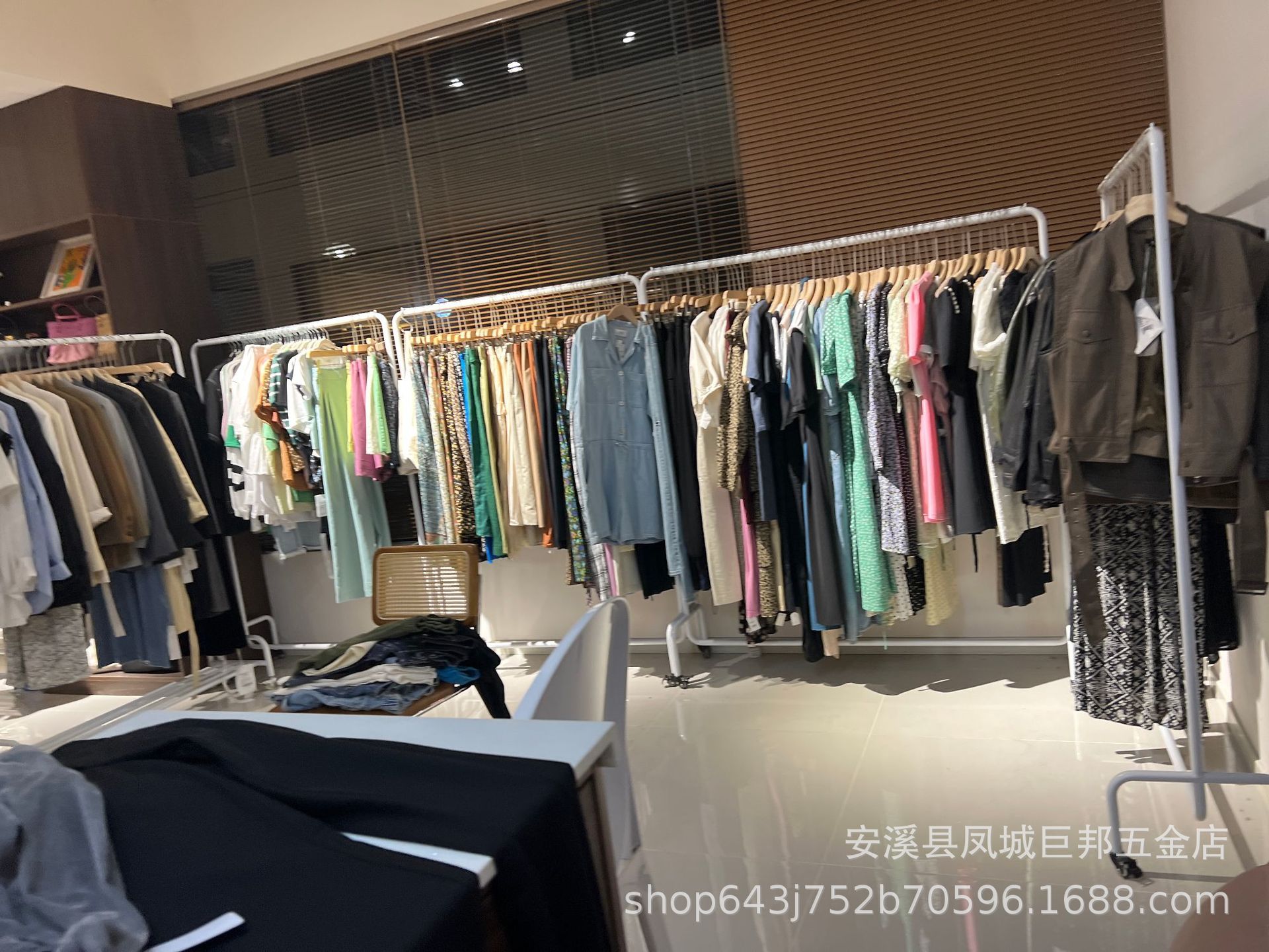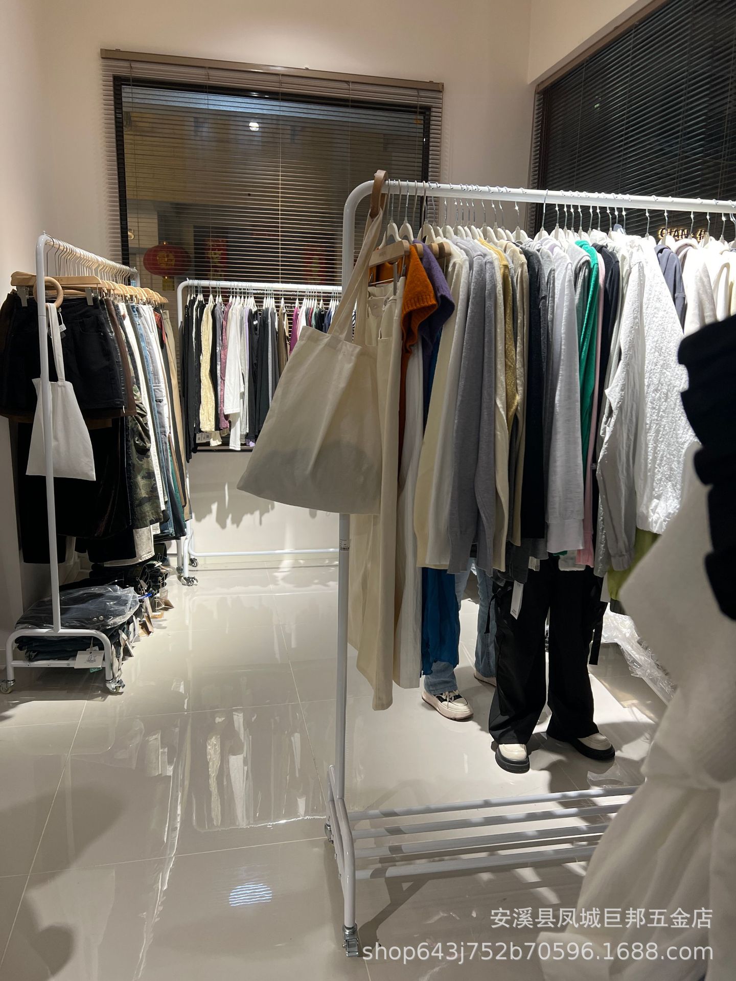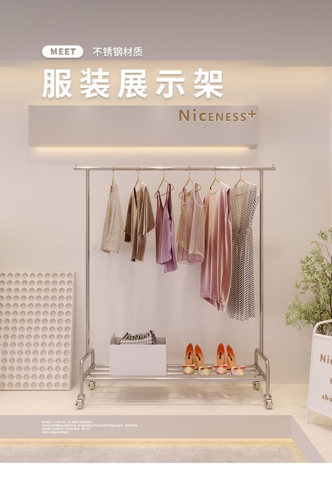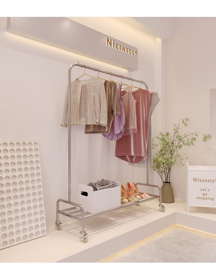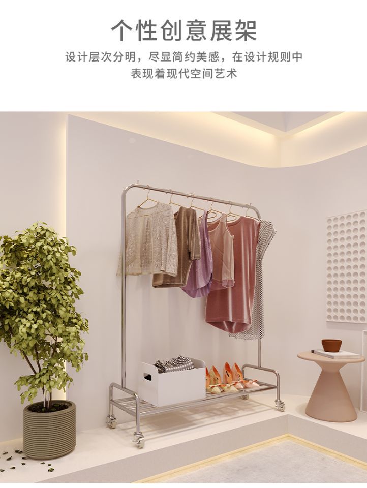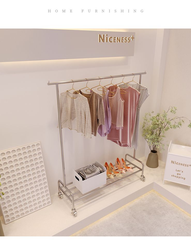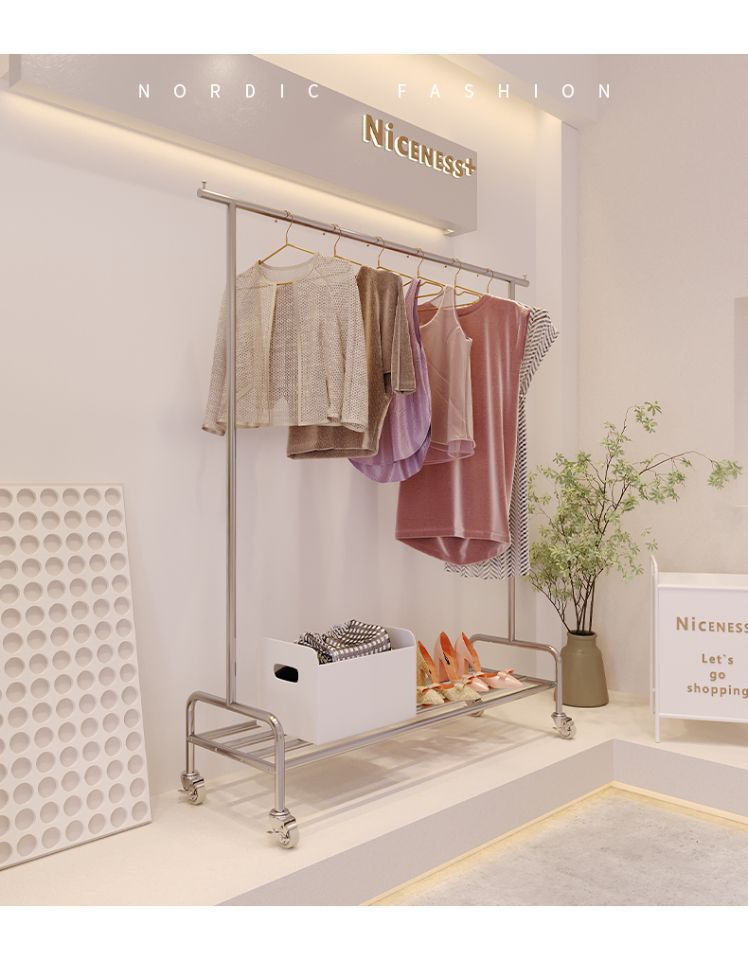 바퀴 달린 크림 스타일의 흰색 의류 진열대 아동 의류 모바일 선반 여성 의류 매장 바닥 스테인레스 스틸 행거스토어 가기