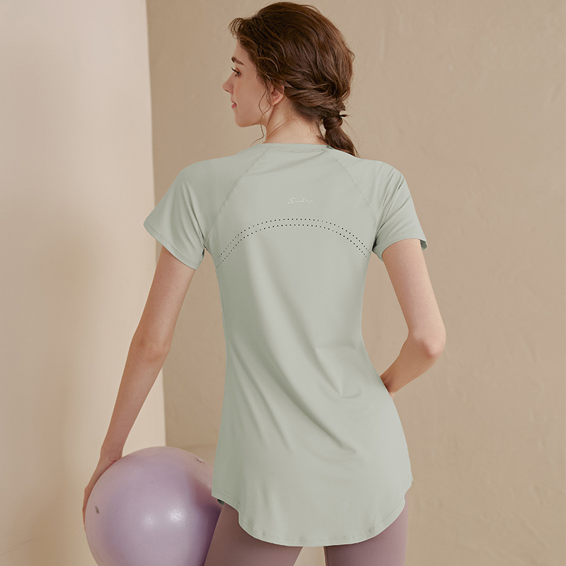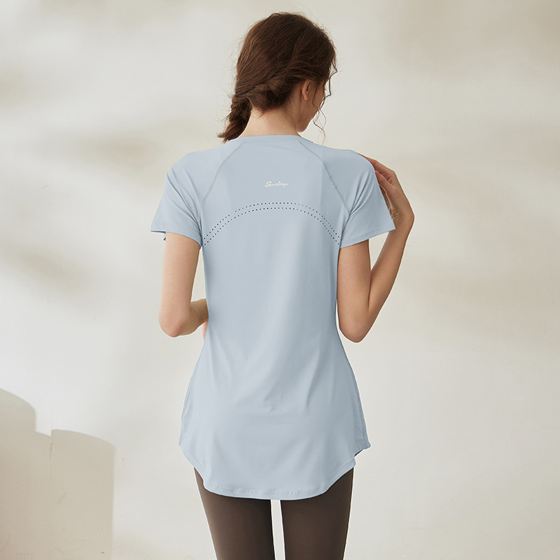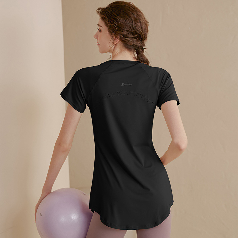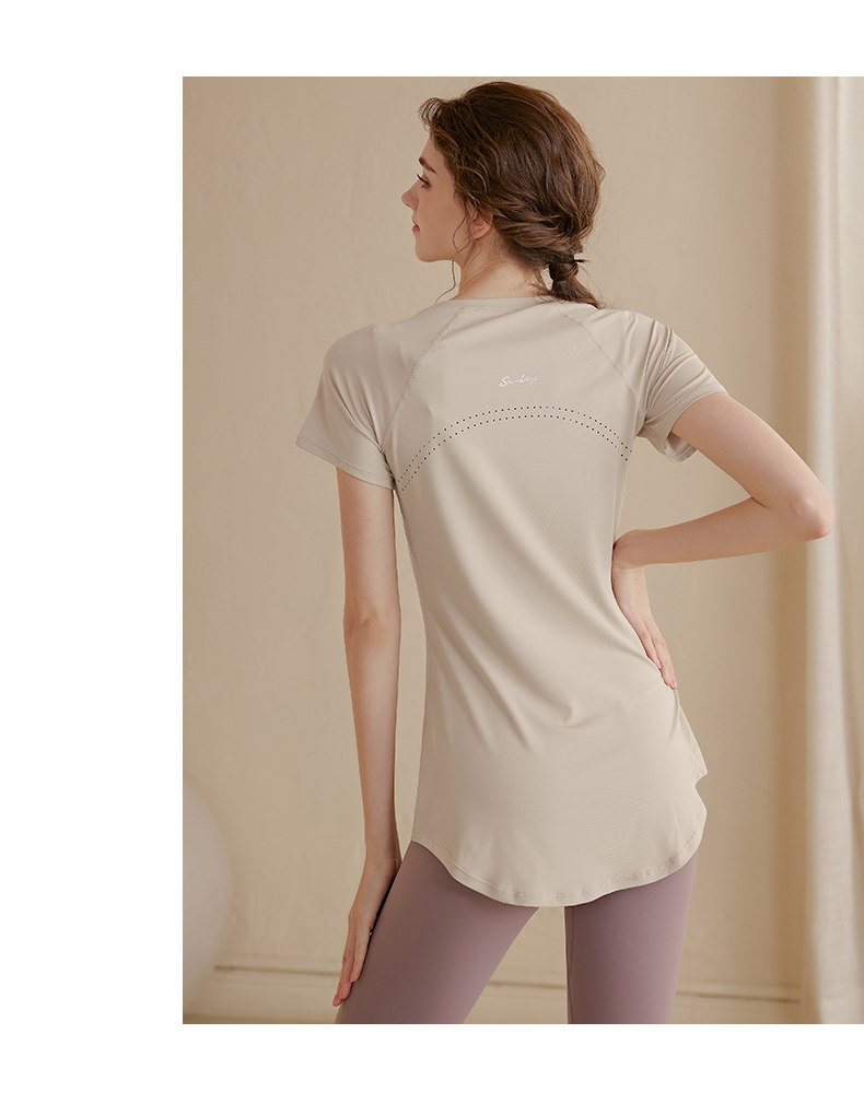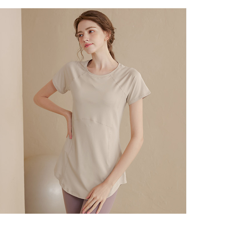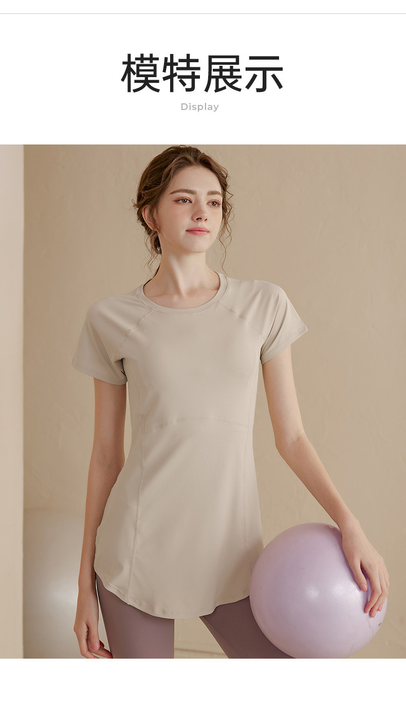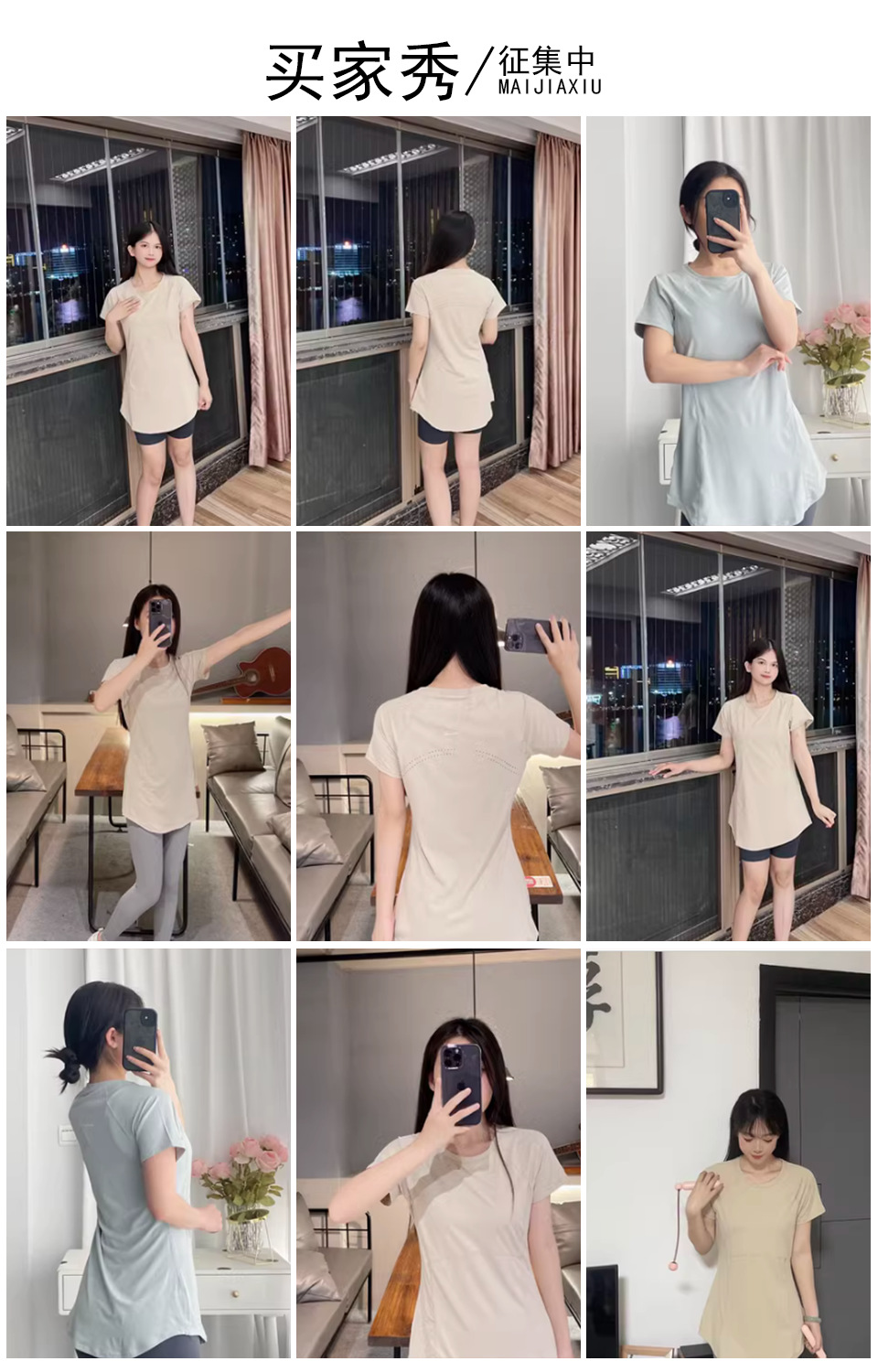2025 새로운 요가 착용 여성의 중간 길이 엉덩이 덮는 슬리밍 반팔 티셔츠 러닝 스포츠 탑 피트니스웨어 여름