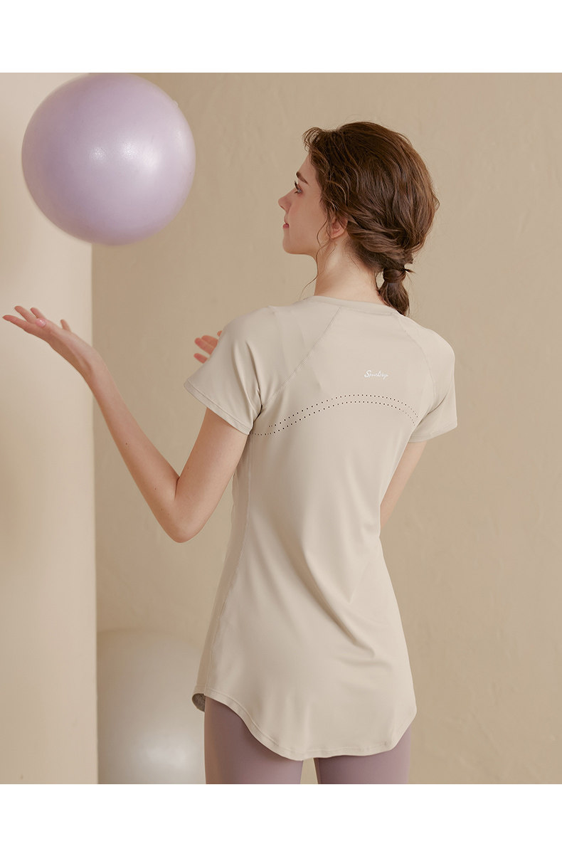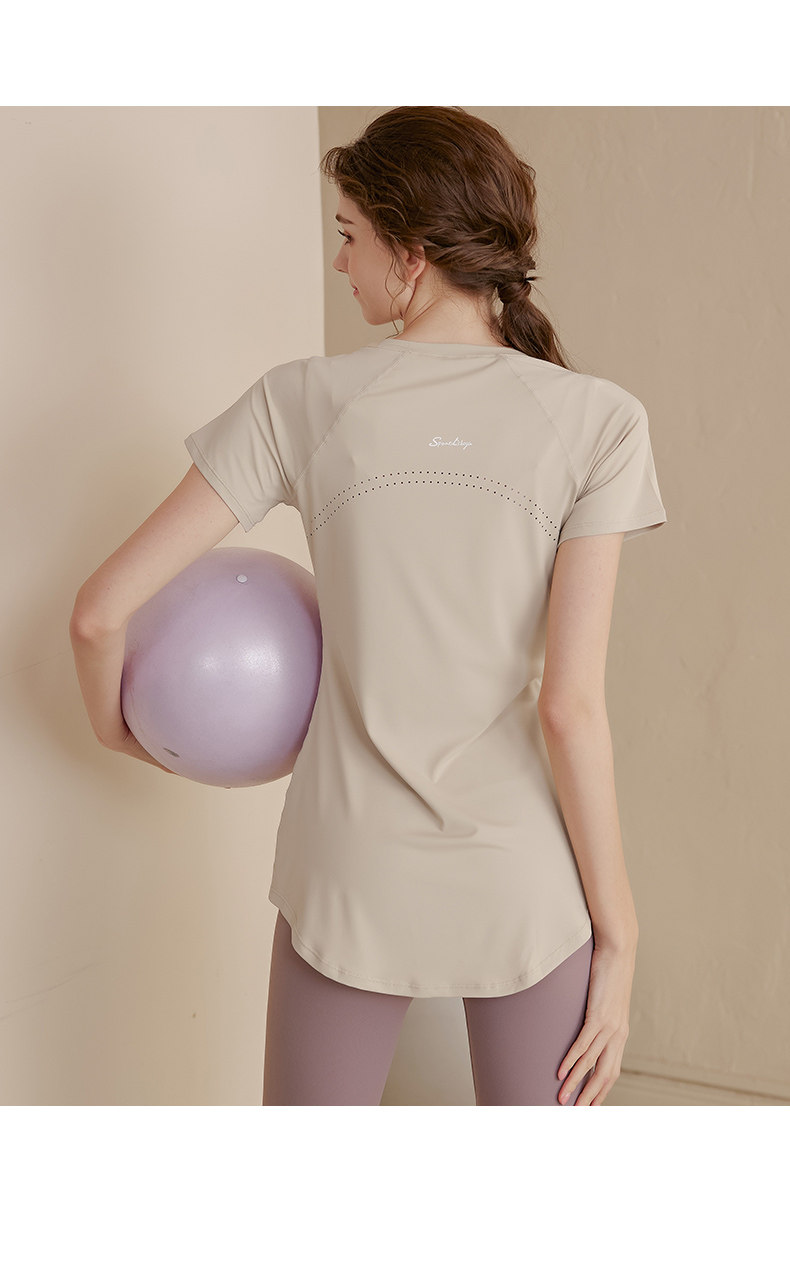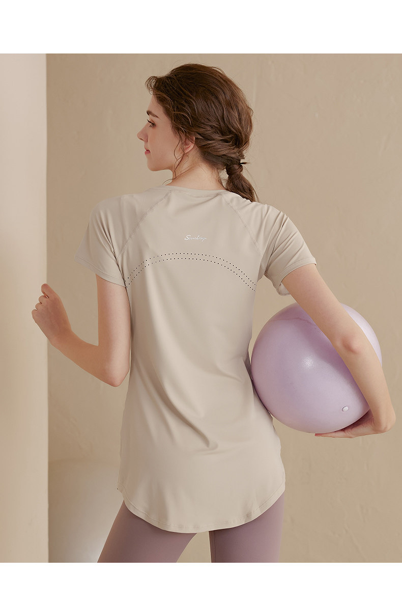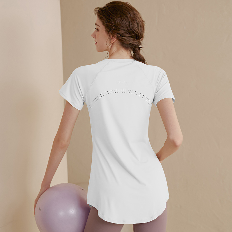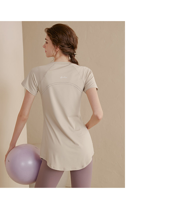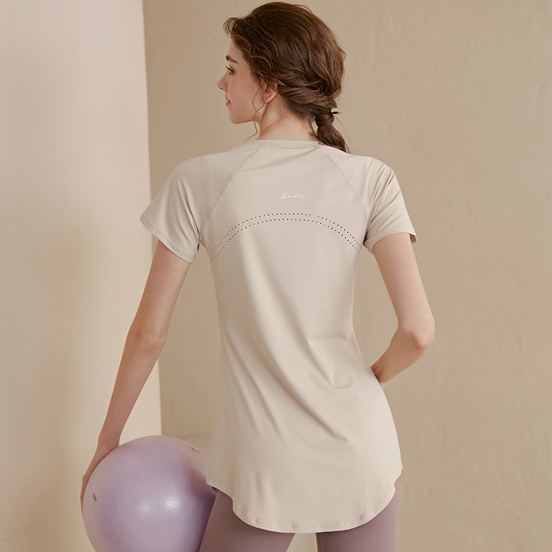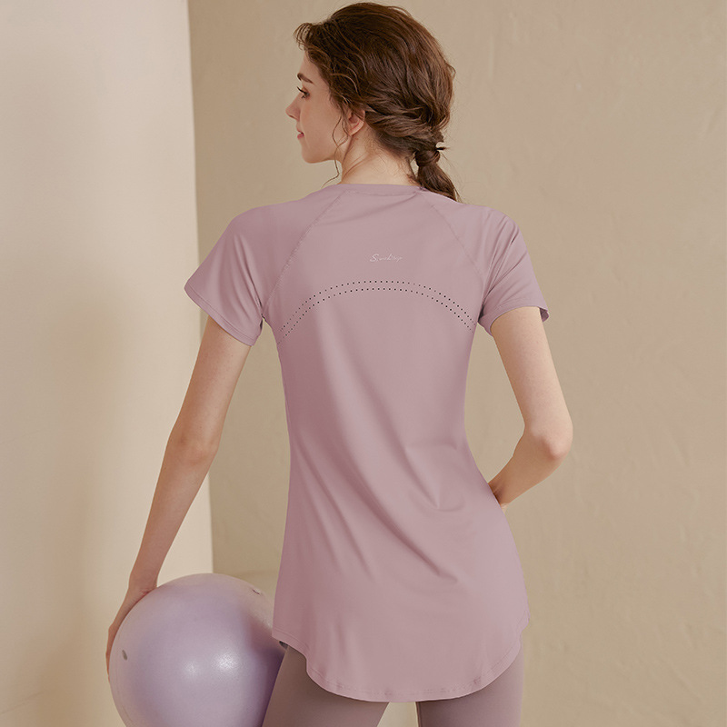 2025 새로운 요가 착용 여성의 중간 길이 엉덩이 덮는 슬리밍 반팔 티셔츠 러닝 스포츠 탑 피트니스웨어 여름
