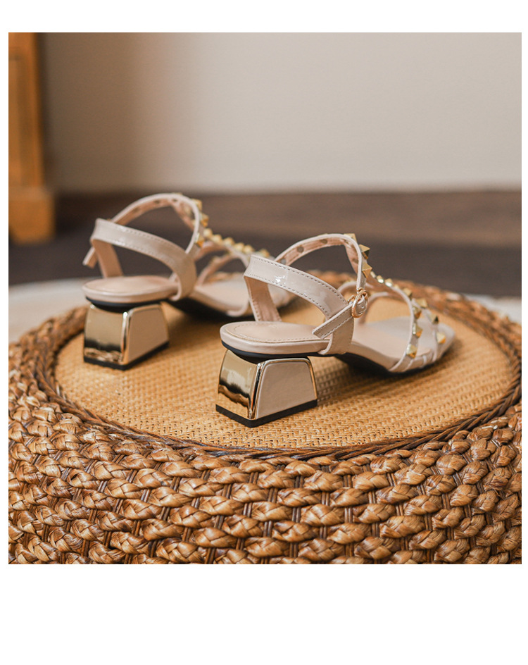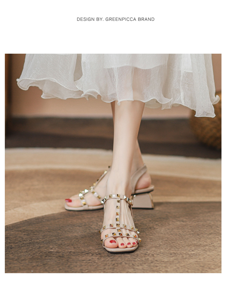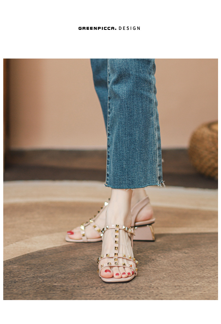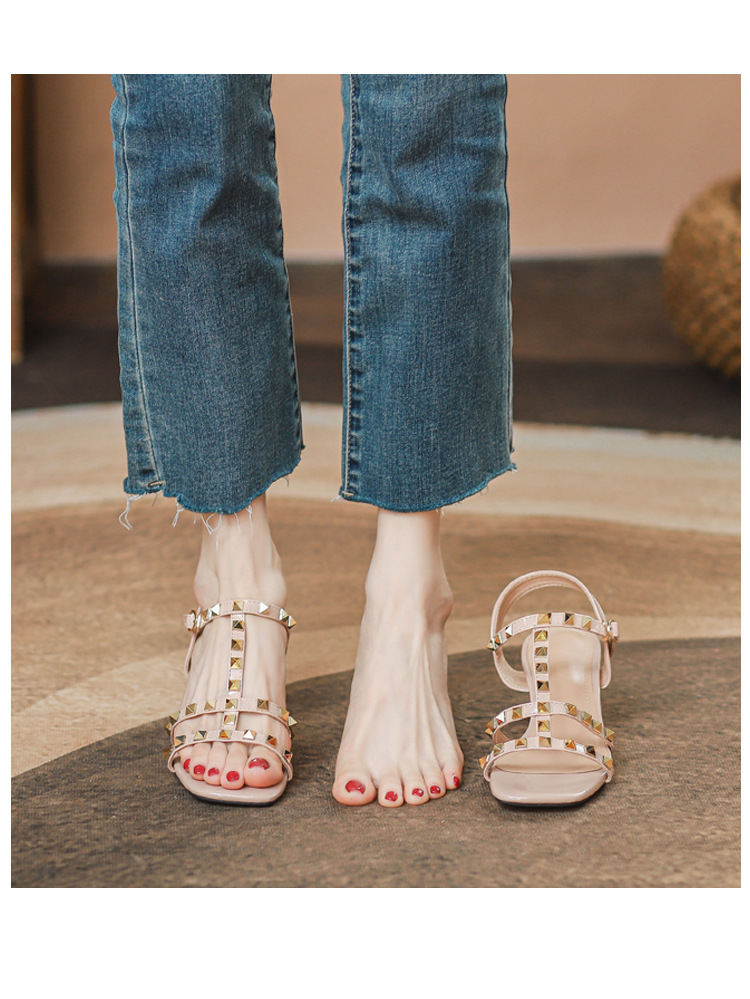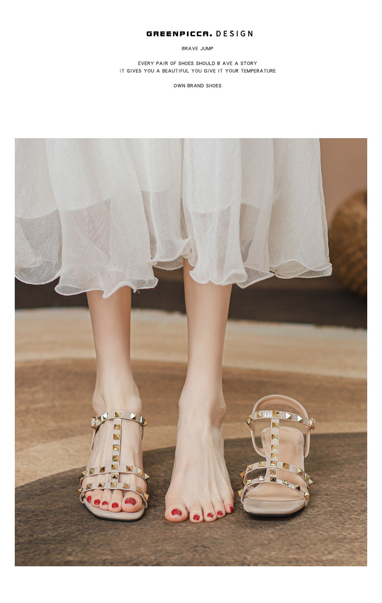 여성을위한 리벳 샌들 2025 여름 새로운 인터넷 연예인 패션 요정 스타일 스커트 중간 굽 로마 하이힐