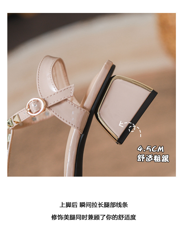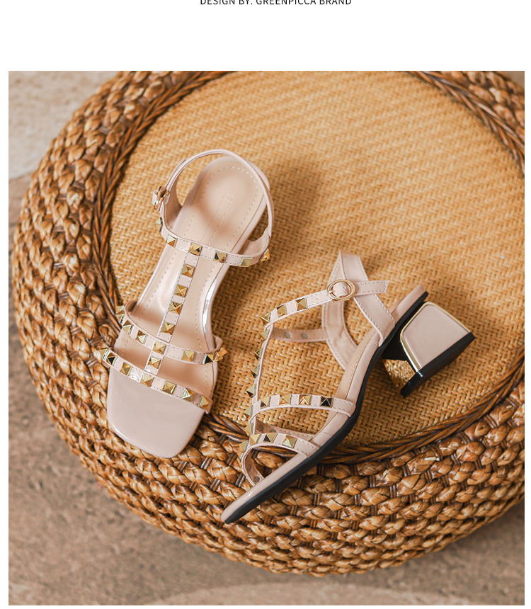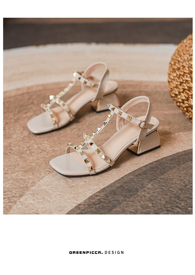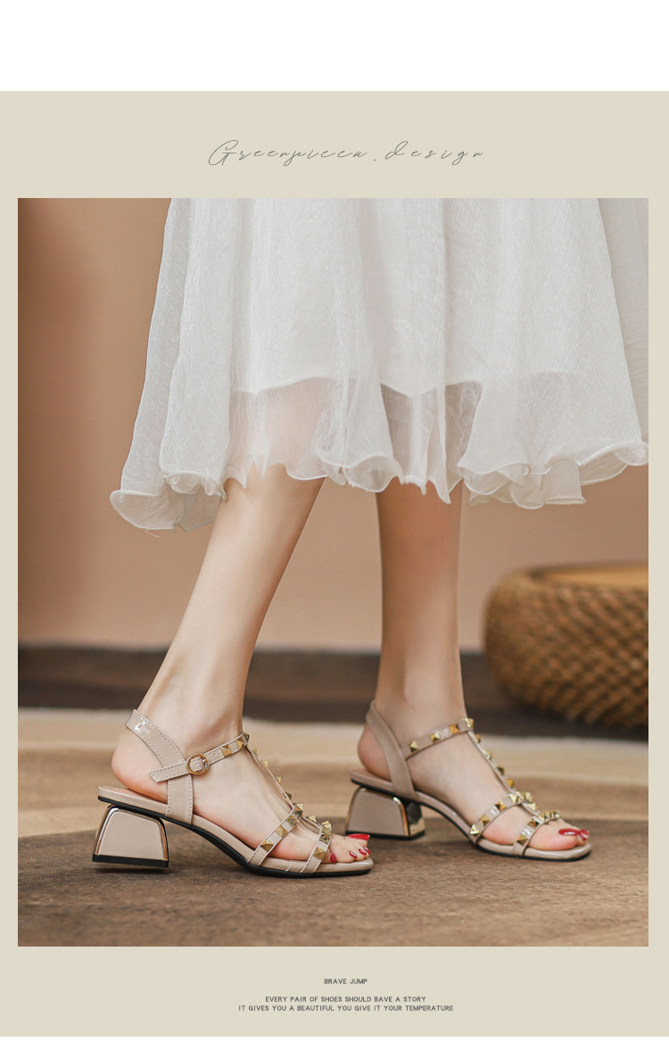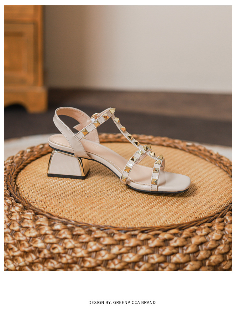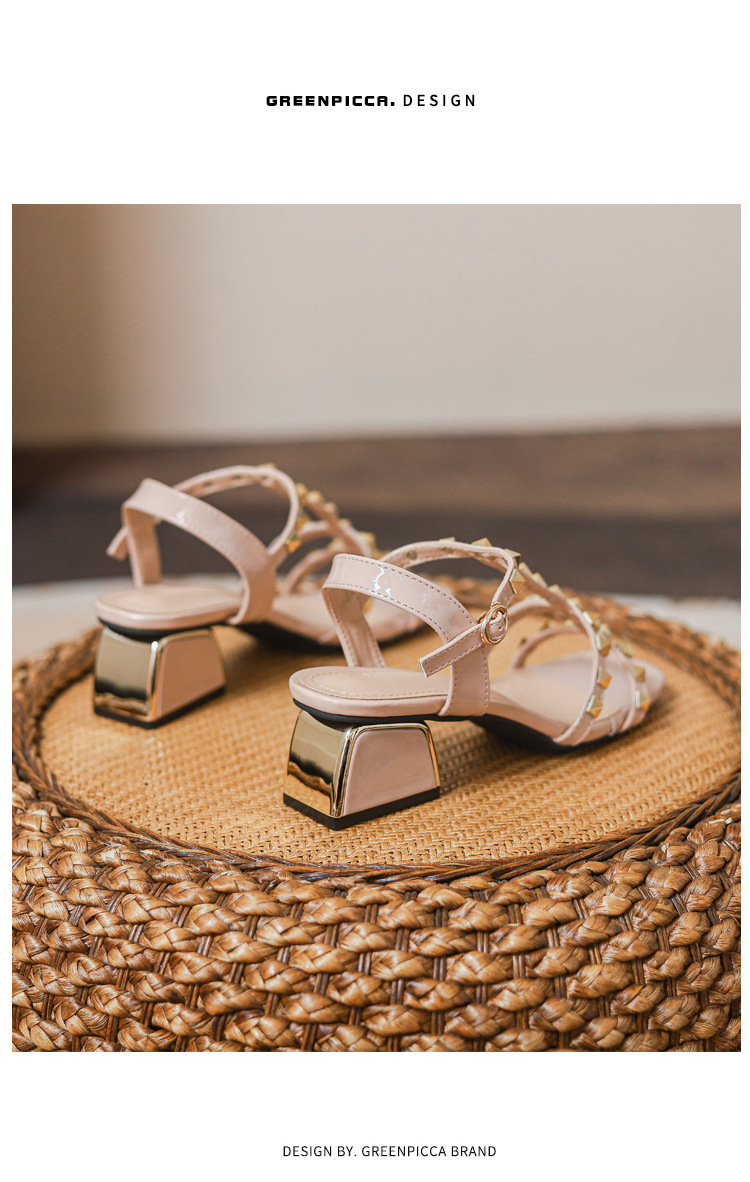 여성을위한 리벳 샌들 2025 여름 새로운 인터넷 연예인 패션 요정 스타일 스커트 중간 굽 로마 하이힐