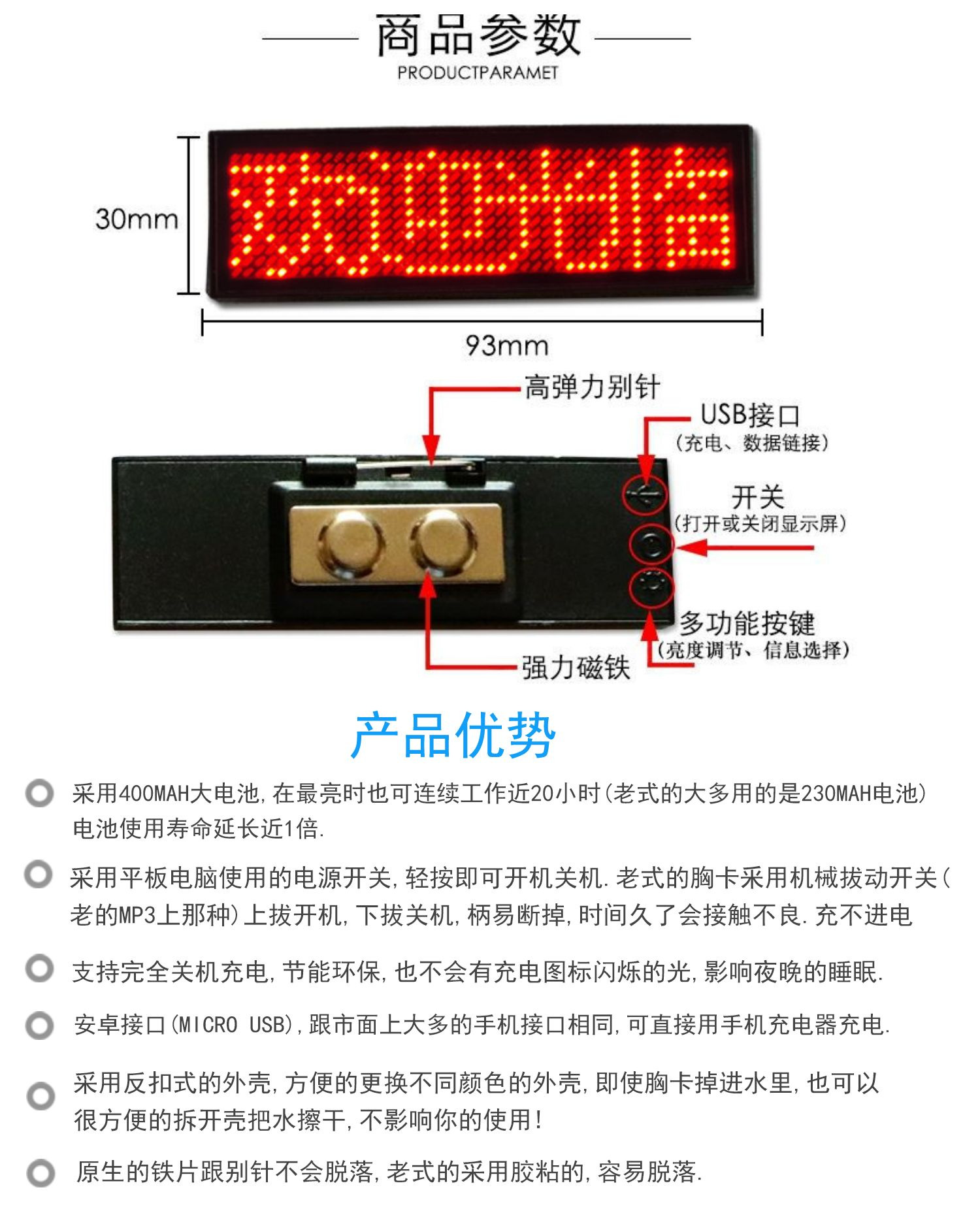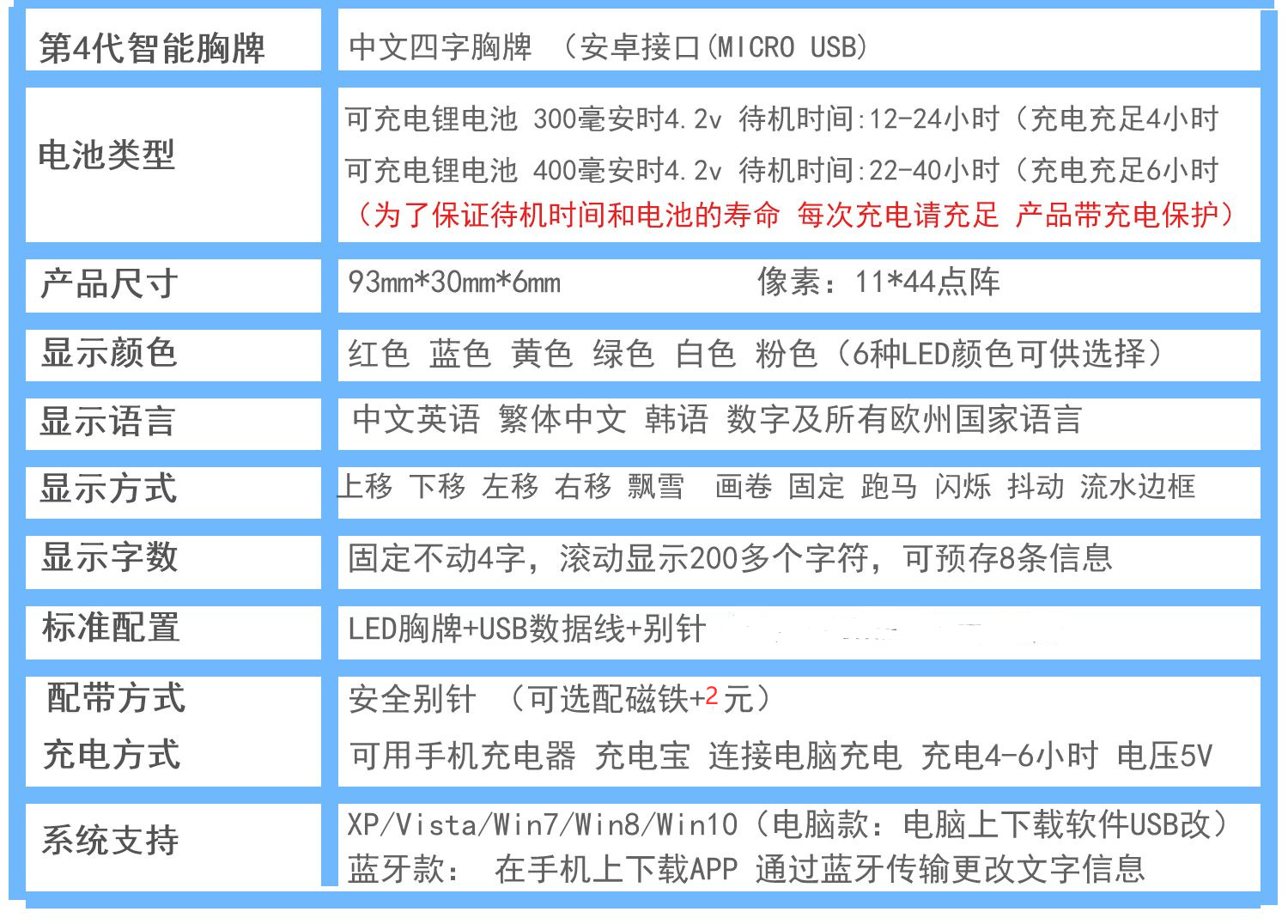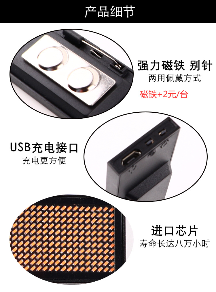产品标配:LED胸牌+数据线+别针(磁铁可选配+2元/台)