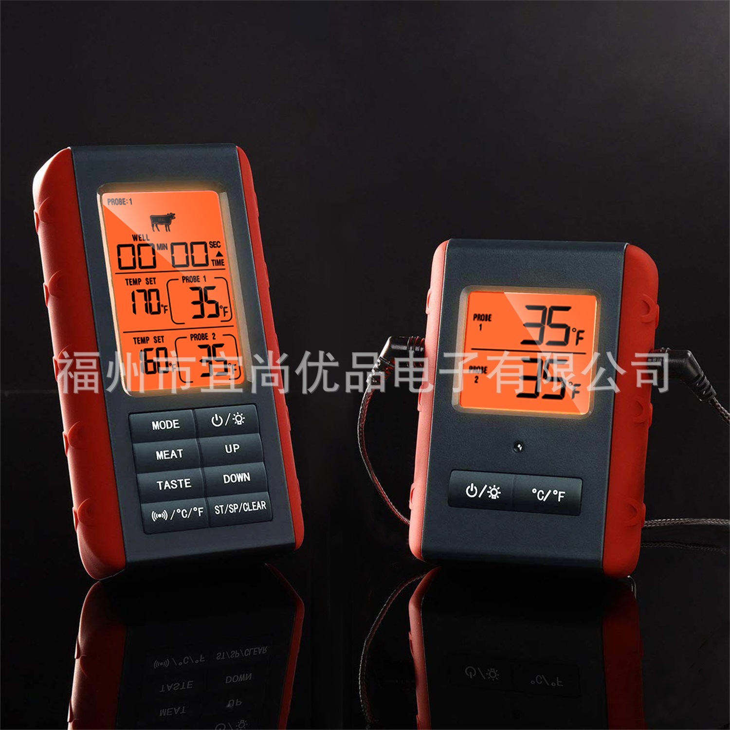 1.功能:两个测温通道,两个温度同屏显示,可以同时监控两种种食物温度。8种肉类、5种口味选择,也可以自主设定目标温度,一组计时器,操作简单方便