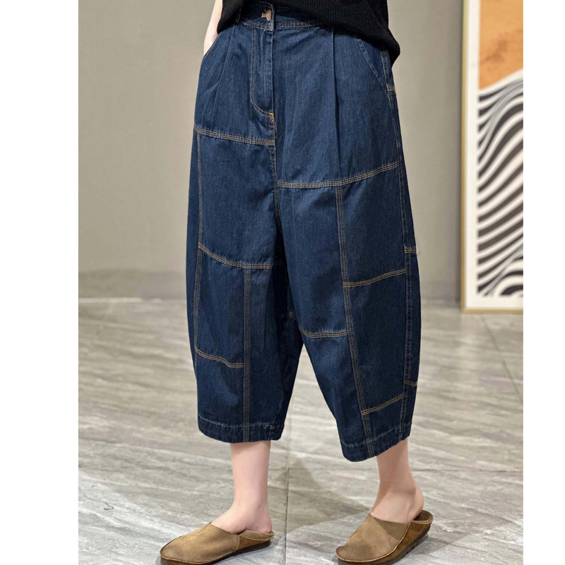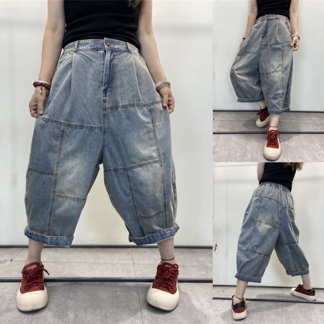 여름 느슨한 성격 바느질 할란 청바지 여자의 복고풍 고뇌 조커 플러스 사이즈 자른 무 바지 도매스토어 가기