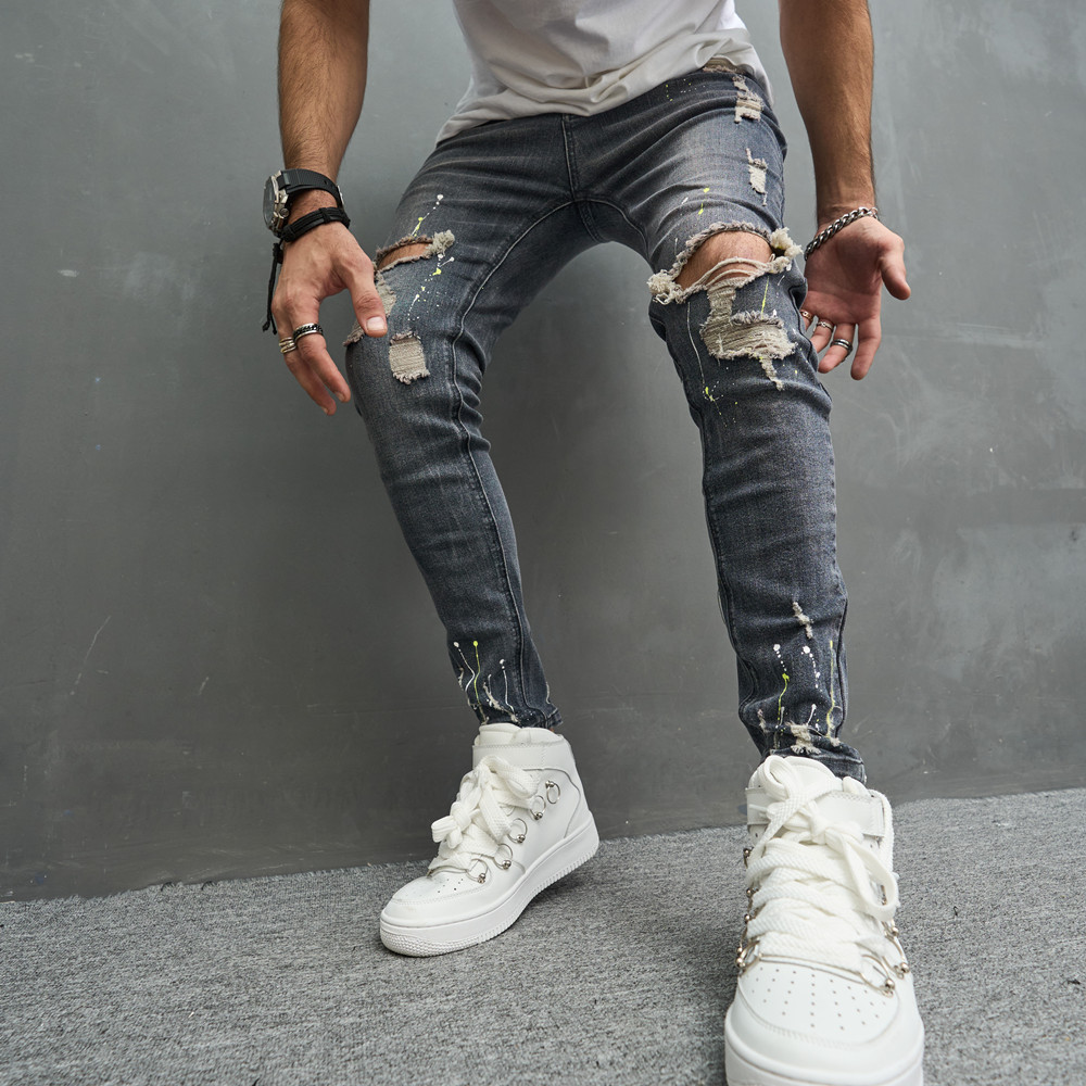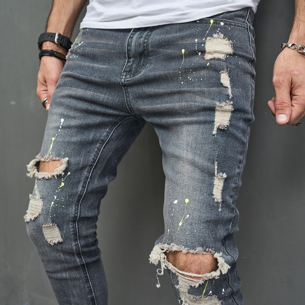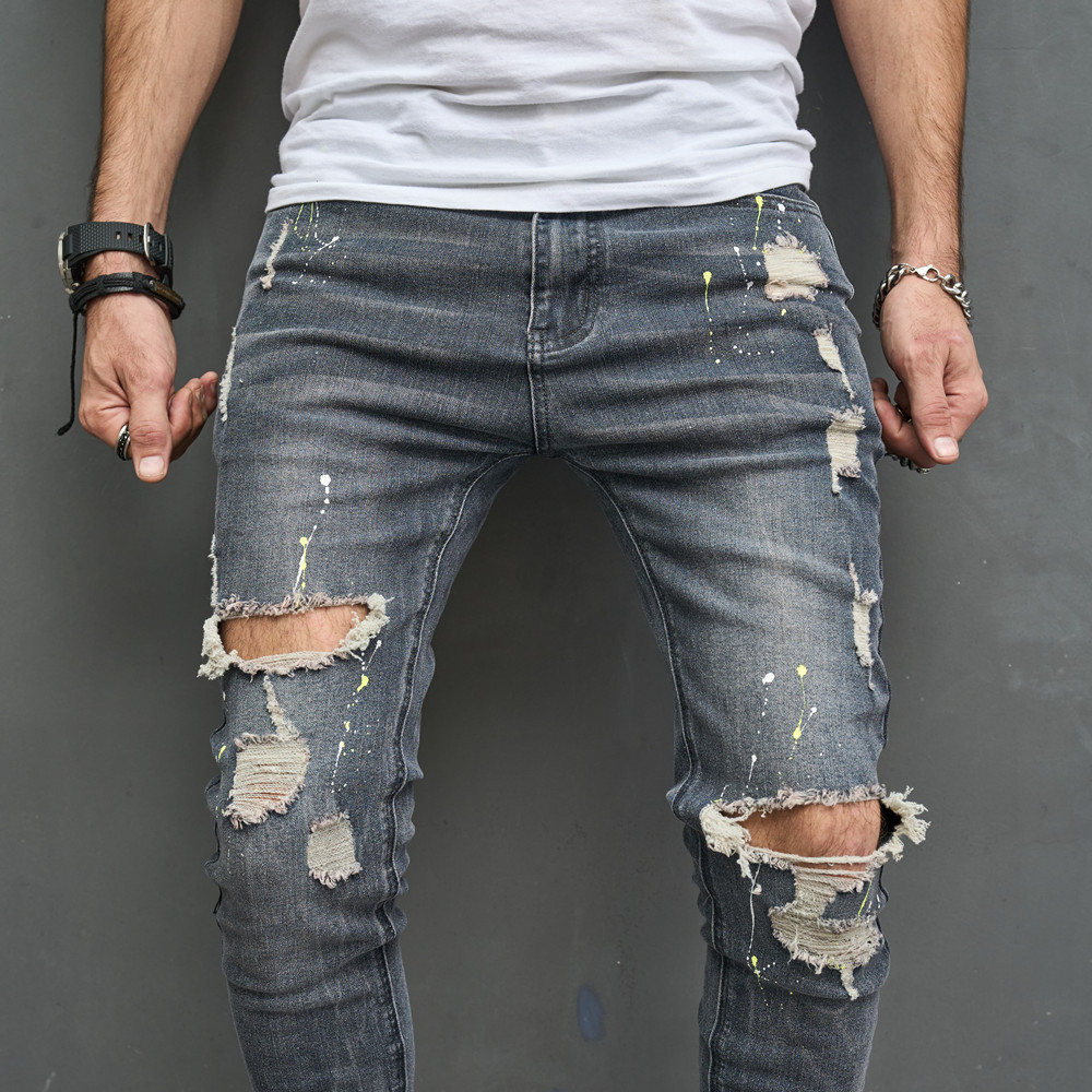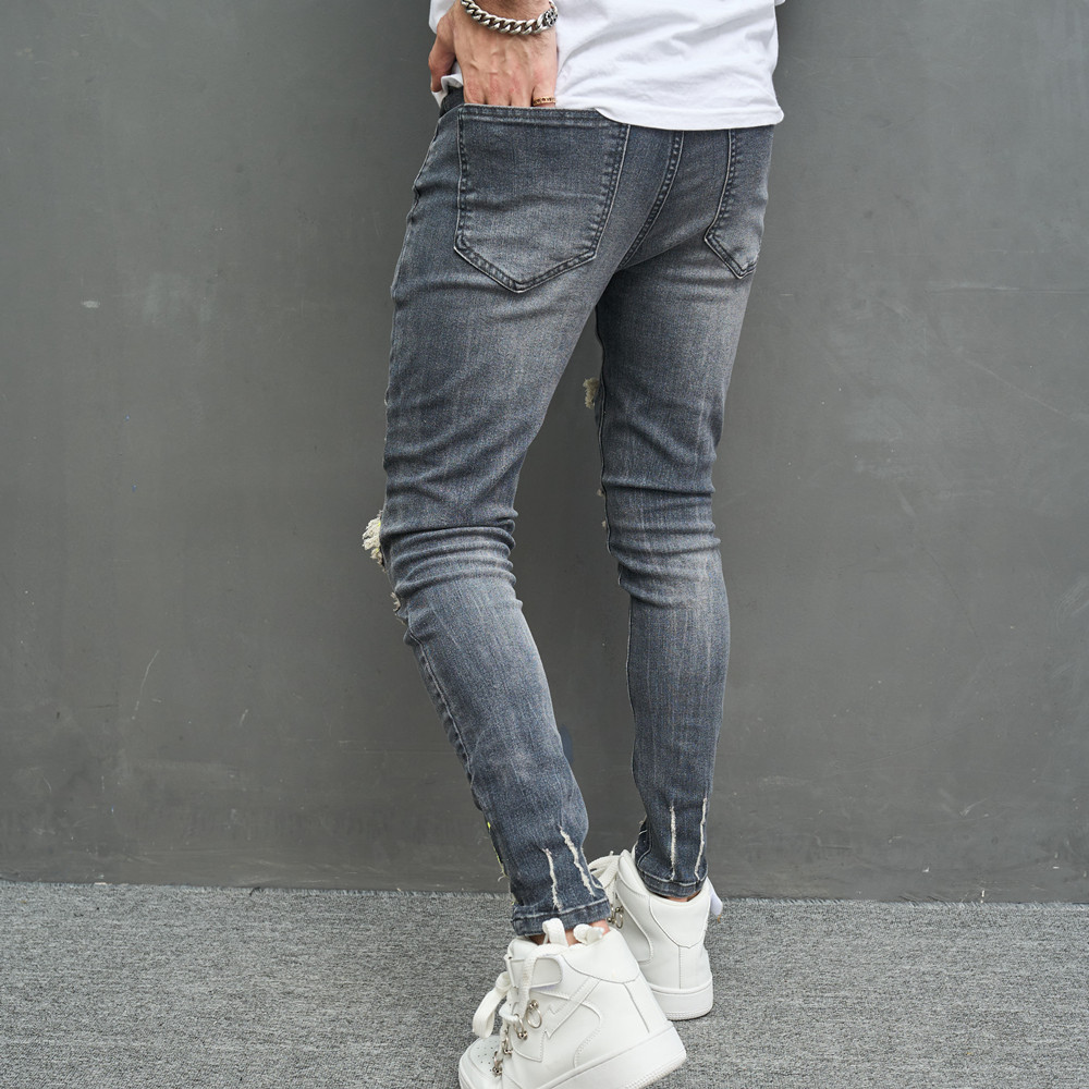 2023 대외 무역 유럽과 미국 새로운 남성 청바지 무릎 착용 탄성 캐주얼 발 슬림 남성 바지 패션