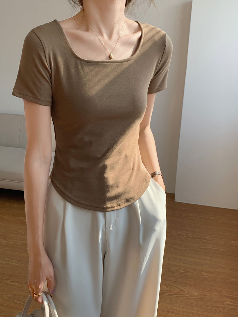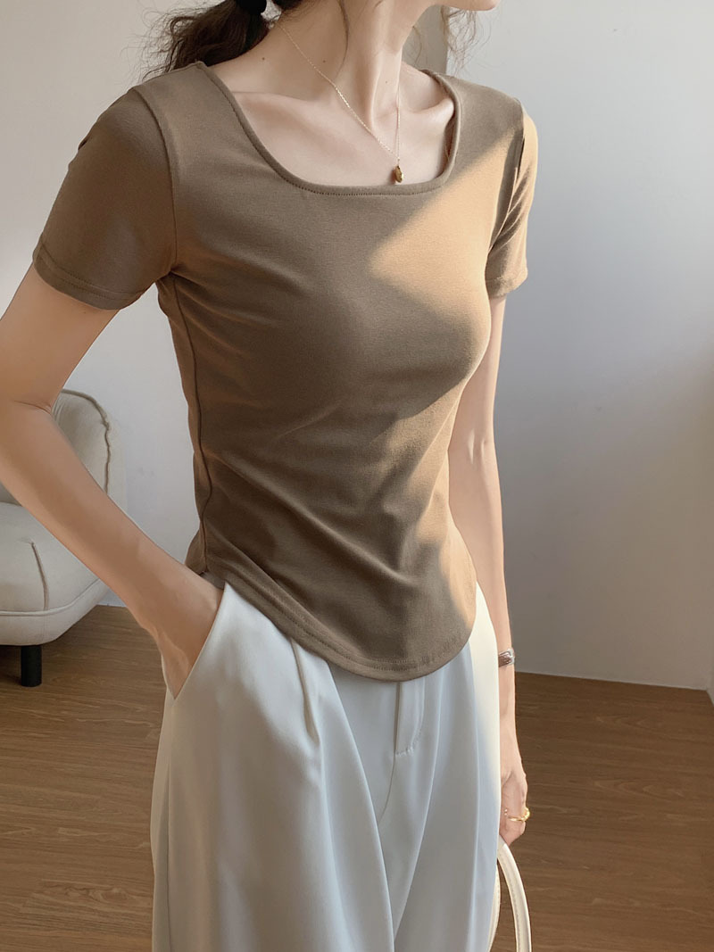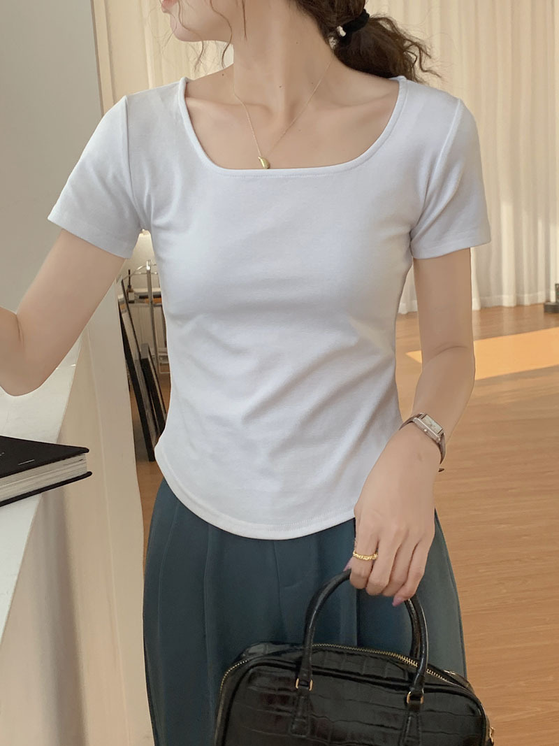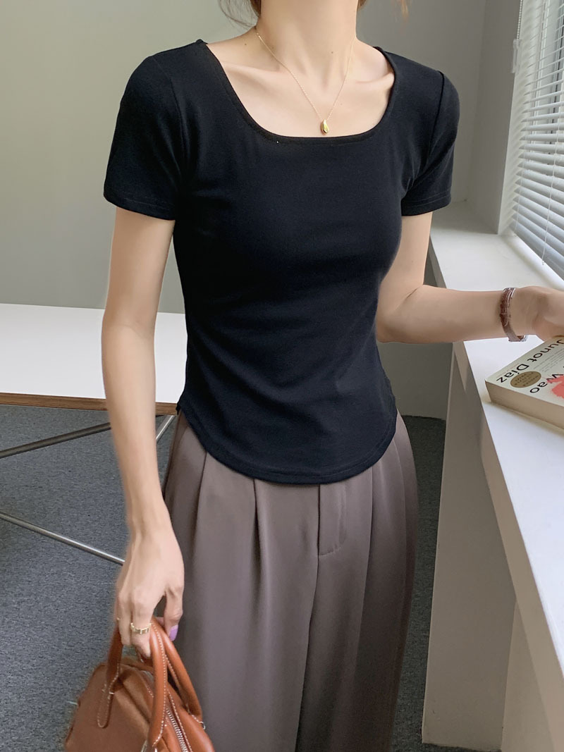 260g 선택 순수 코튼 티셔츠 여성 여름 반팔 2025 새로운 불규칙한 곡선 슬림 슬림 U 넥 바닥 탑스토어 가기