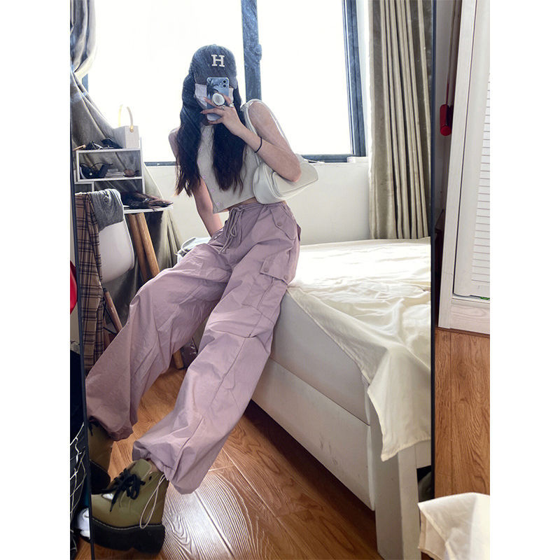 미국식 핑크 드로스트링 러쉬 팬츠 여성용 트렌디 브랜드 하이 스트리트 스파이스 소녀의 작업복 느슨한 슬리밍 스포츠 다리 바지스토어 가기