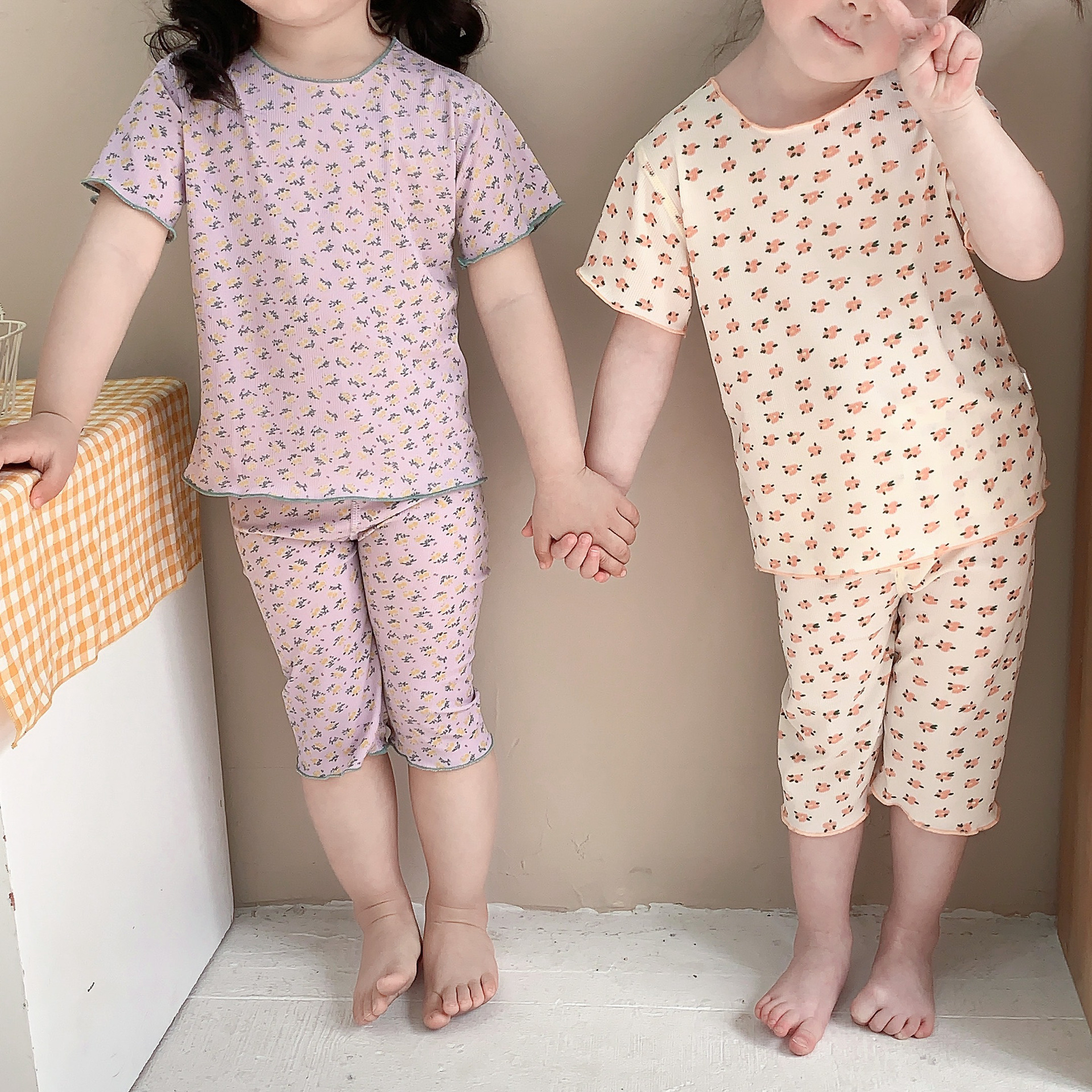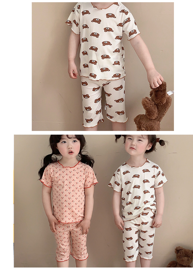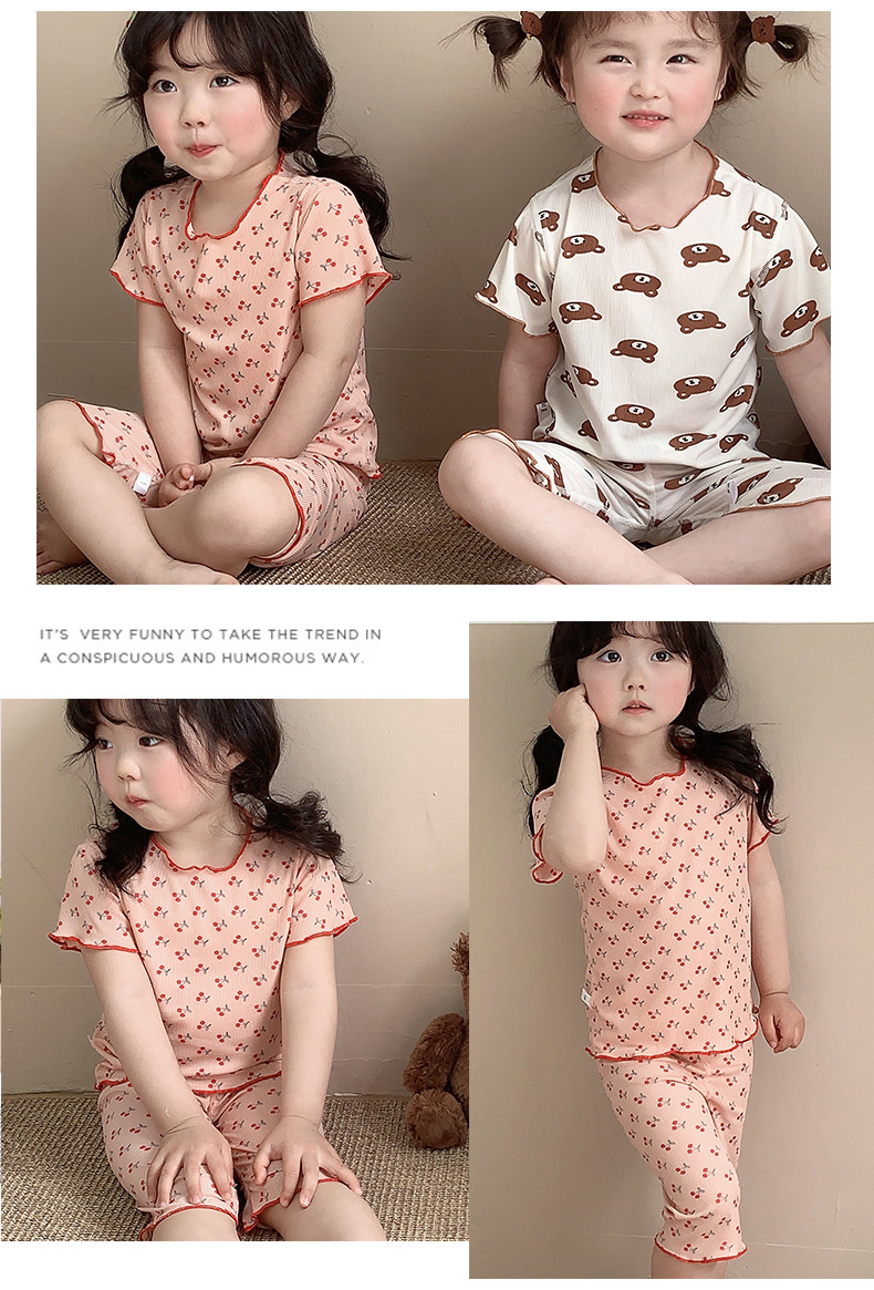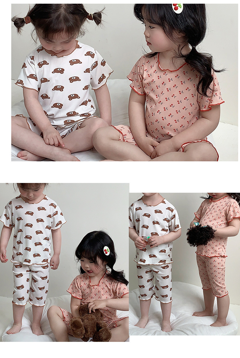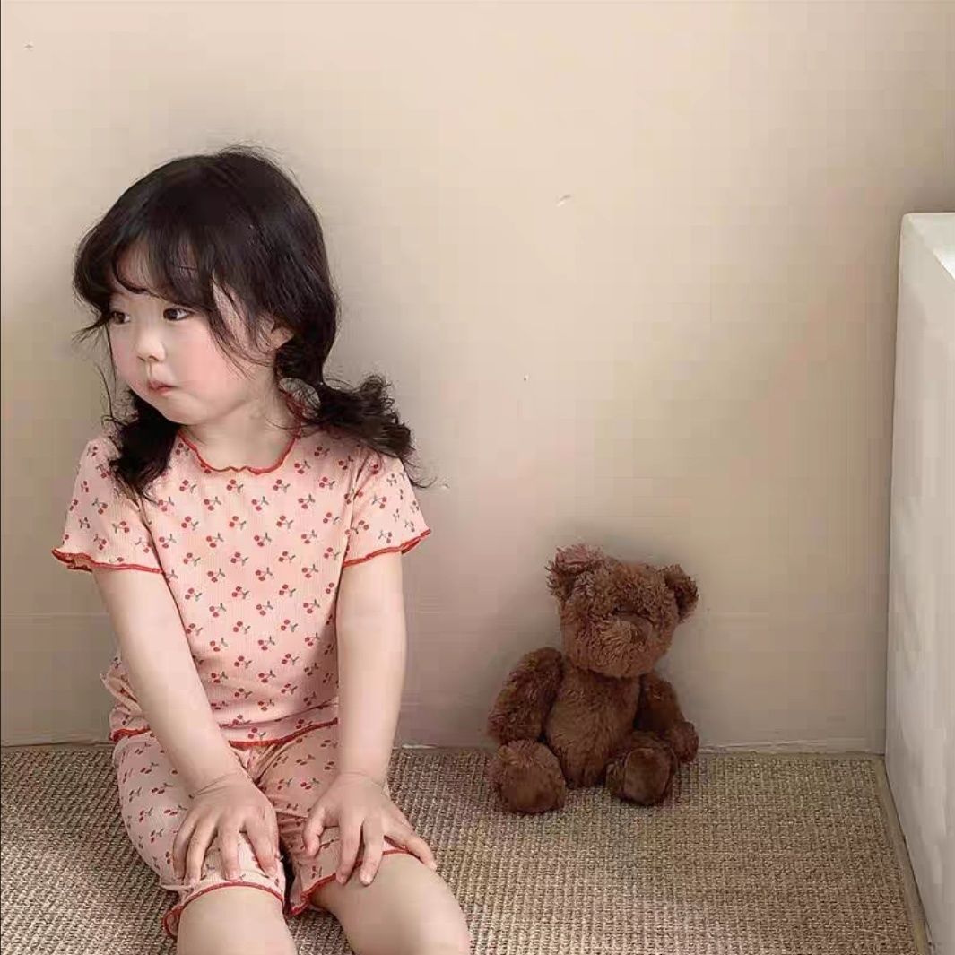어린이 뼈없는 가정복 세트 여아 여름 아이스 실크 작은 꽃 반팔 크롭 바지 아기 잠옷 에어컨 옷스토어 가기