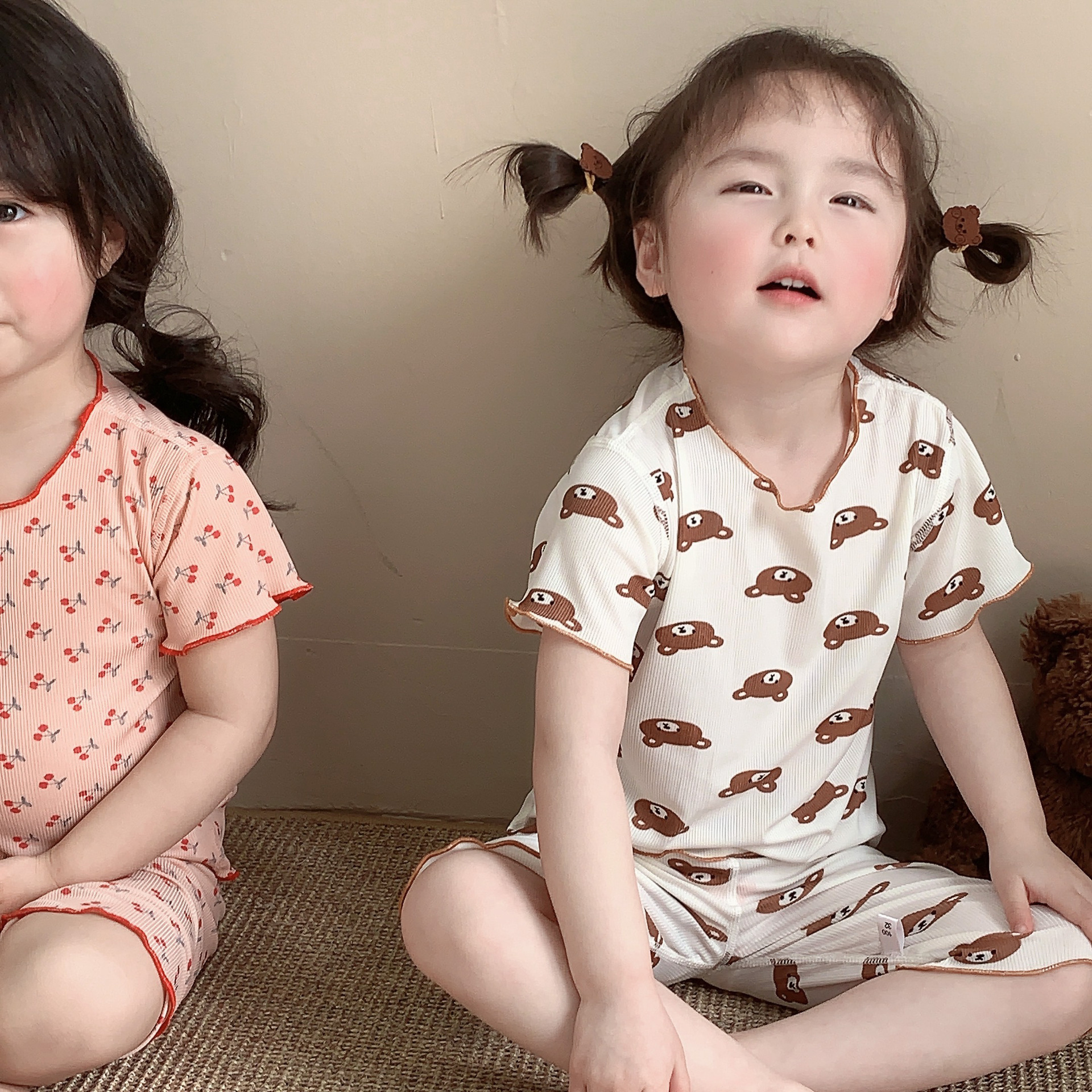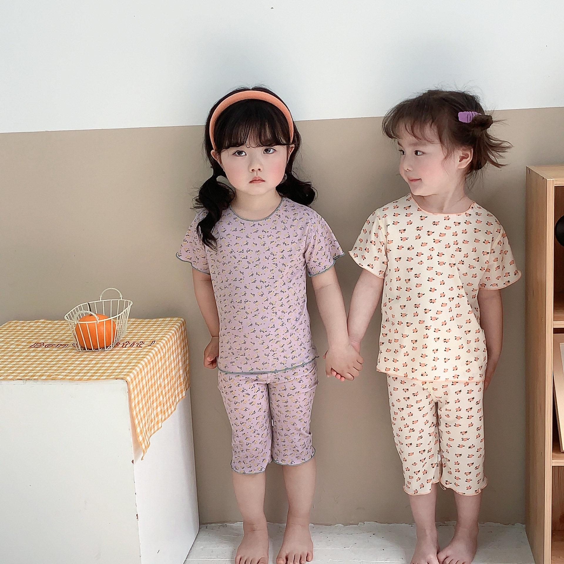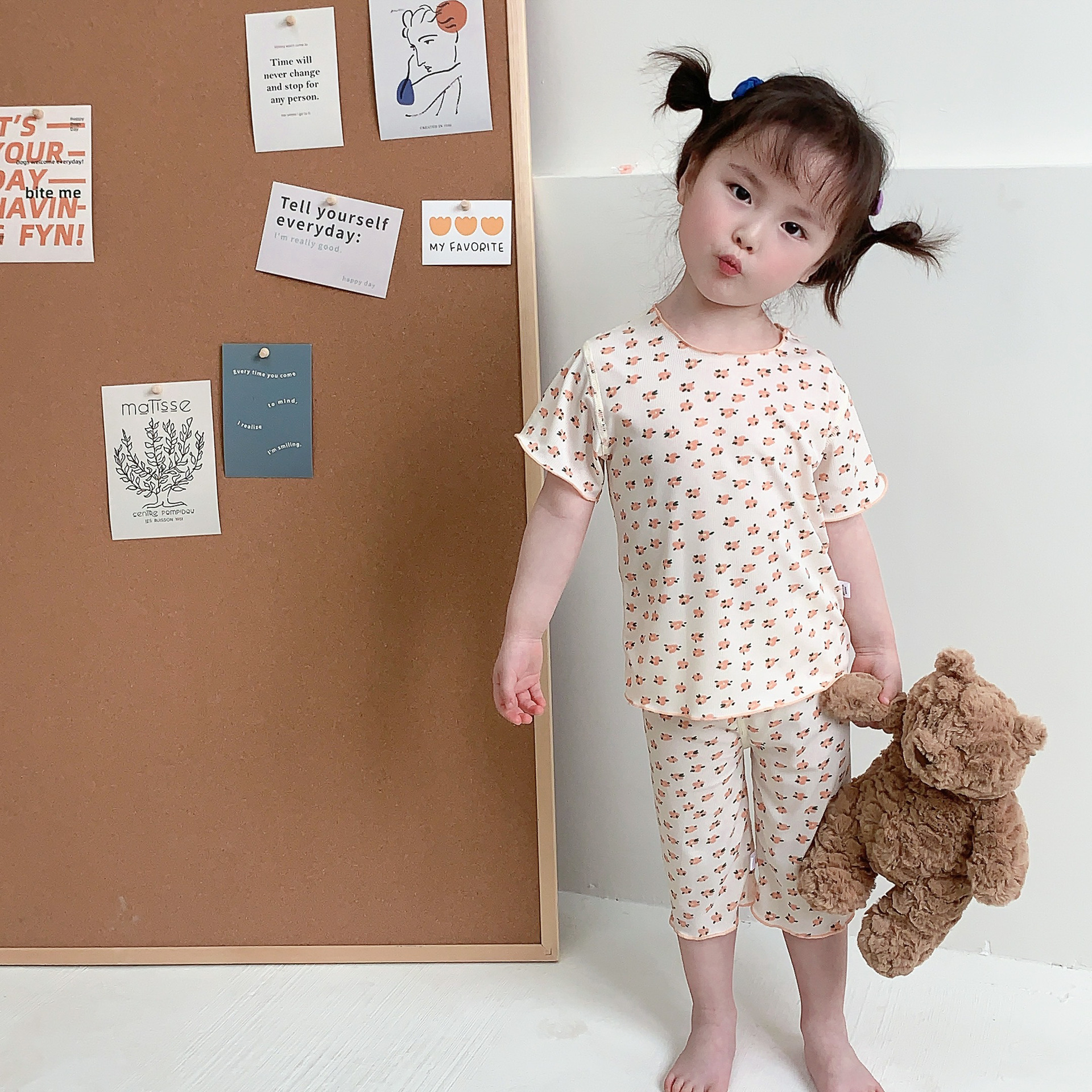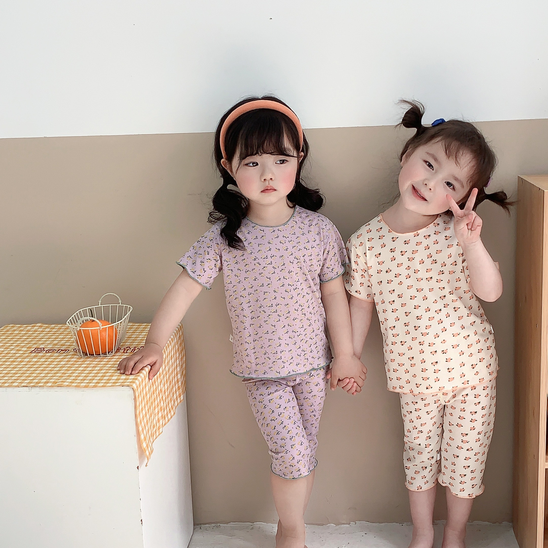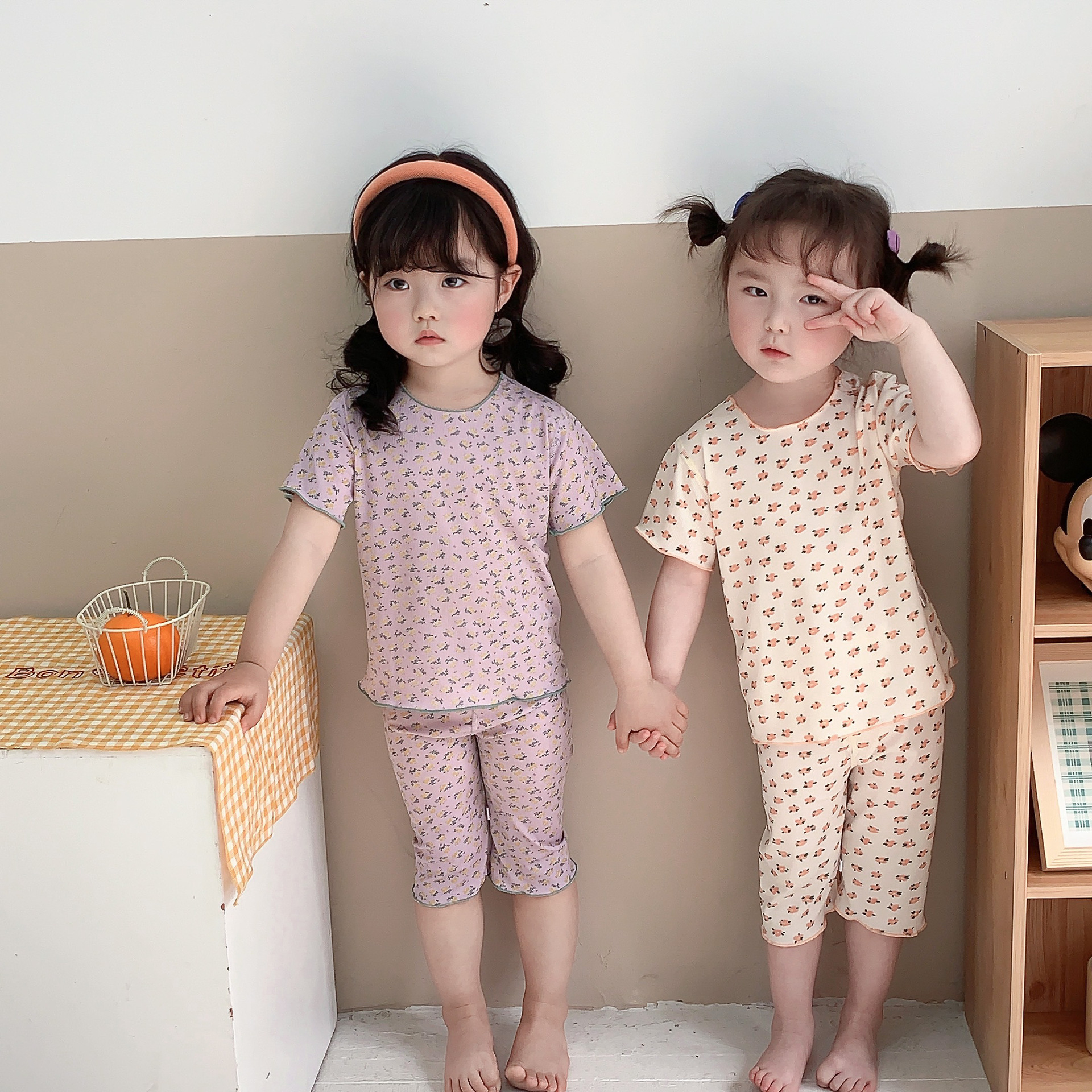 어린이 뼈없는 가정복 세트 여아 여름 아이스 실크 작은 꽃 반팔 크롭 바지 아기 잠옷 에어컨 옷스토어 가기