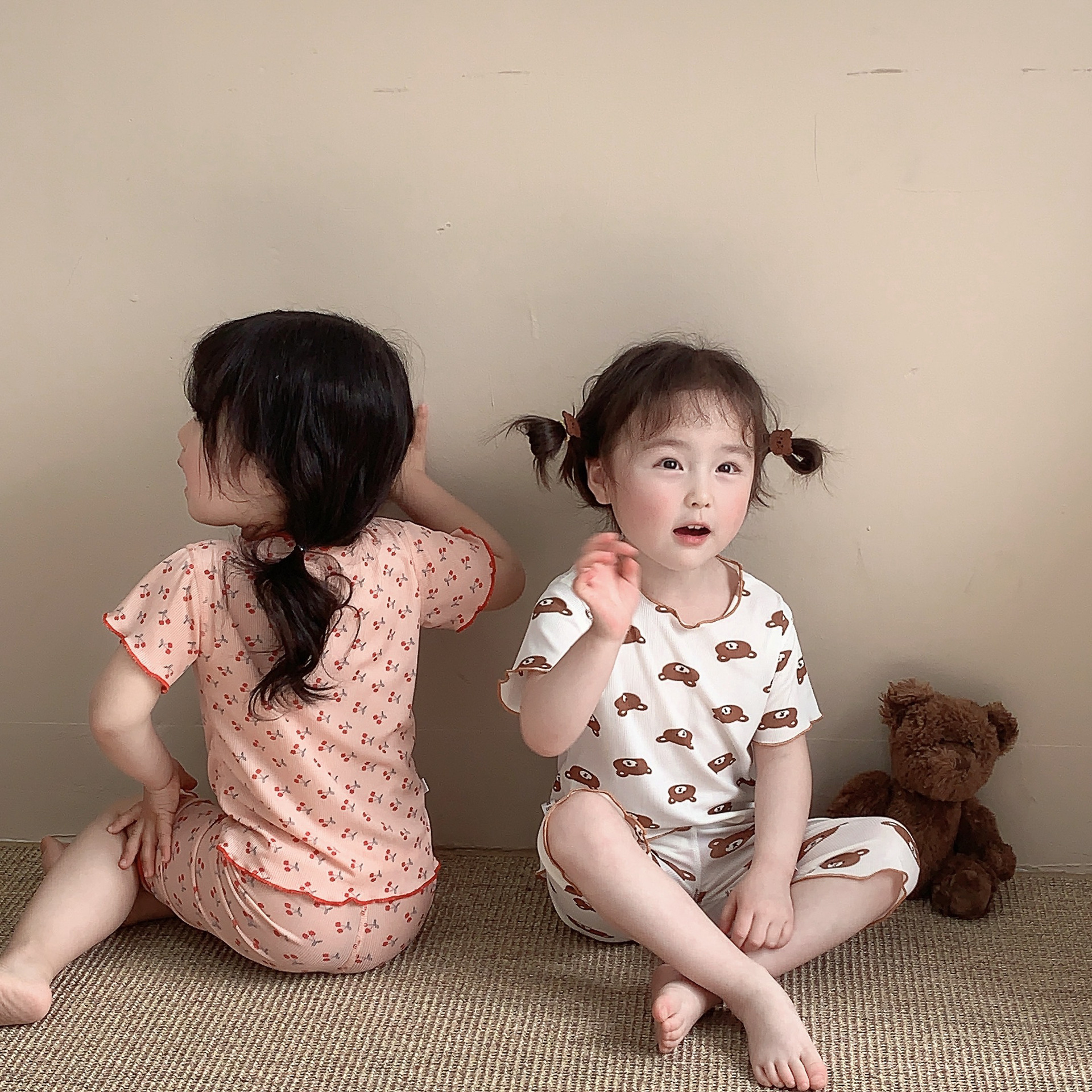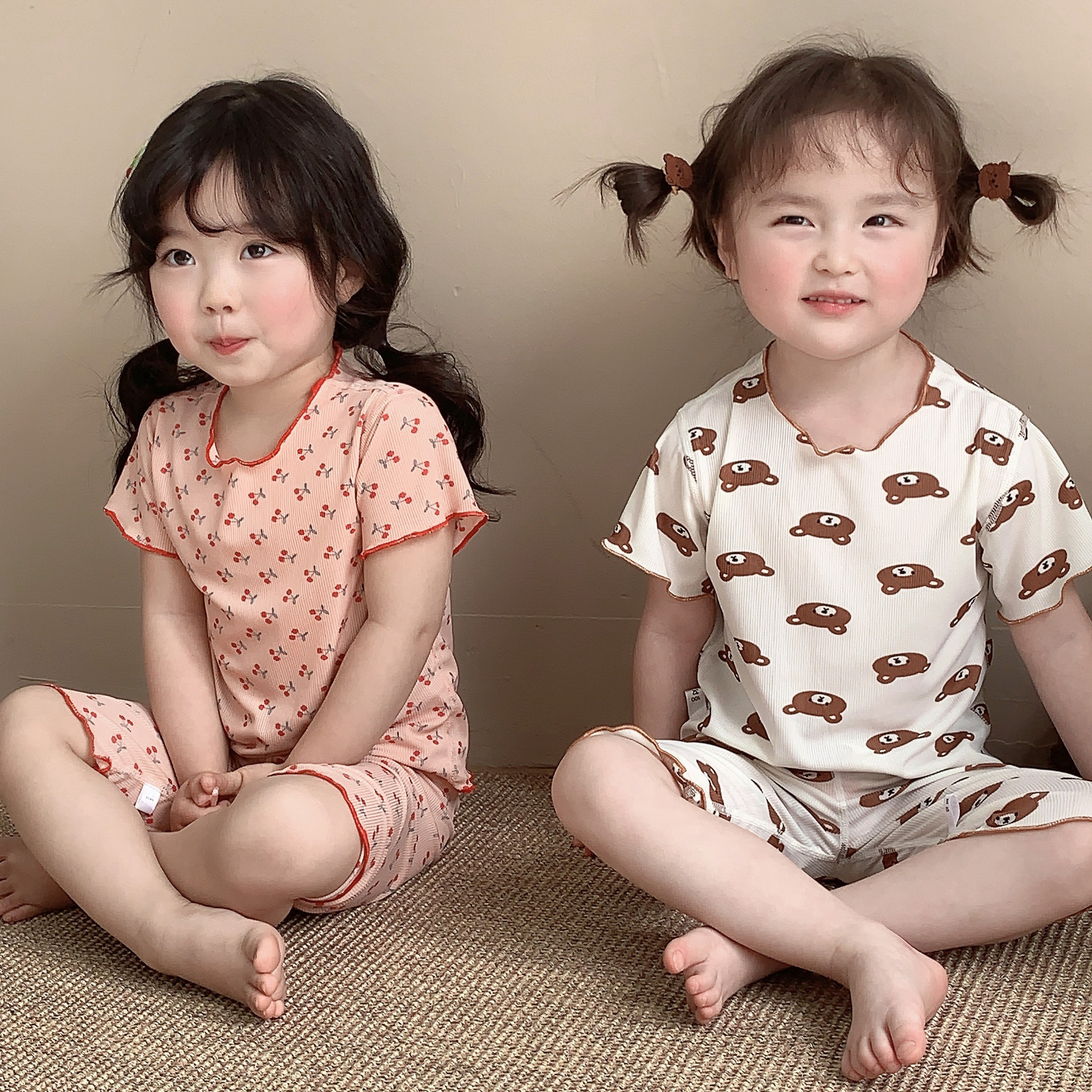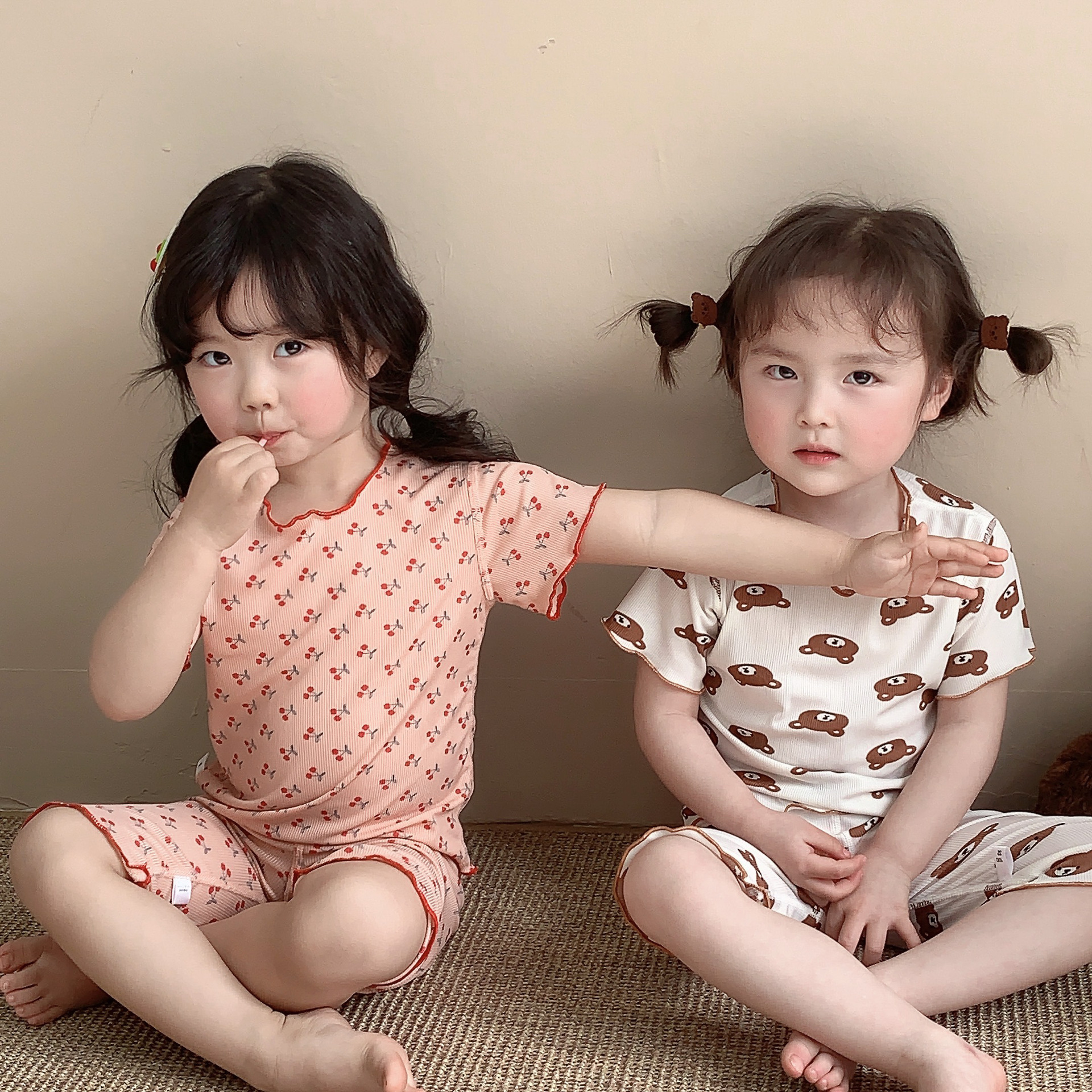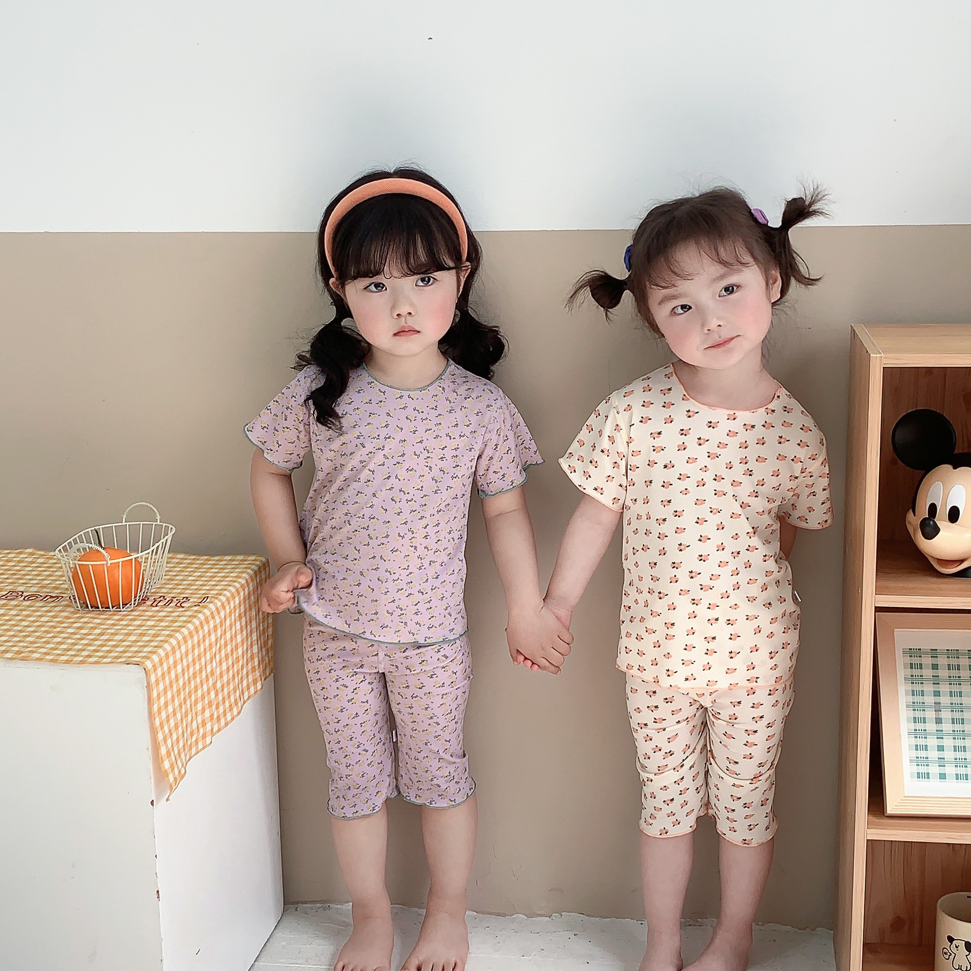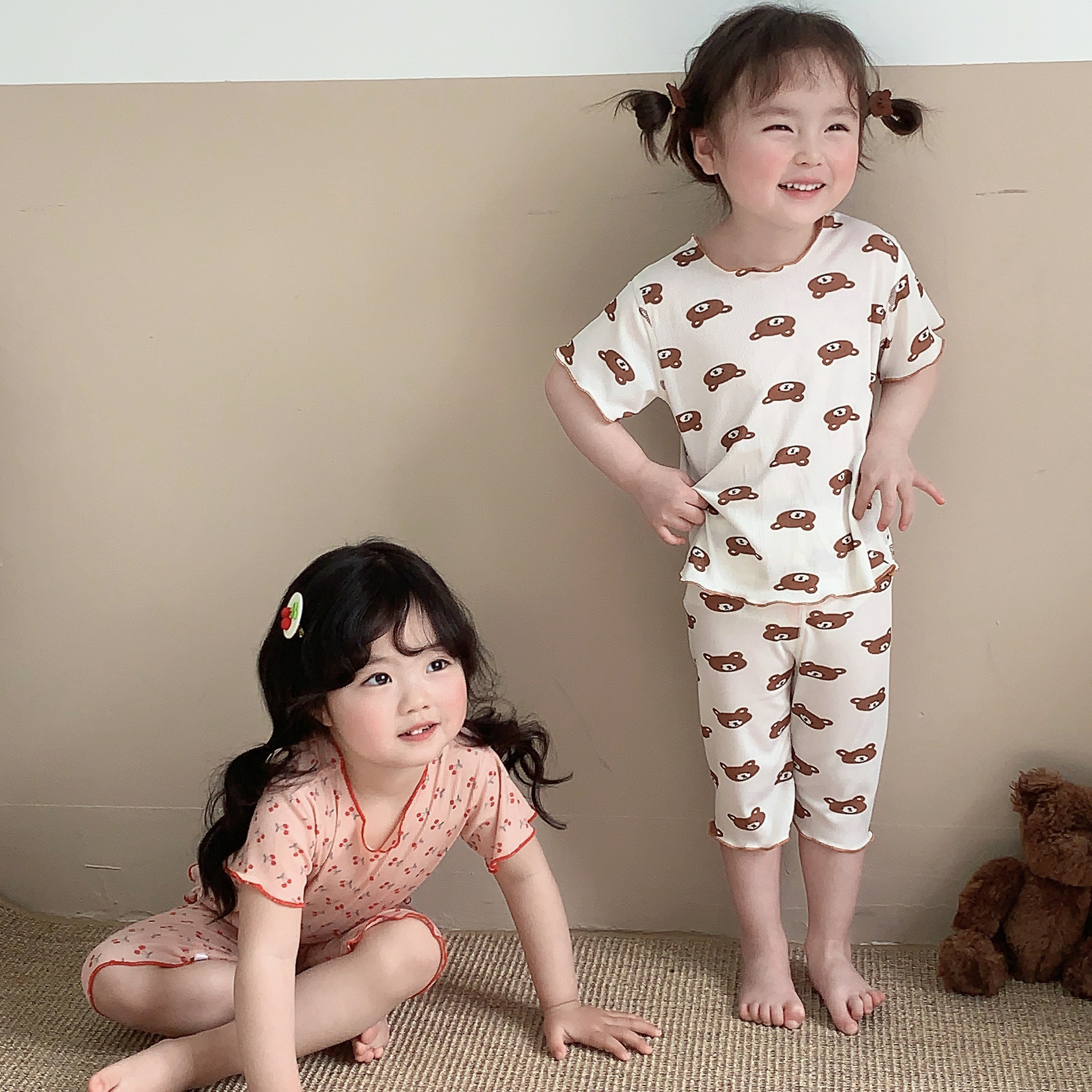 어린이 뼈없는 가정복 세트 여아 여름 아이스 실크 작은 꽃 반팔 크롭 바지 아기 잠옷 에어컨 옷스토어 가기