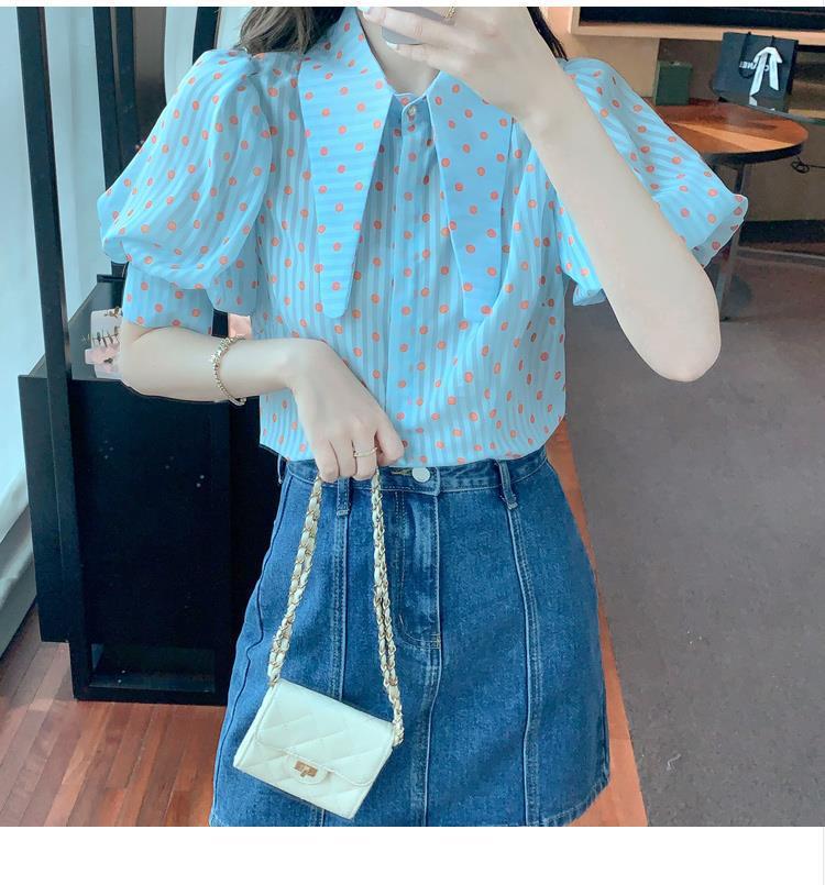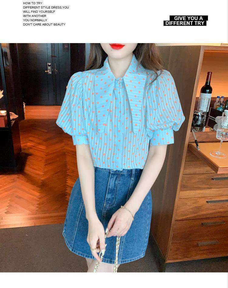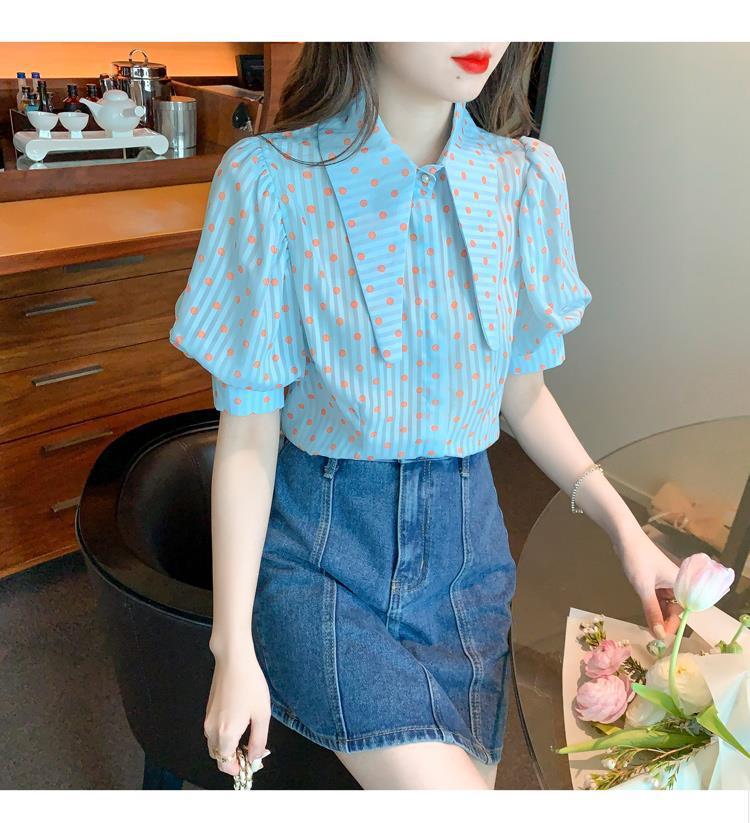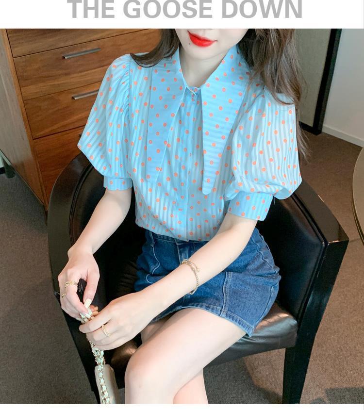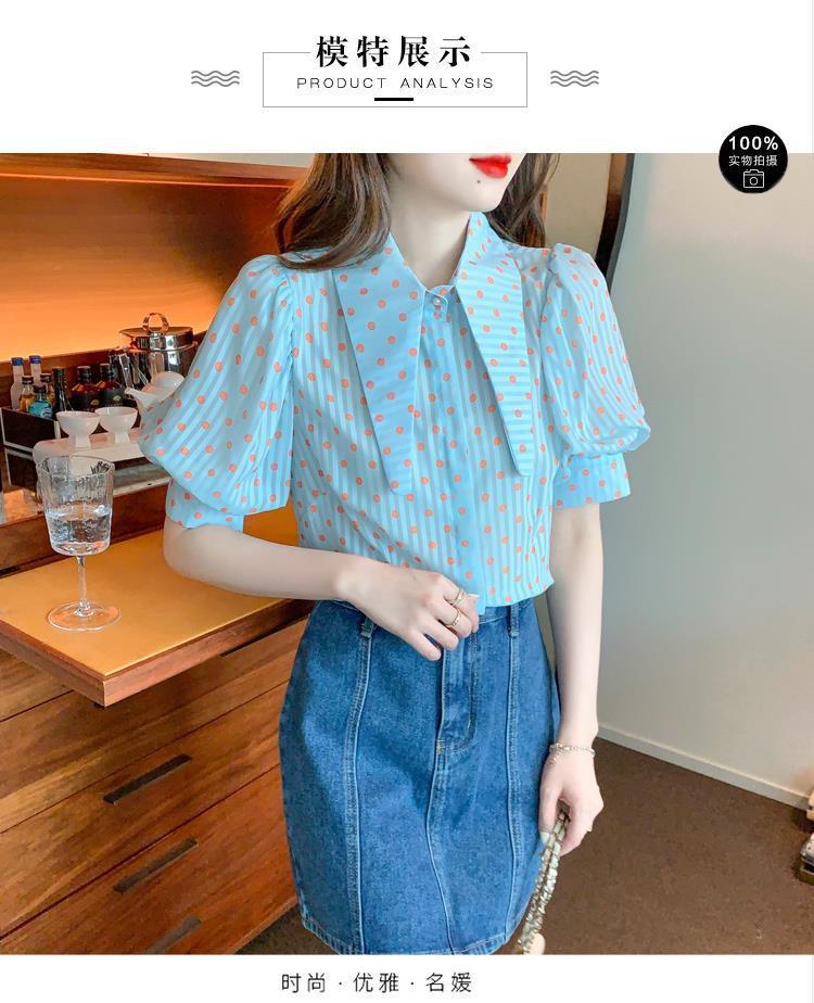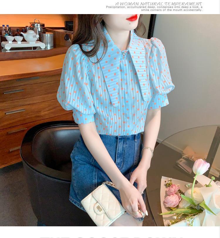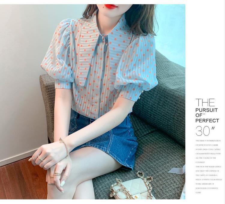 프렌치 레트로 랜턴 슬리브 셔츠 여성용 반팔 여름 디자인 감각 틈새 달콤한 연령 감소 웨이브 도트 쉬폰 탑스토어 가기