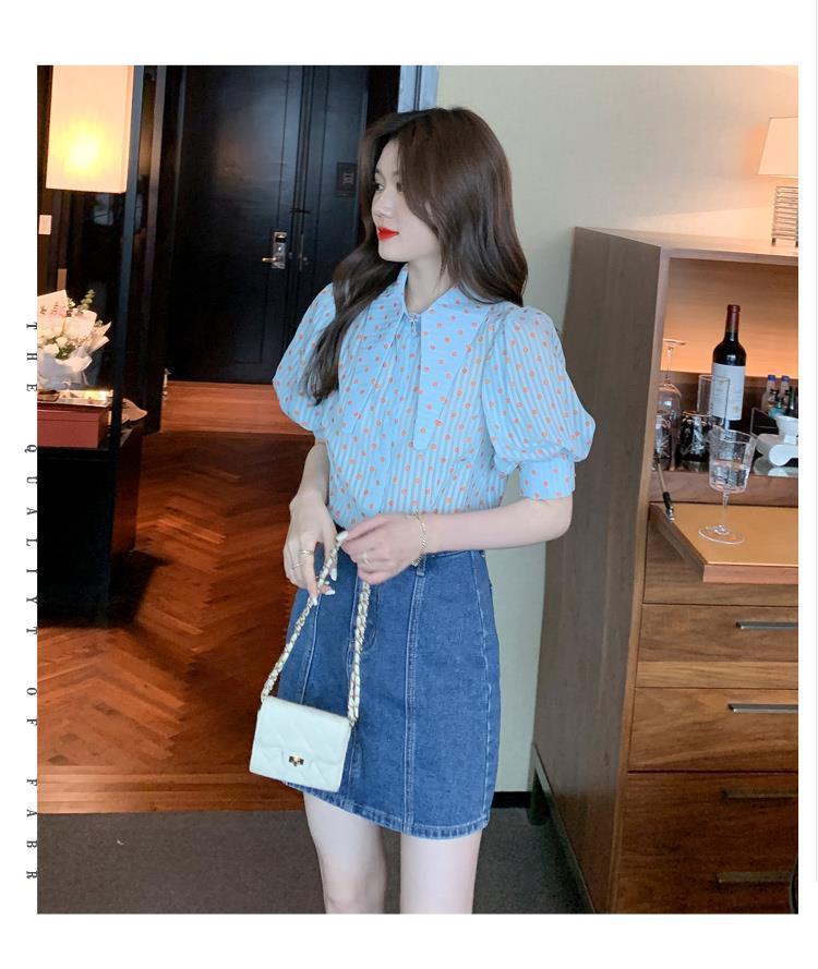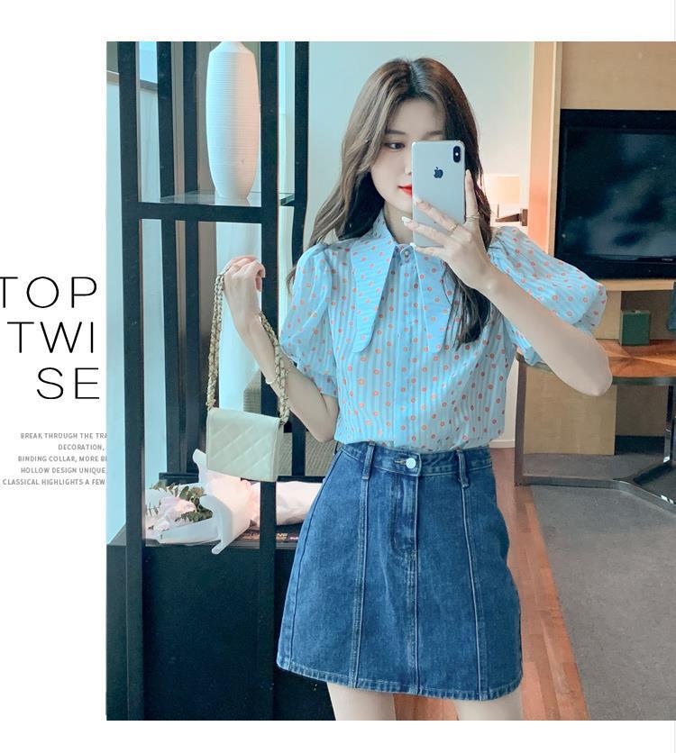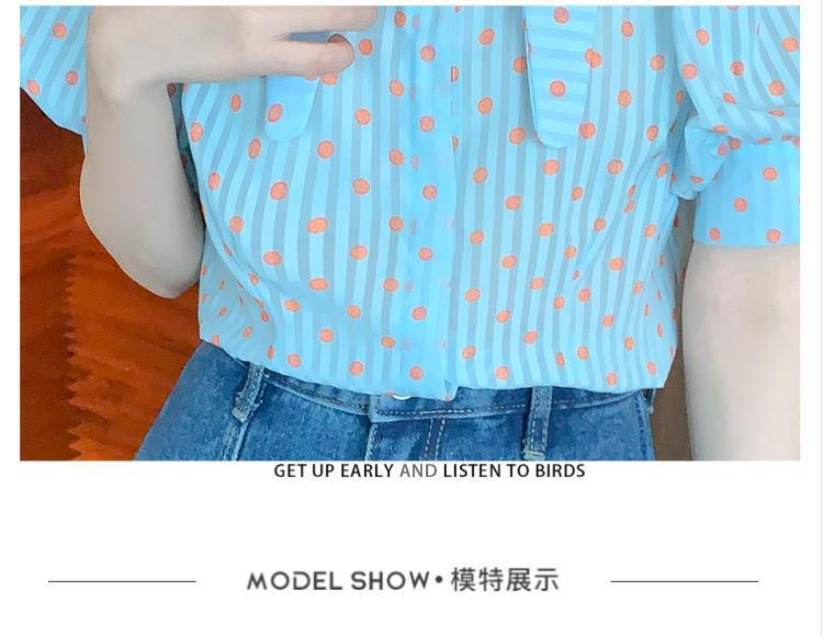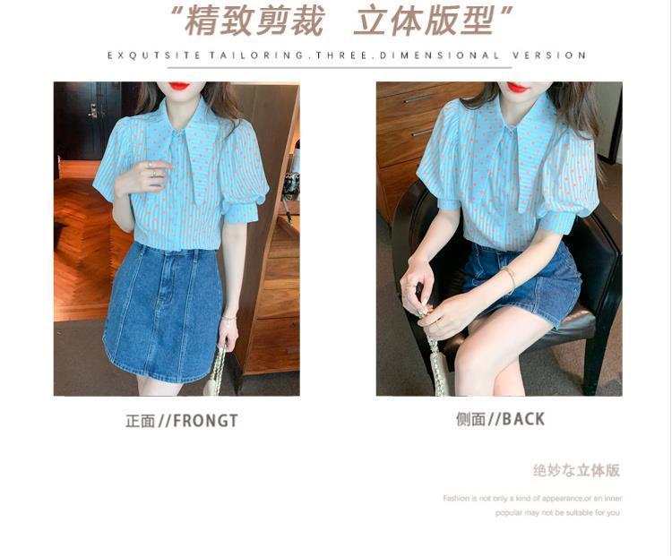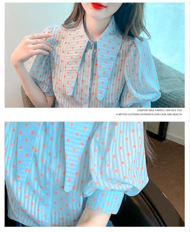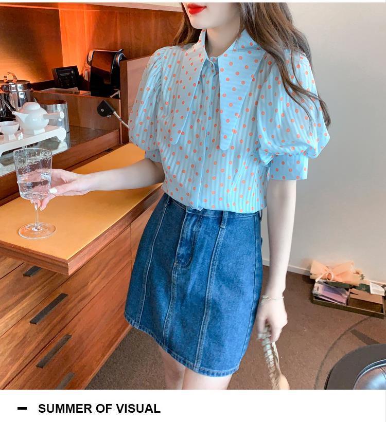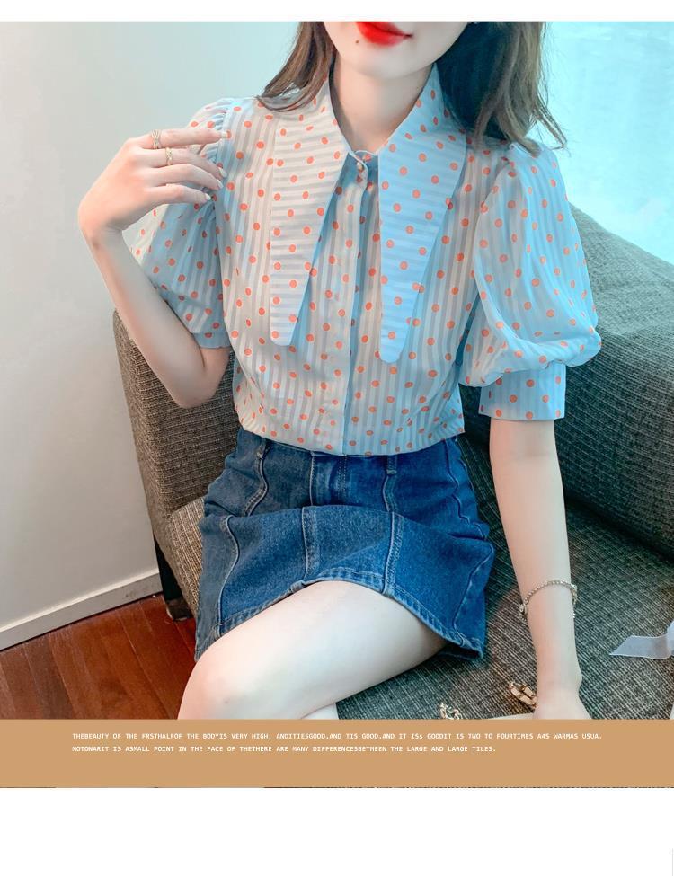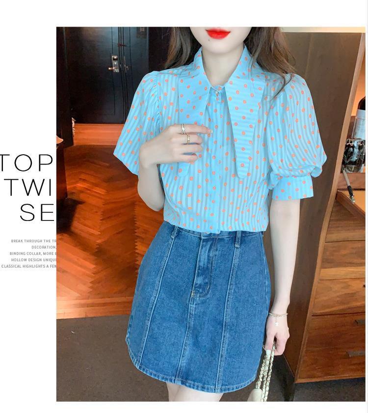 프렌치 레트로 랜턴 슬리브 셔츠 여성용 반팔 여름 디자인 감각 틈새 달콤한 연령 감소 웨이브 도트 쉬폰 탑스토어 가기