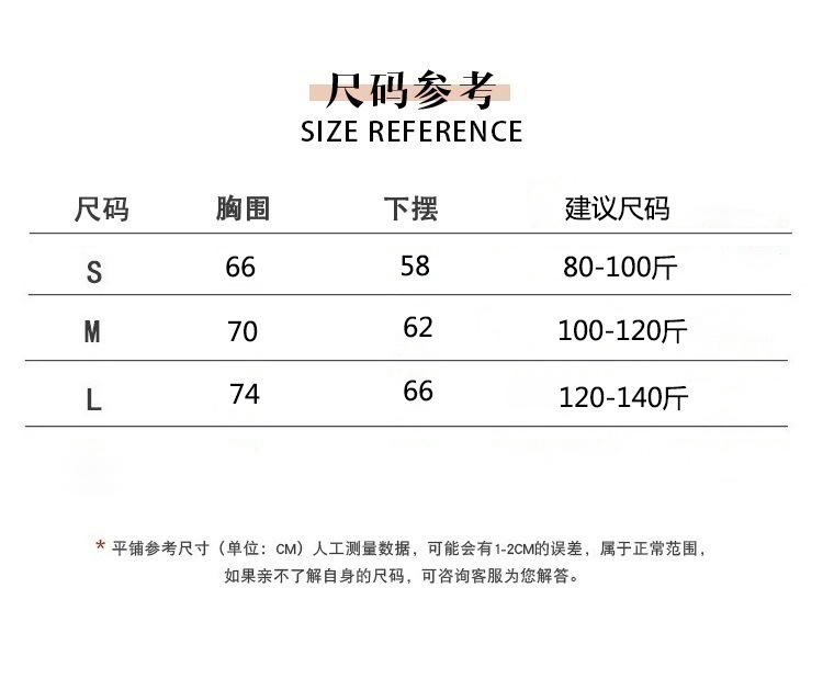 M码:胸围70cm 下摆62cm  建议100-120斤