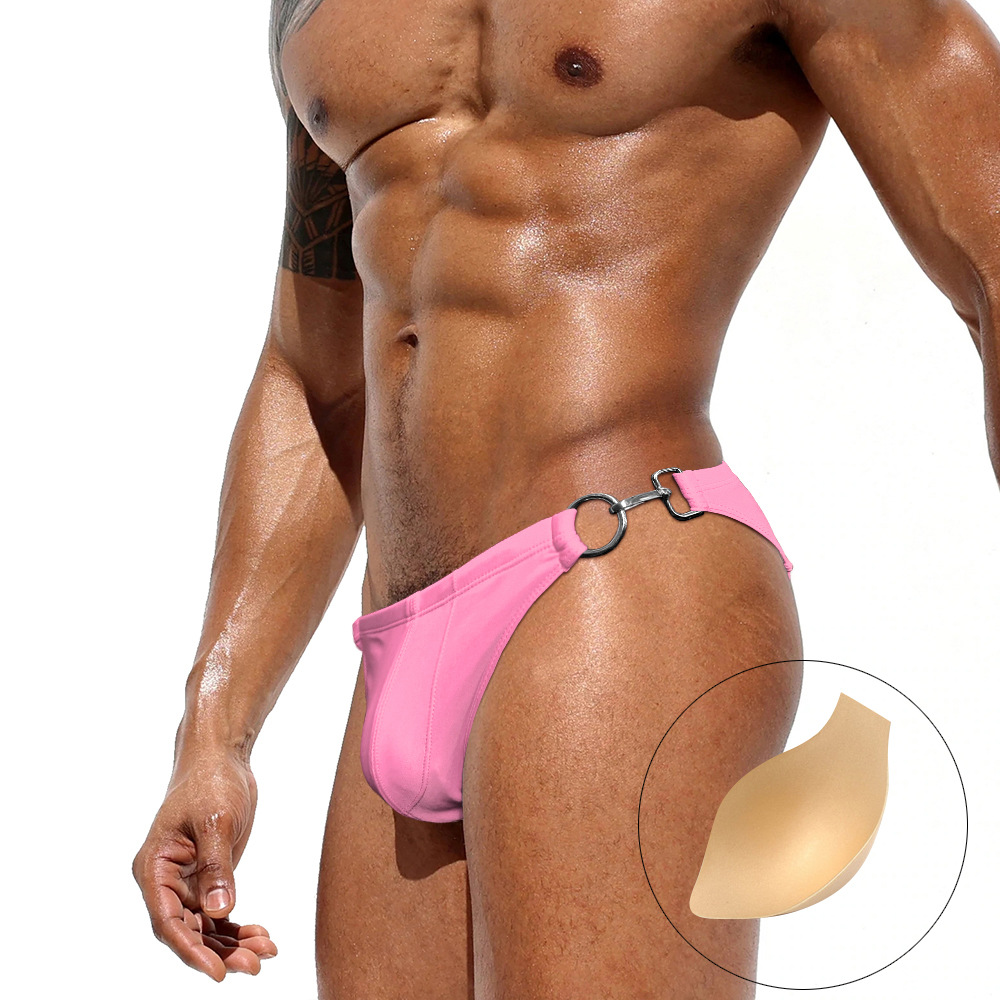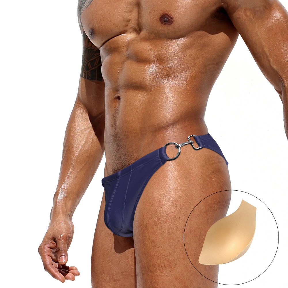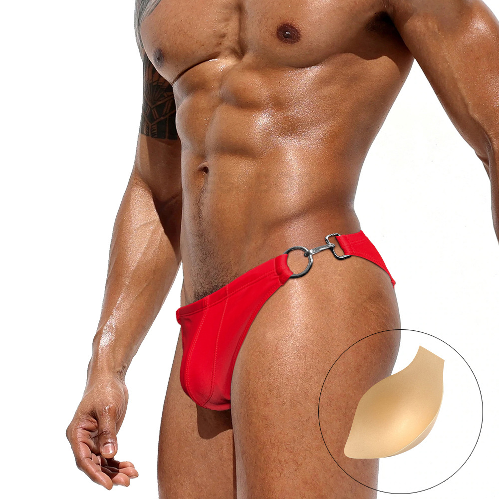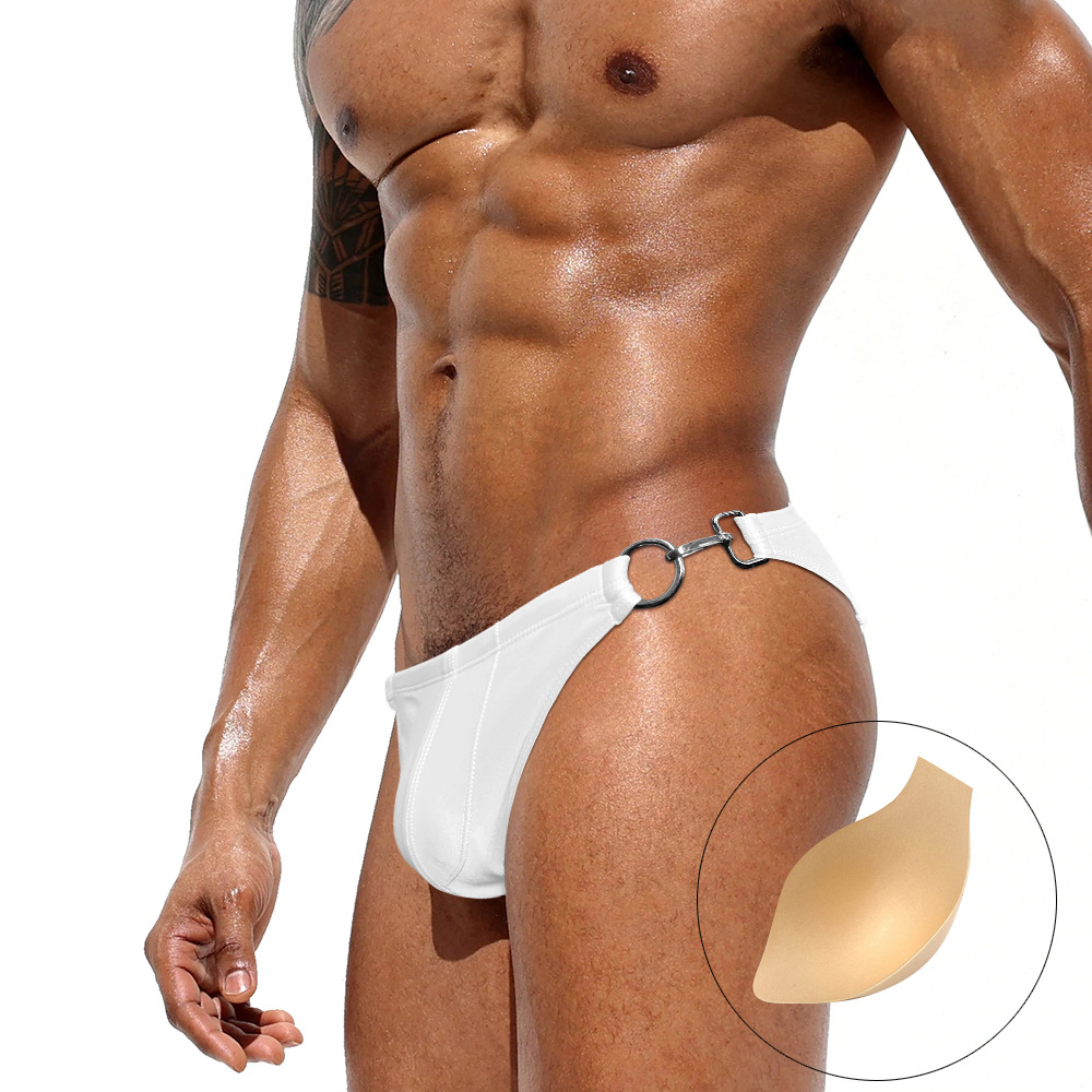 JESSBORN 남성용 메탈 버클 삼각 수영복 사이드 오픈 섹시한 단색 로우 웨이스트 수영복 특허
