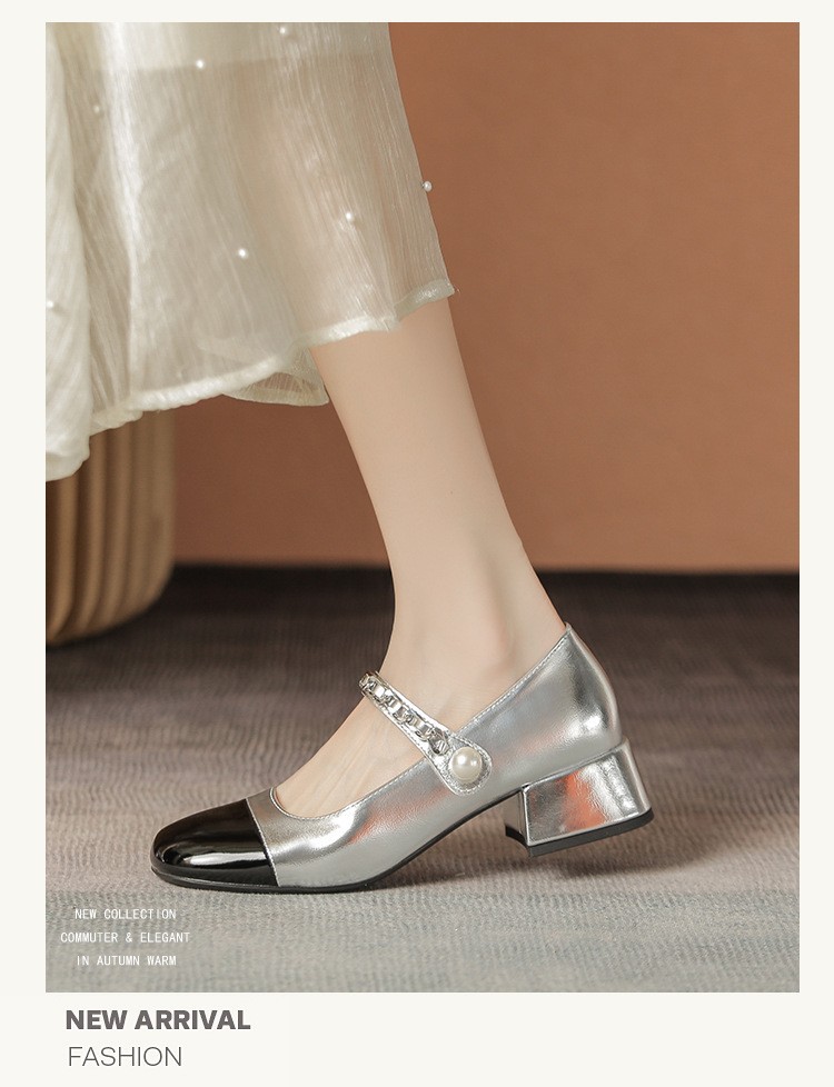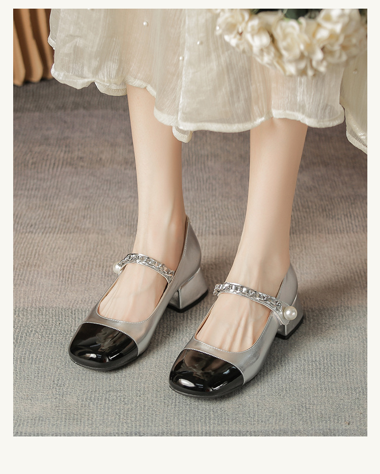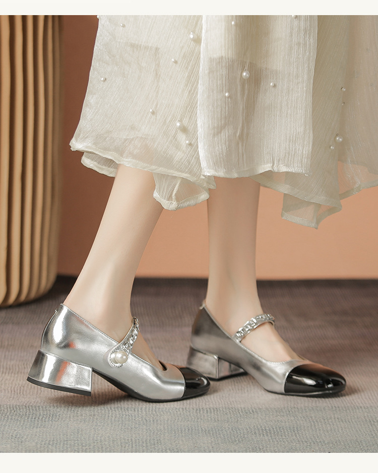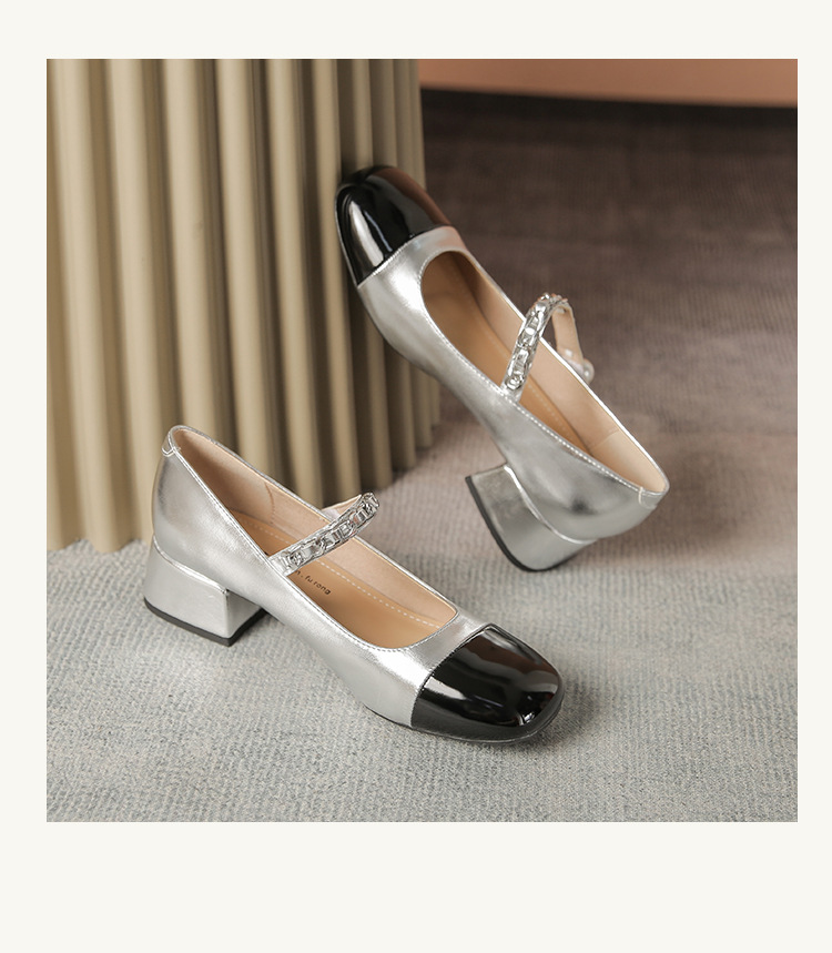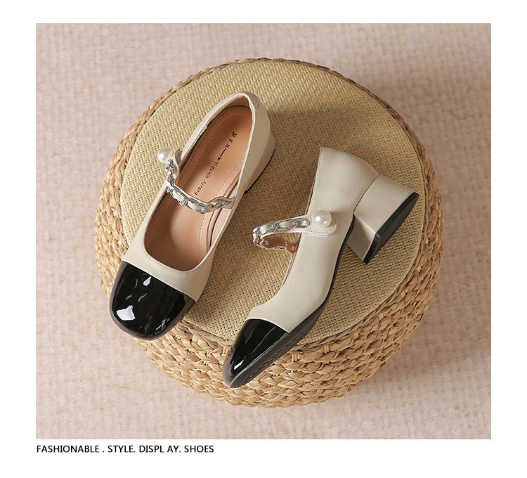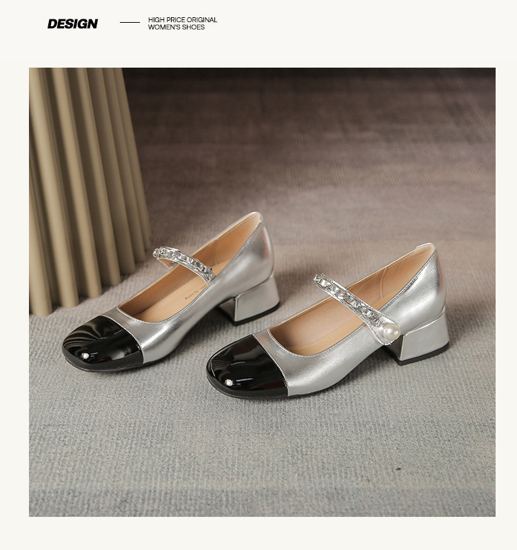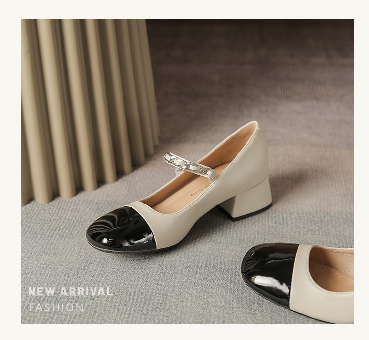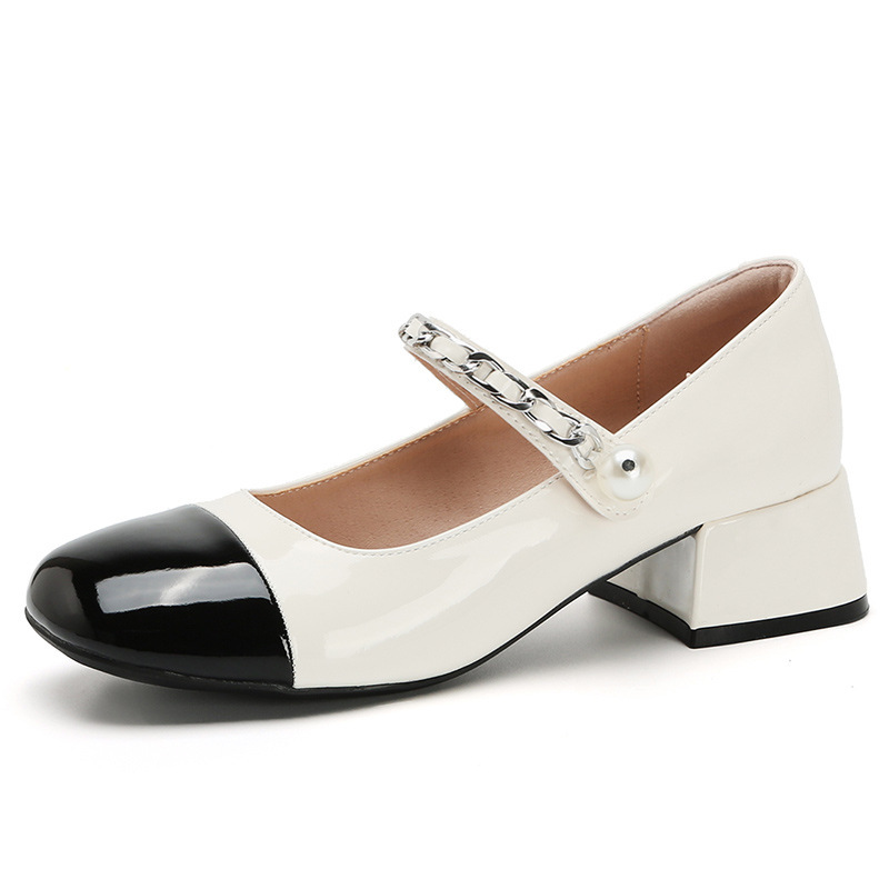 정품 가죽 프랑스 스타일 향기로운 스타일 3cm 피곤하지 않은 발 레이디 미드 힐 싱글 레이어 신발 흑백 컬러 블록 스퀘어 헤드 메리 제인 신발