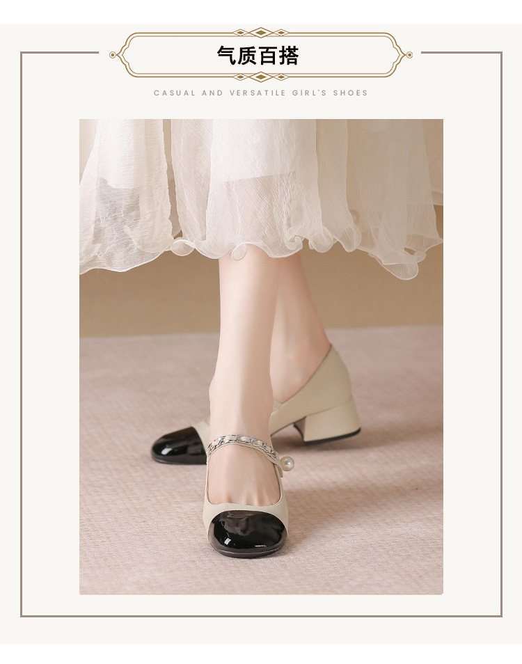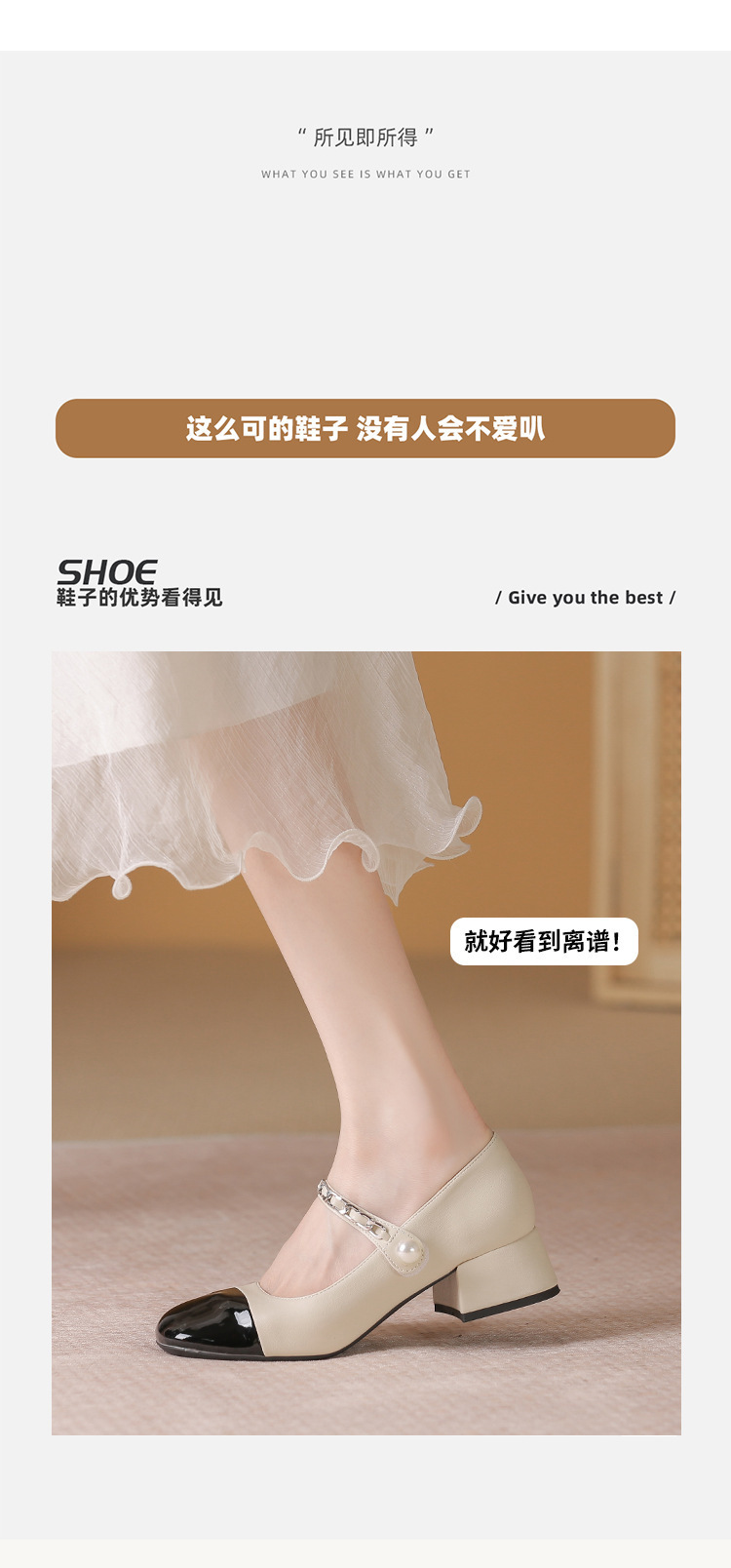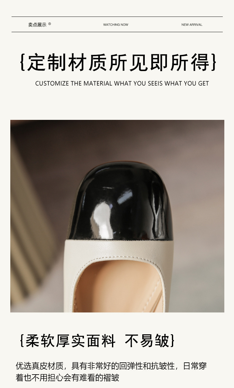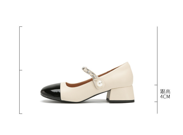 정품 가죽 프랑스 스타일 향기로운 스타일 3cm 피곤하지 않은 발 레이디 미드 힐 싱글 레이어 신발 흑백 컬러 블록 스퀘어 헤드 메리 제인 신발스토어 가기