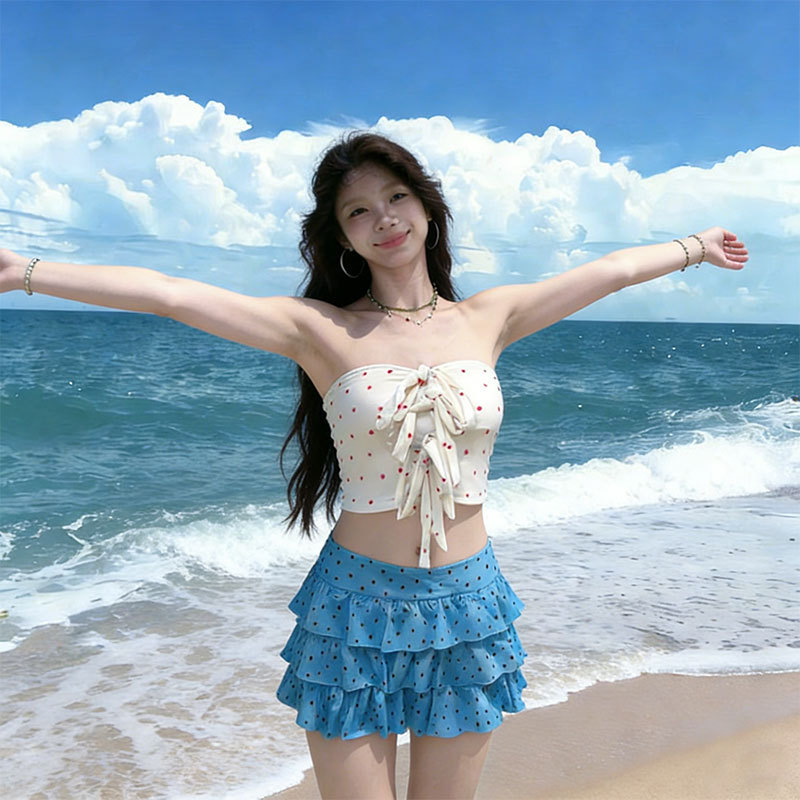 대비색상 물방울무늬 스플릿 수영복, 튜브탑 스트랩 + 멀티 레이어 케이크 스커트, 여성용 휴가 해변 수영복, 재고 있음