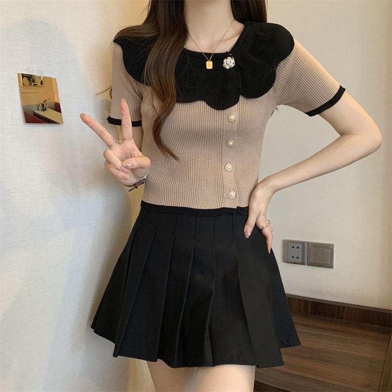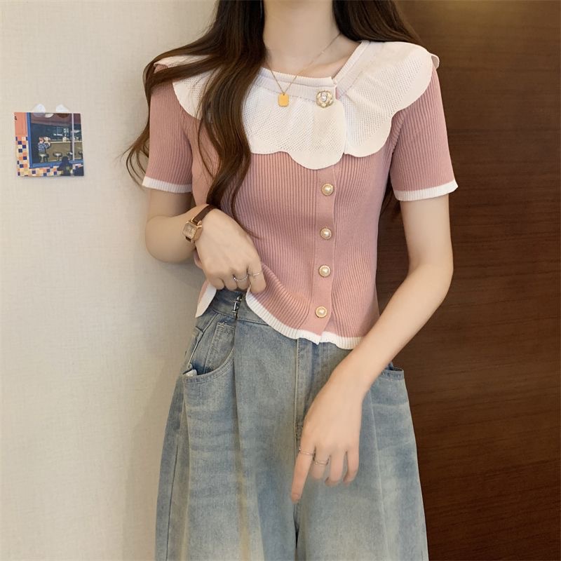 대비 레이스 칼라 부드러운 반팔 스웨터 여성용 여름 새로운 얇은 슬림 핏 슬리밍 짧은 탑 여성용 셔츠스토어 가기