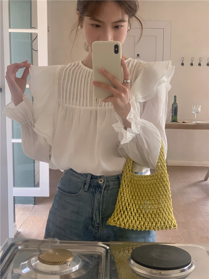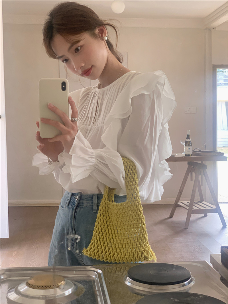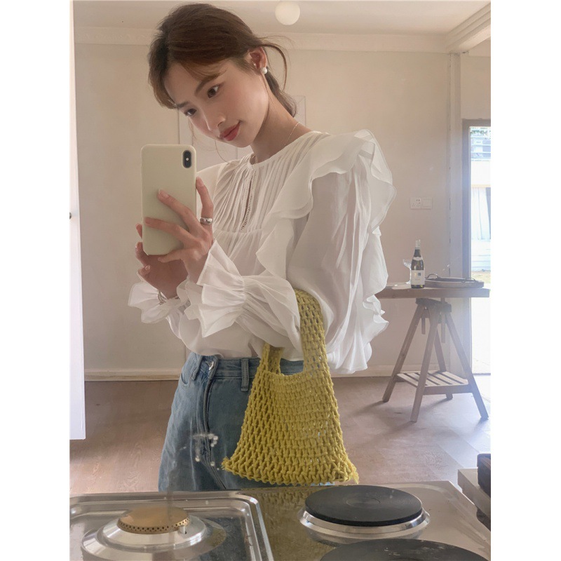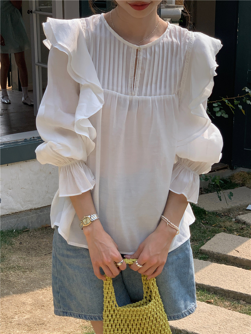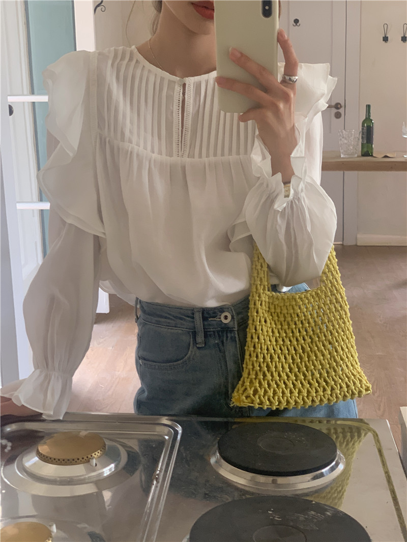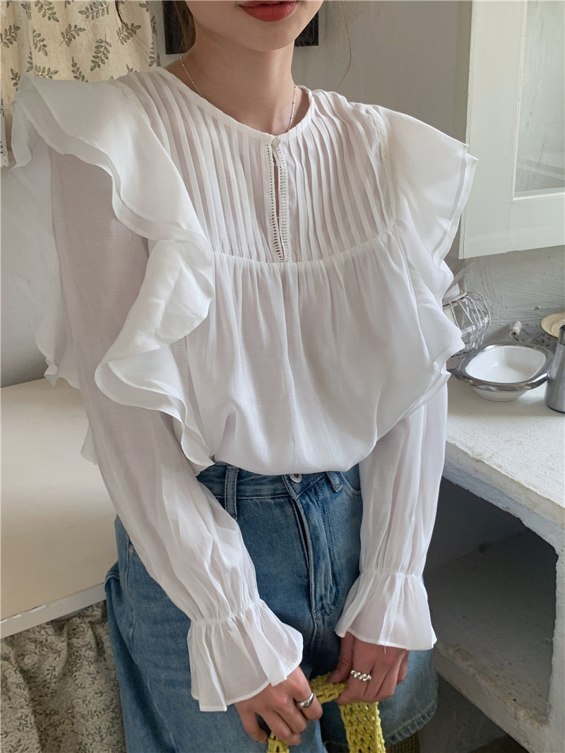 한국 세련된 여름 새로운 틈새 달콤한 모든 경기 러플 크루넥 풀오버 긴 소매 탑 쉬폰 셔츠 여성스토어 가기