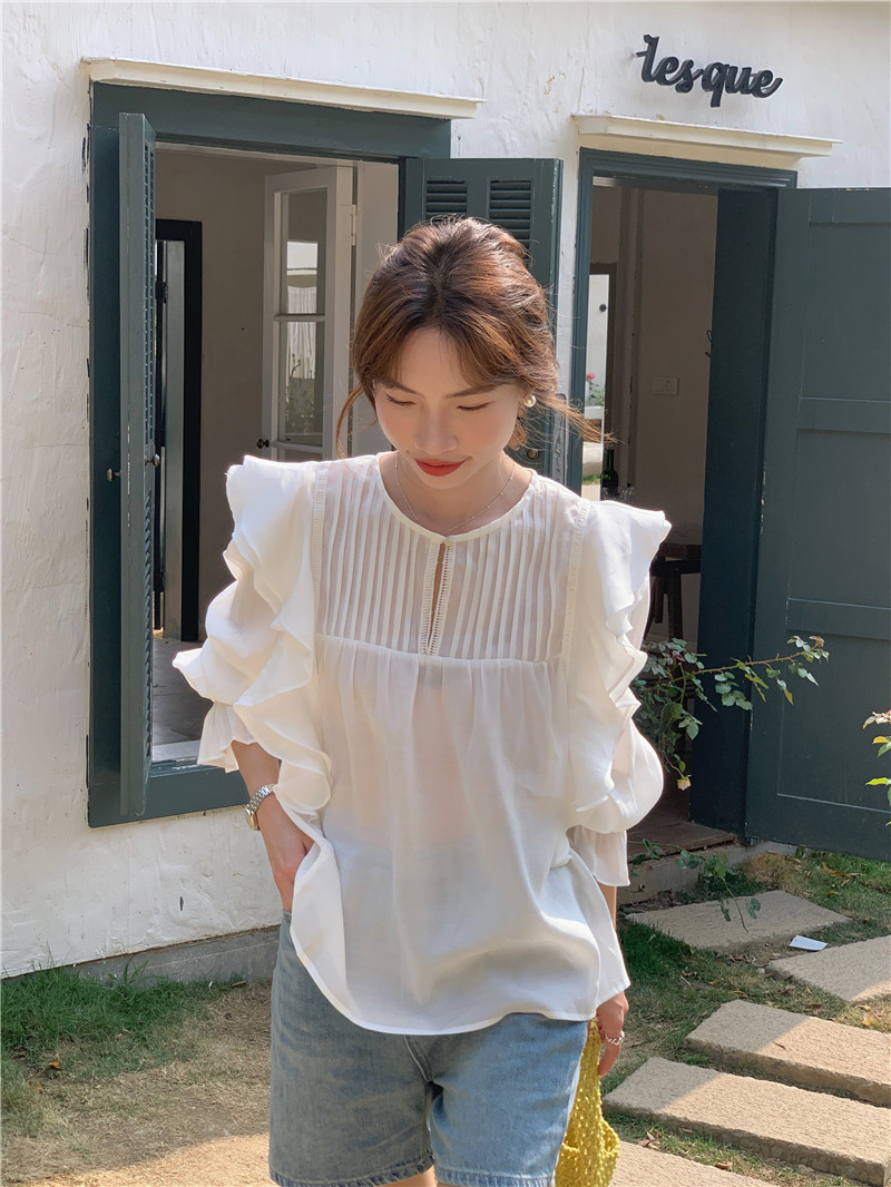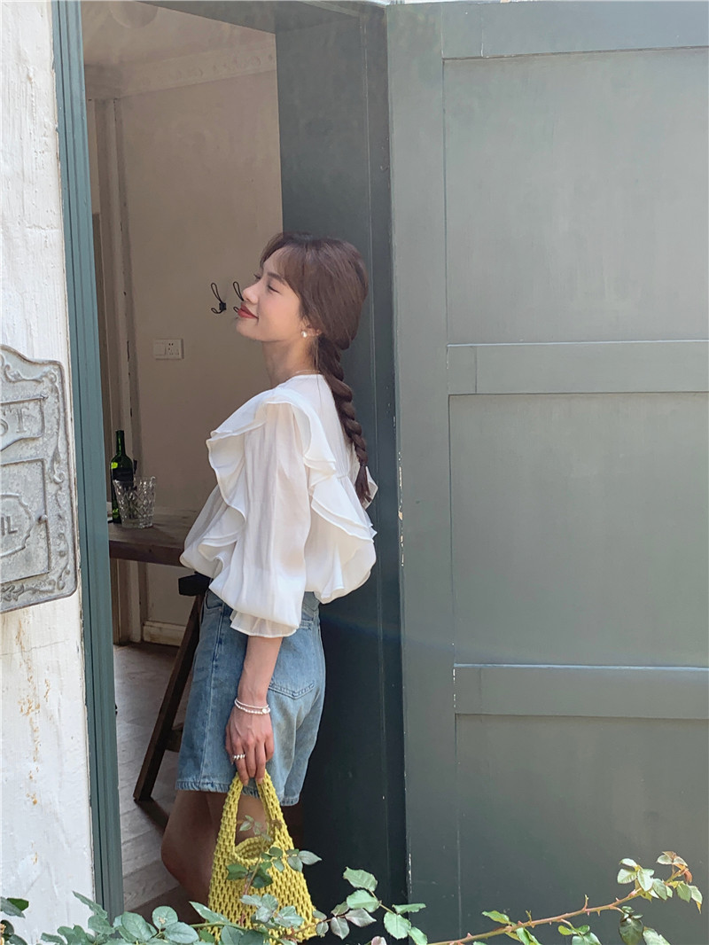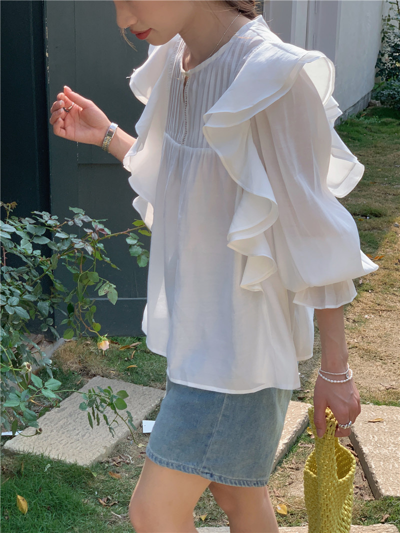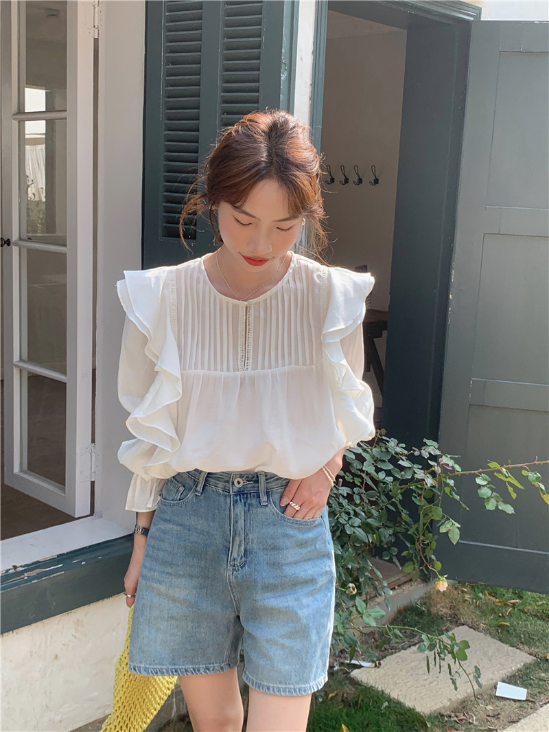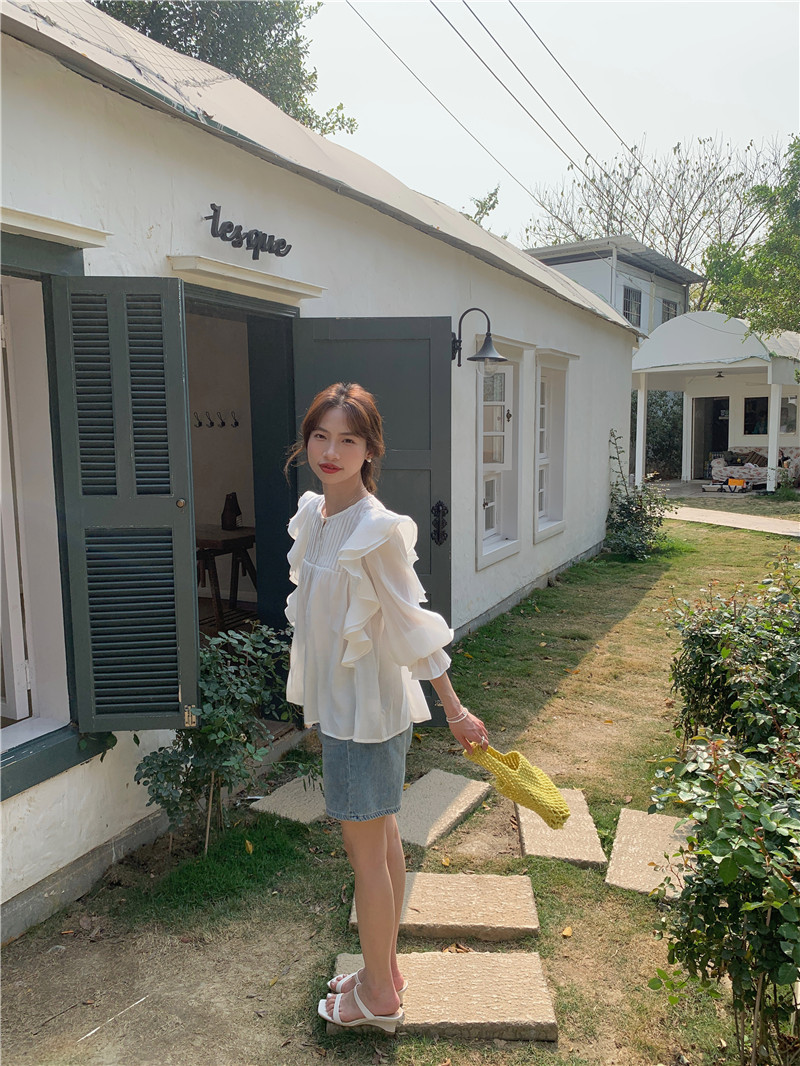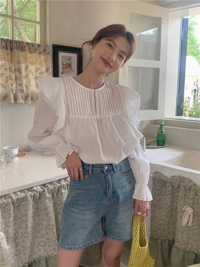 한국 세련된 여름 새로운 틈새 달콤한 모든 경기 러플 크루넥 풀오버 긴 소매 탑 쉬폰 셔츠 여성스토어 가기