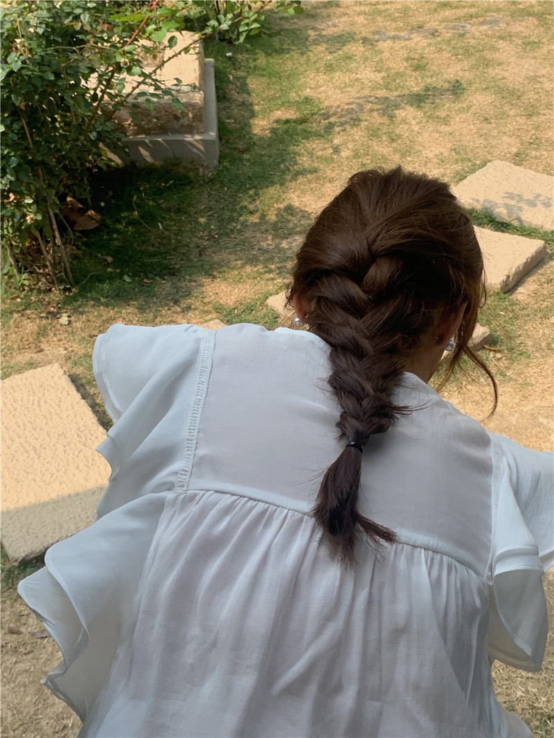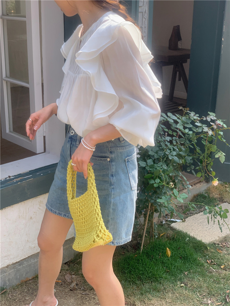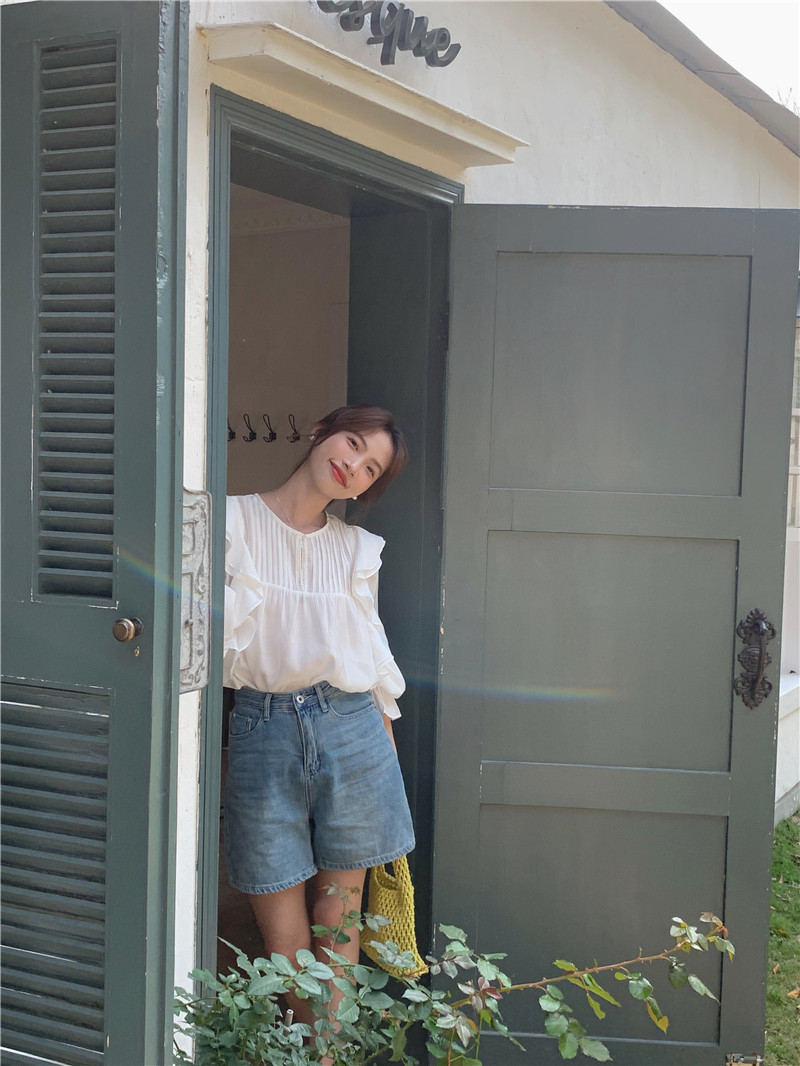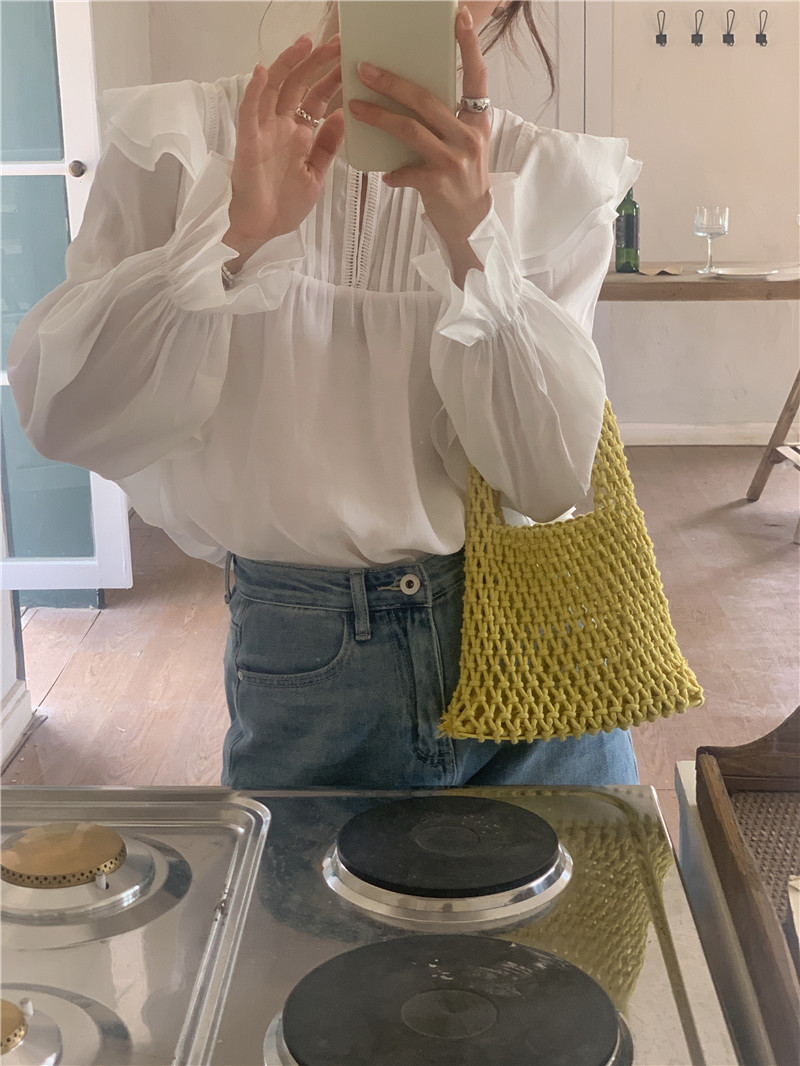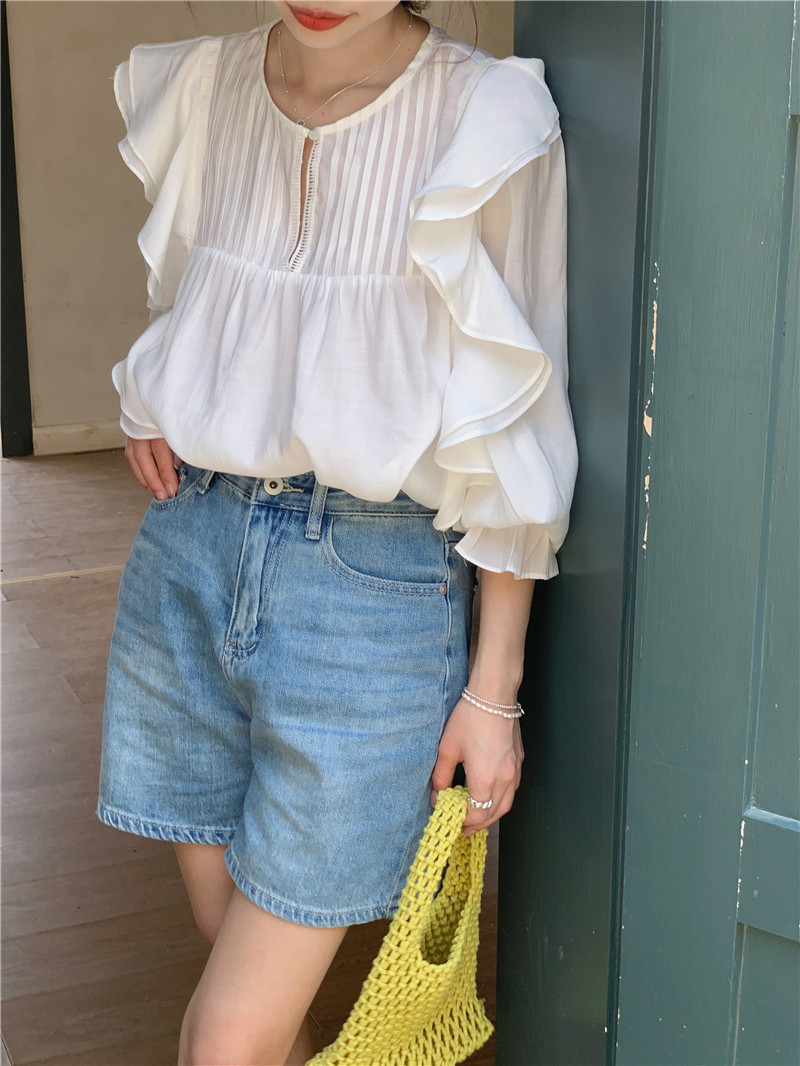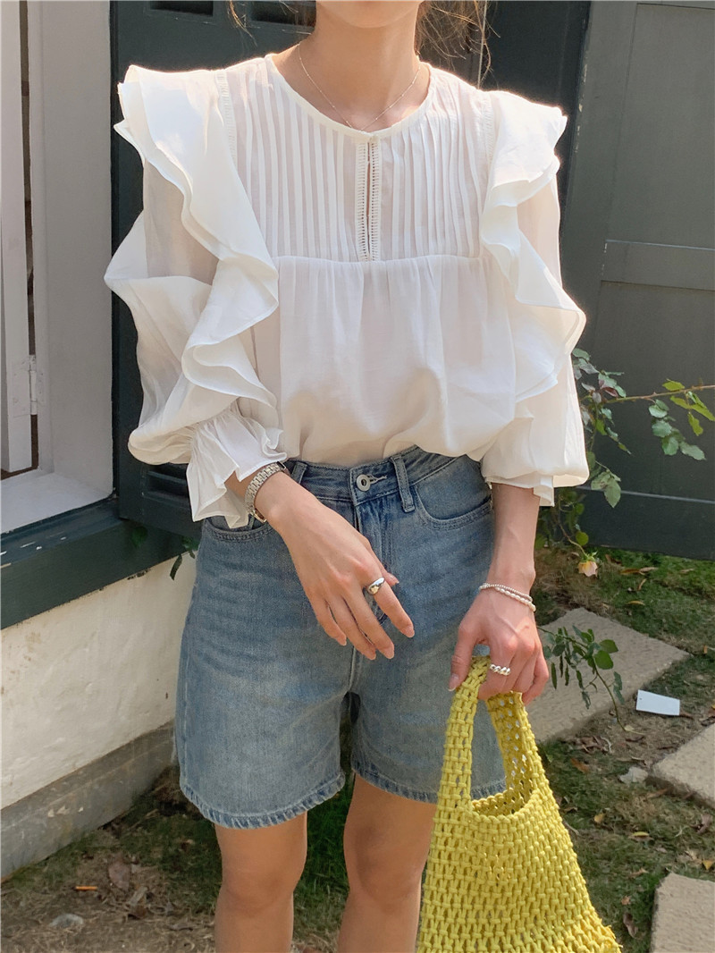 한국 세련된 여름 새로운 틈새 달콤한 모든 경기 러플 크루넥 풀오버 긴 소매 탑 쉬폰 셔츠 여성스토어 가기