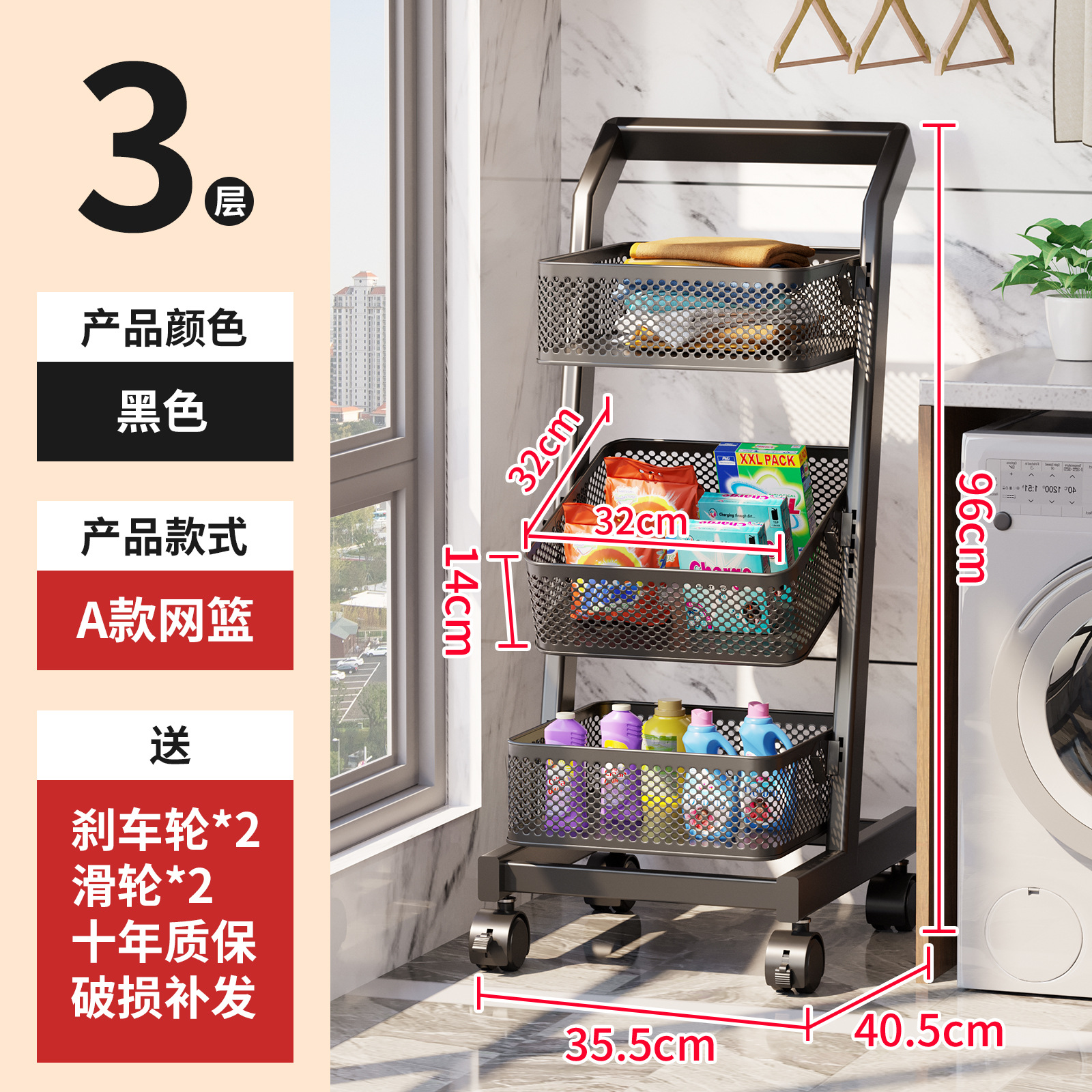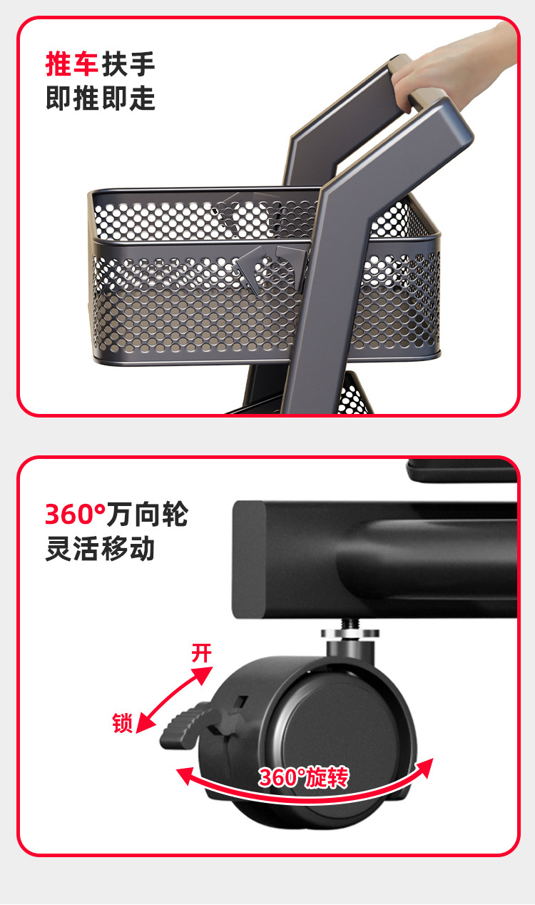 • 카트 선반-큰 바구니 긴 [블랙 3 층] 큰