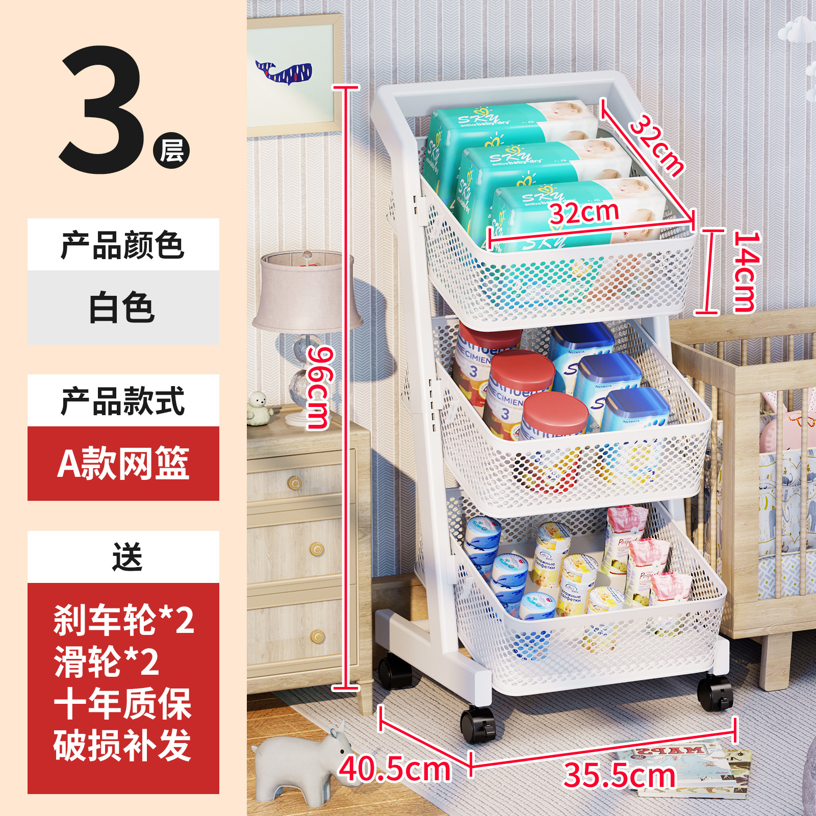 • 카트 저장 랙-큰 바구니 긴 [흰색 4 층] 큰