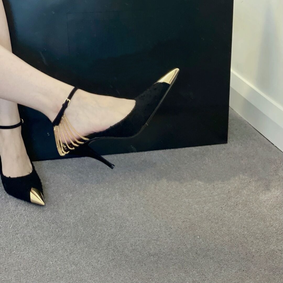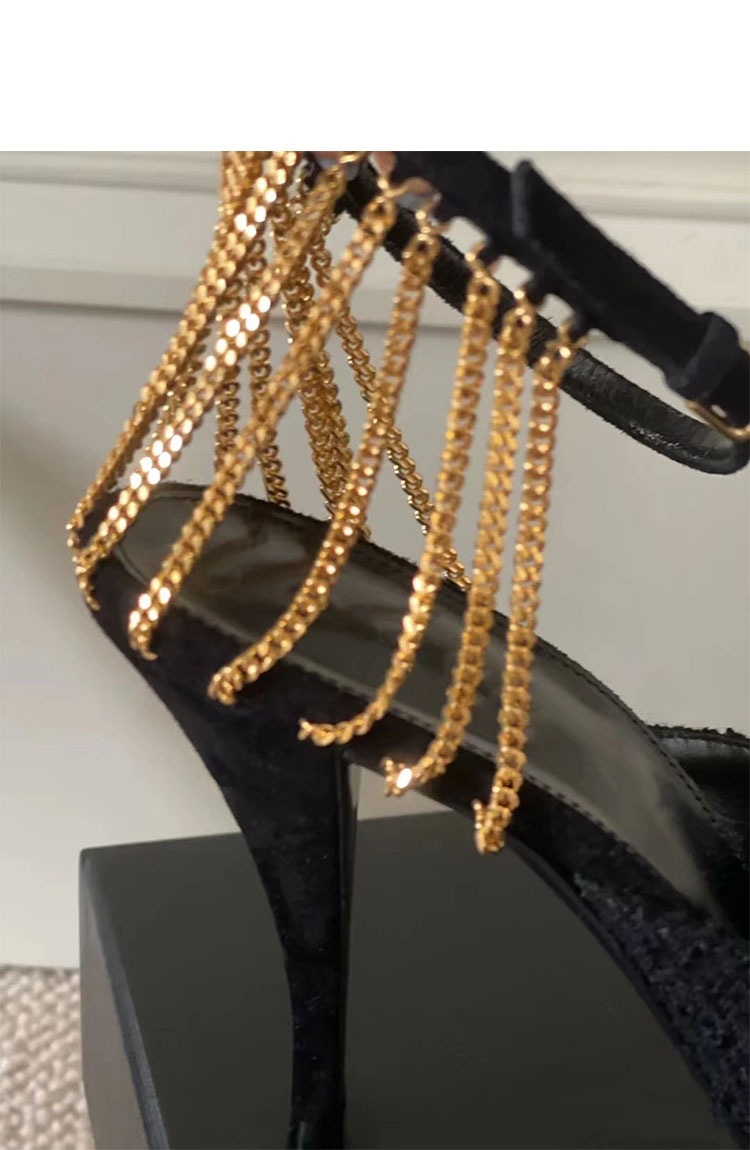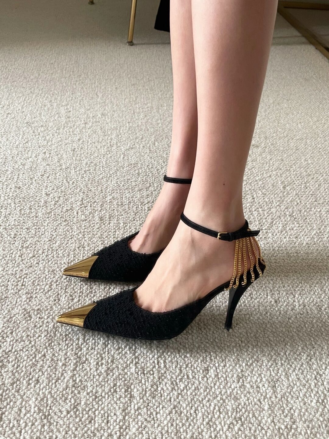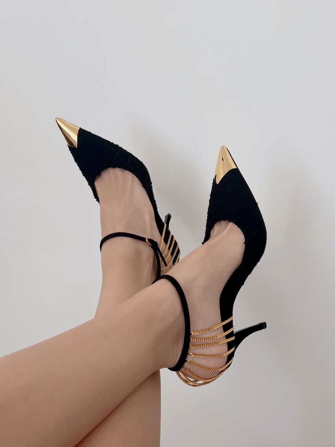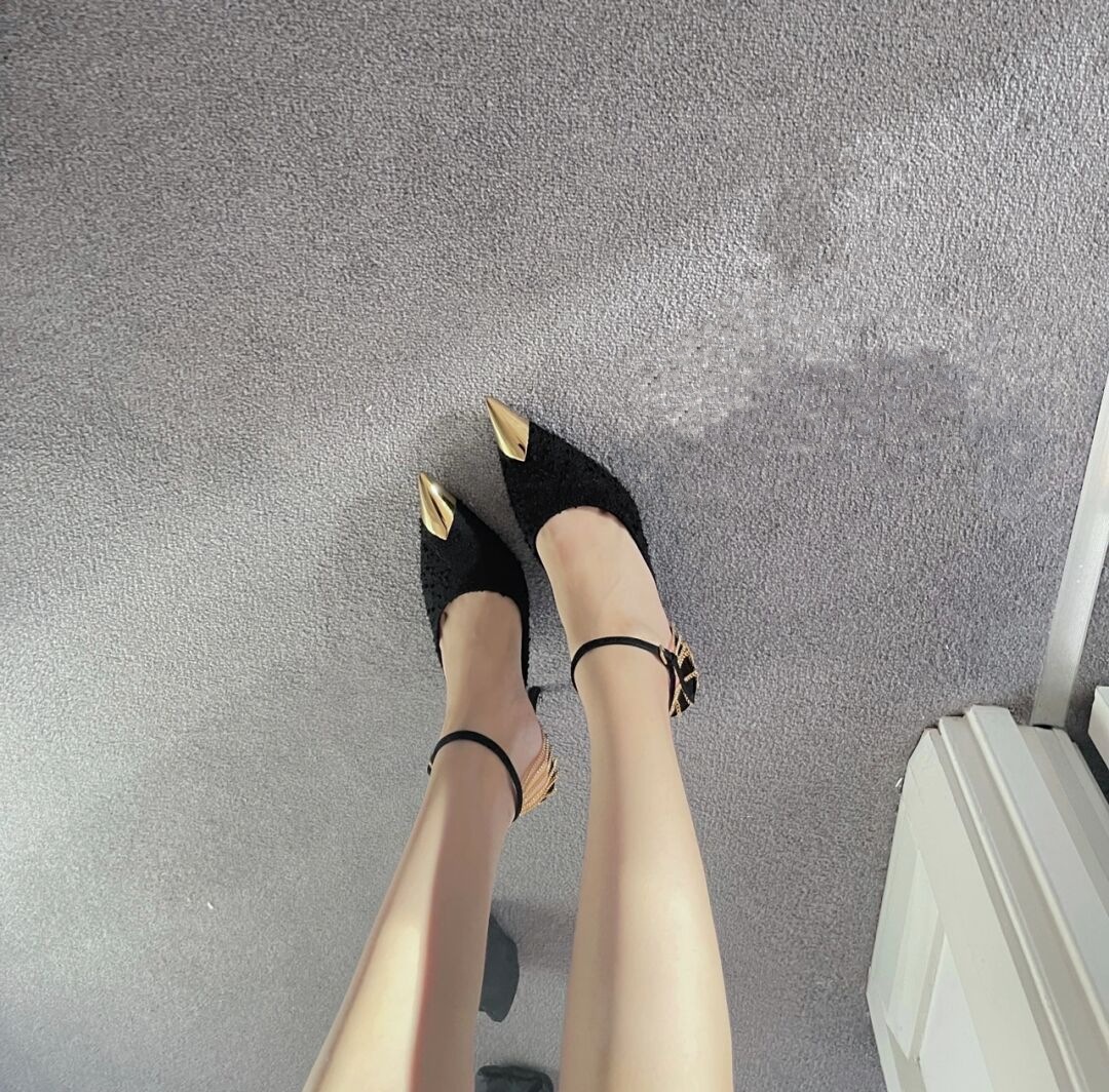 2023 봄과 여름 새로운 검은 하이힐 섹시한 뾰족한 골드 아이언 발가락 스틸레토 힐 신발 요정 샌들 여성스토어 가기