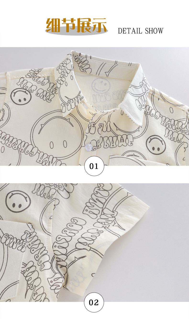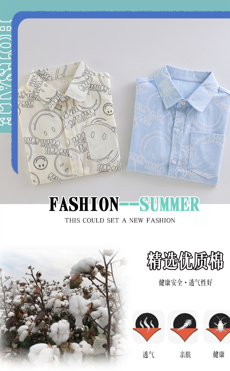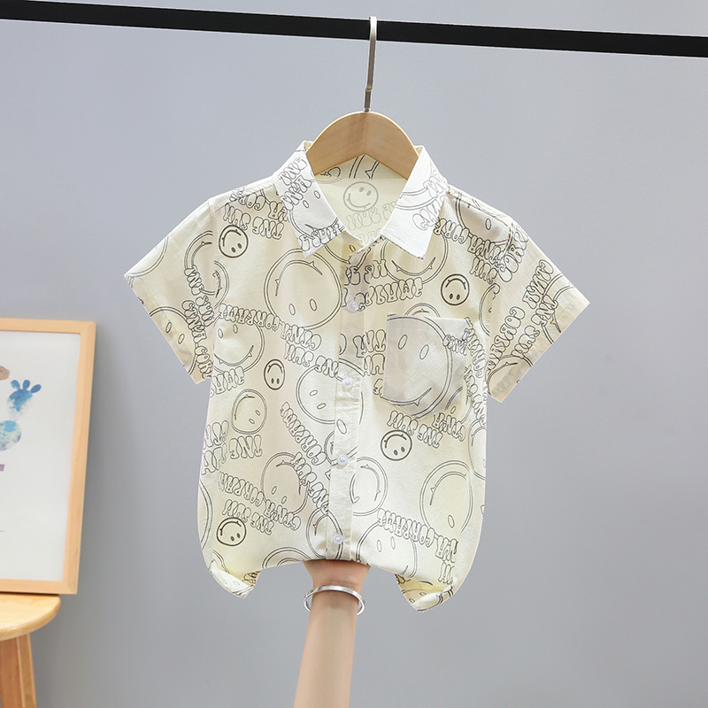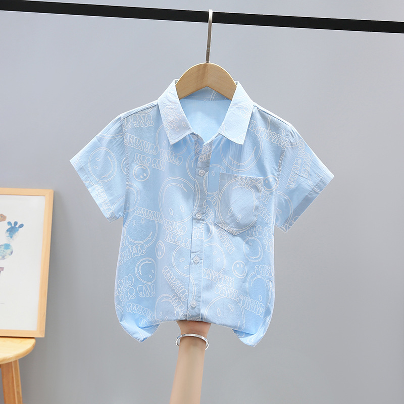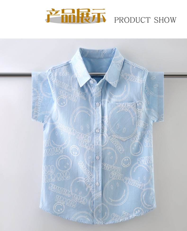 여름 새 소년 얇은 반팔 프린트 셔츠 대형 어린이 스마일 가디건 탑 코튼 캐주얼 보이스토어 가기