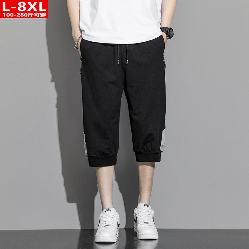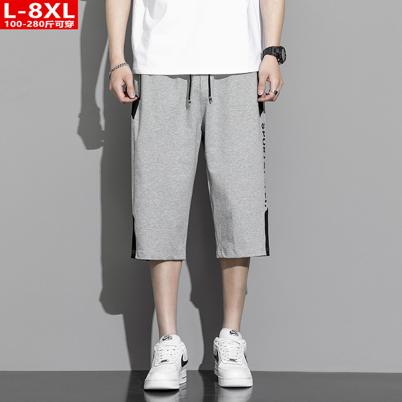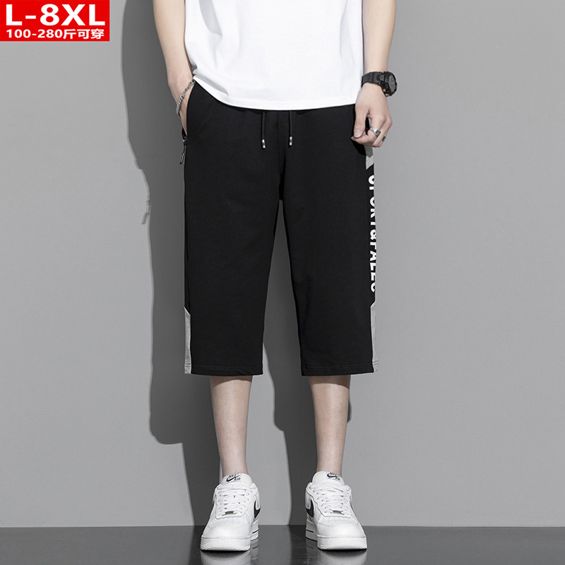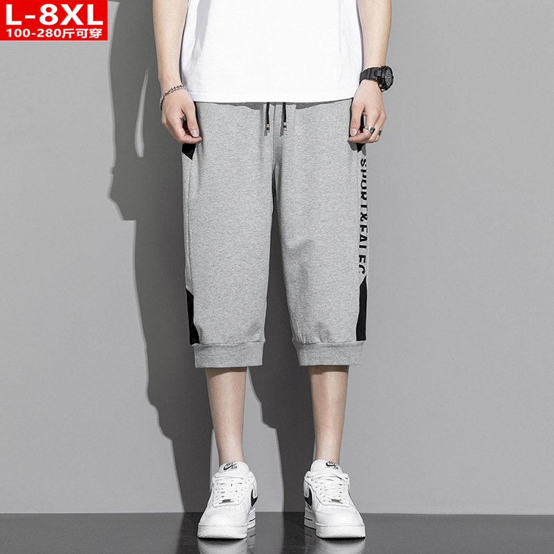 여름 트렌디 남성 프린트 순면 중간 길이 바지 통통한 대형 플러스 뚱뚱한 느슨한 바지 남성 스포츠 캐주얼 크롭 팬츠