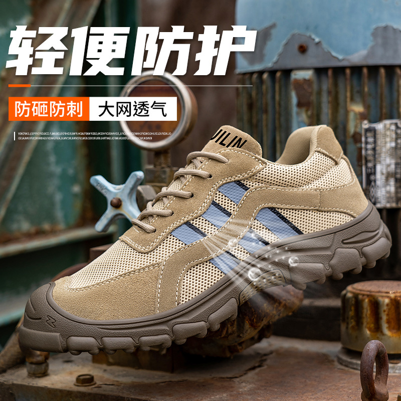 여름 노동 보호 신발 남성용 돼지 가죽 안티 스매싱 펑크 방지 작업 신발 사계절을위한 경량 통기성 대형 그물 안전 신발