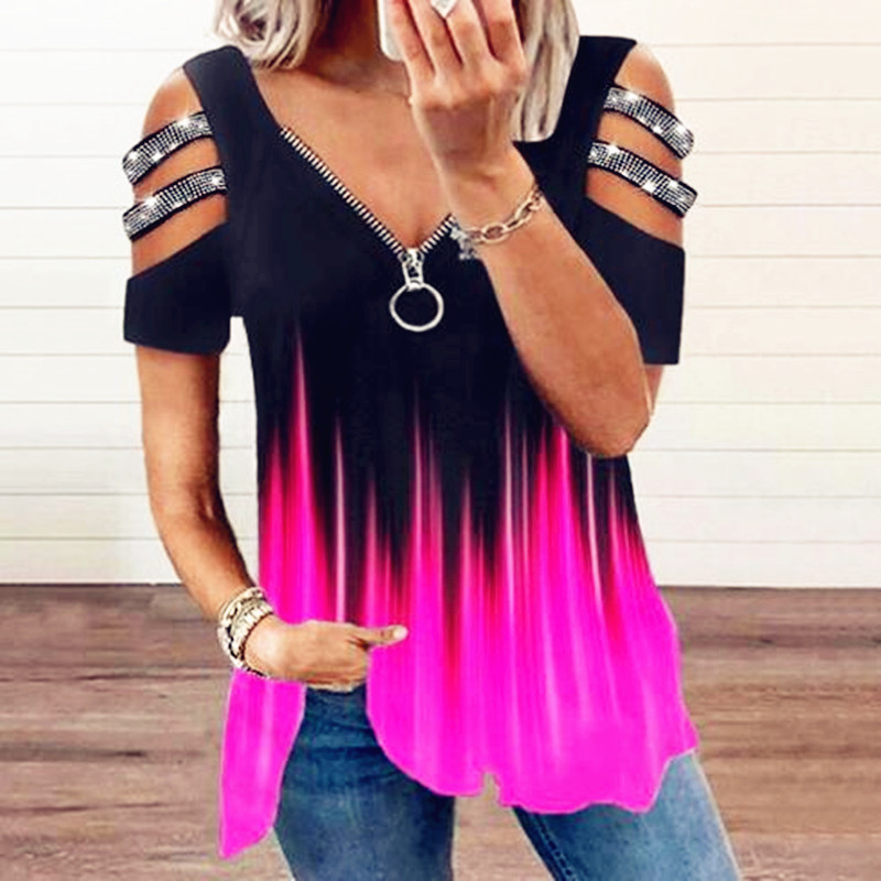 2023欧美跨境wish女装 V领拉链套头印花短袖宽松T恤女式上衣