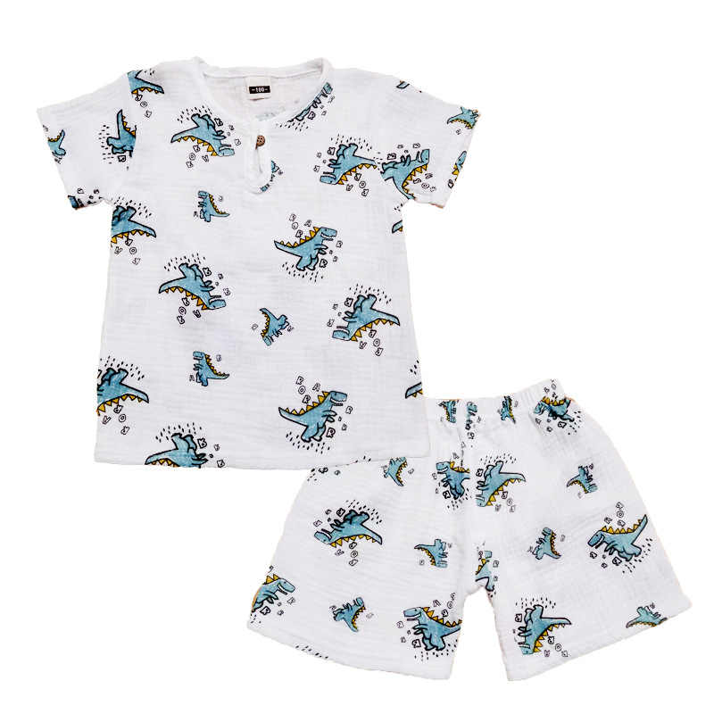 어린이 인쇄 코튼 리넨 반팔 세트 여름 아기의 경량 느슨한 더블 레이어 주름진 코튼 거즈 반바지 투피스 세트