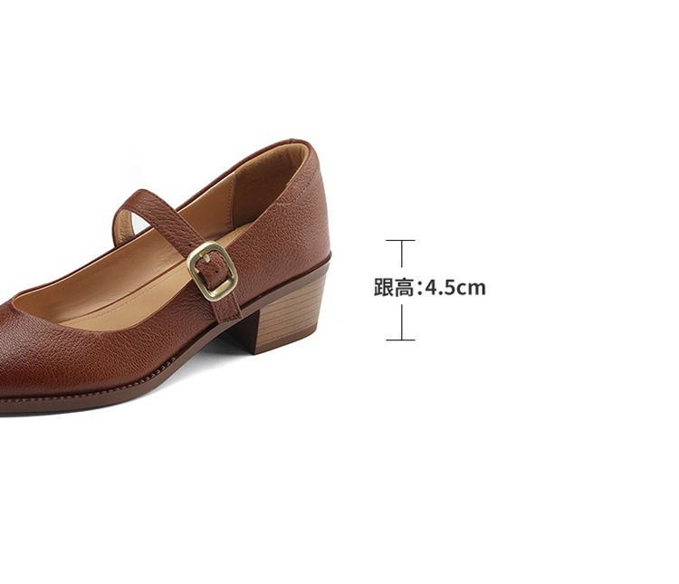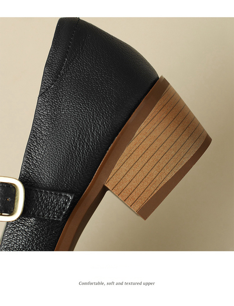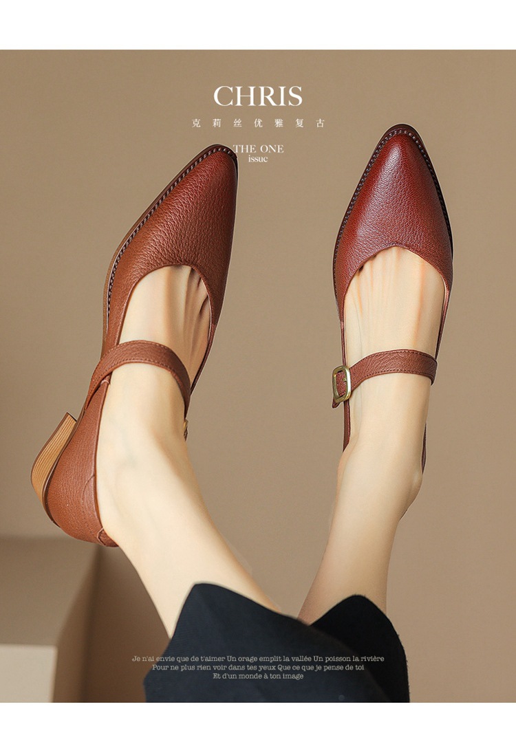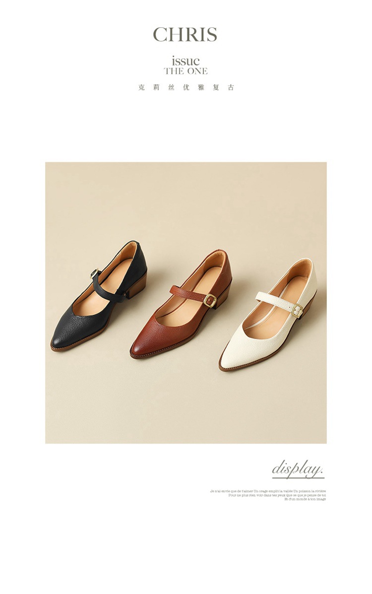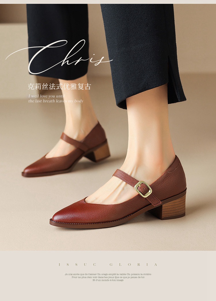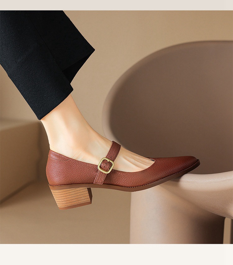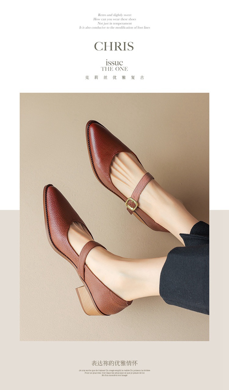 빈티지 메리 제인 신발 가죽 두꺼운 굽 단일 레이어 신발 여성의 가을 새로운 얕은 입 뾰족한 1 자 버클 미들 힐 41-43스토어 가기