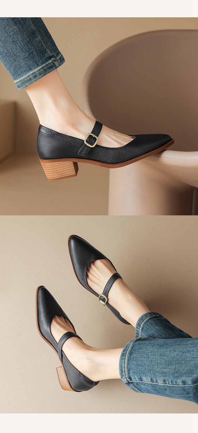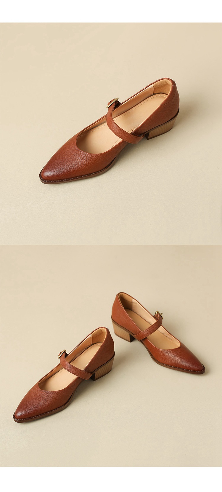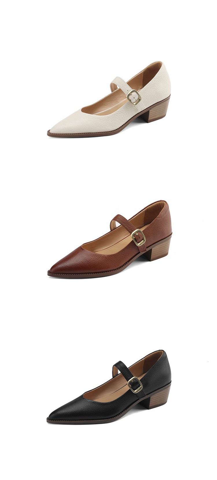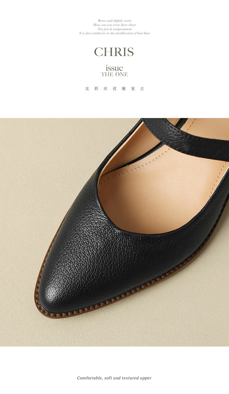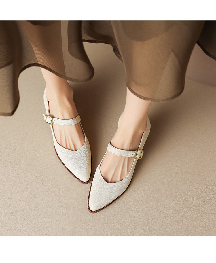 빈티지 메리 제인 신발 가죽 두꺼운 굽 단일 레이어 신발 여성의 가을 새로운 얕은 입 뾰족한 1 자 버클 미들 힐 41-43스토어 가기