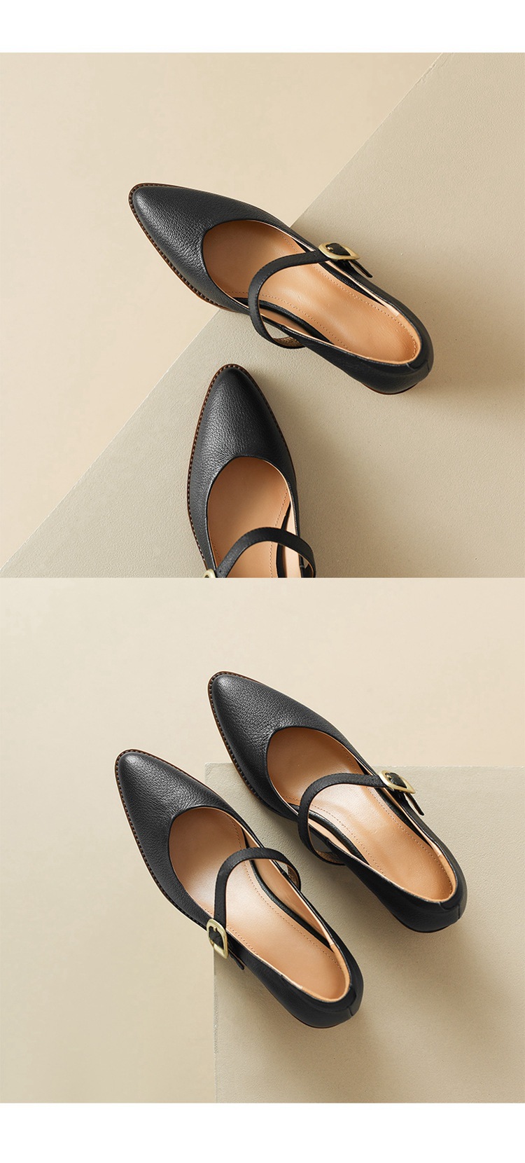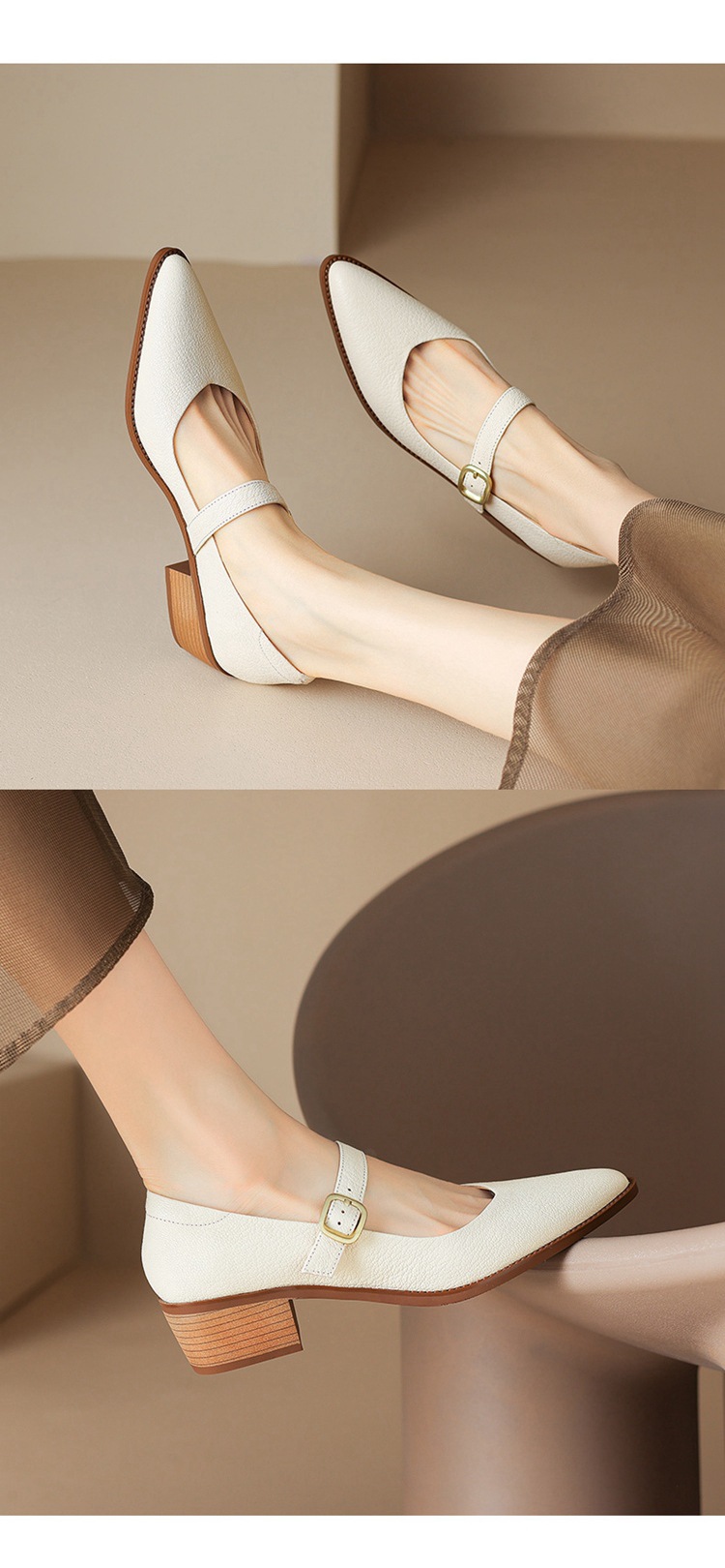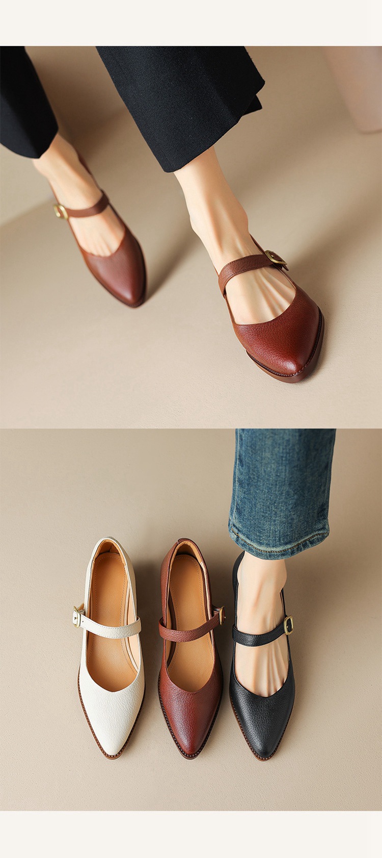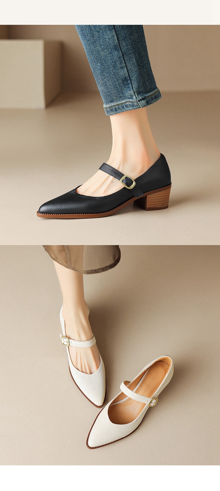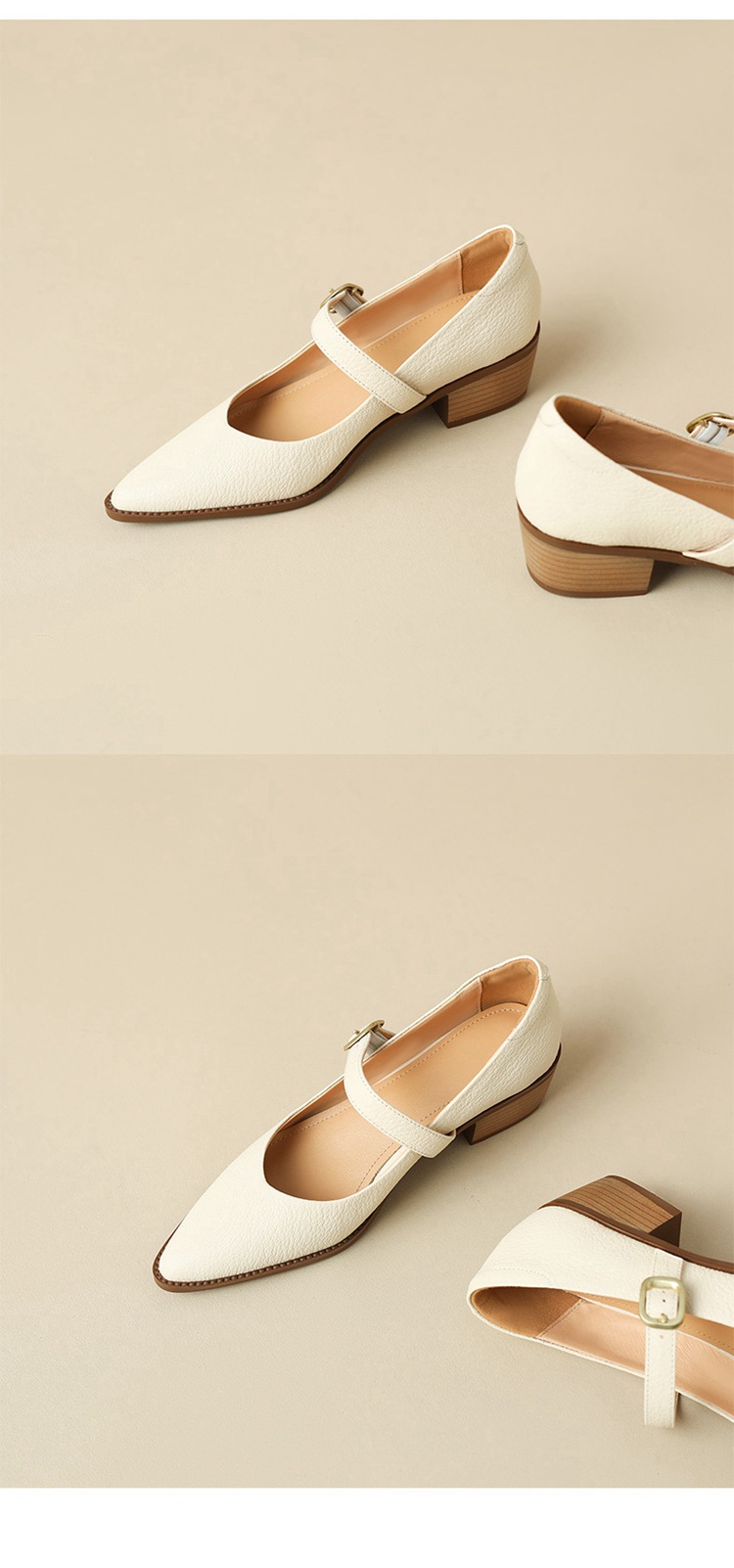 빈티지 메리 제인 신발 가죽 두꺼운 굽 단일 레이어 신발 여성의 가을 새로운 얕은 입 뾰족한 1 자 버클 미들 힐 41-43스토어 가기