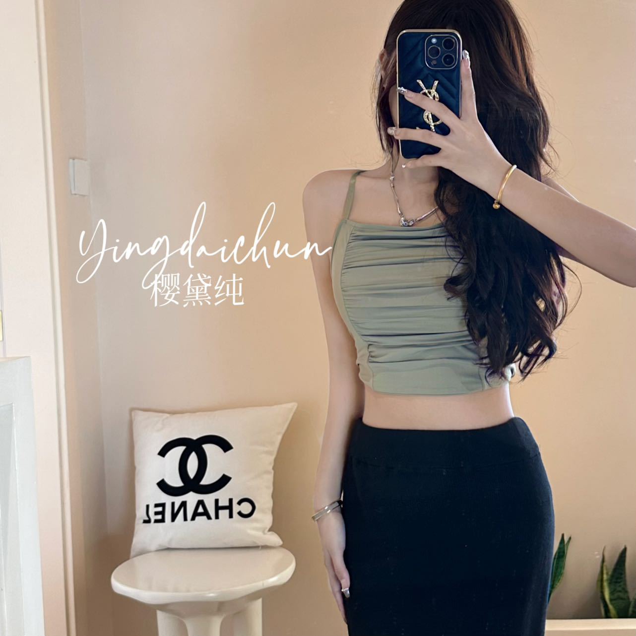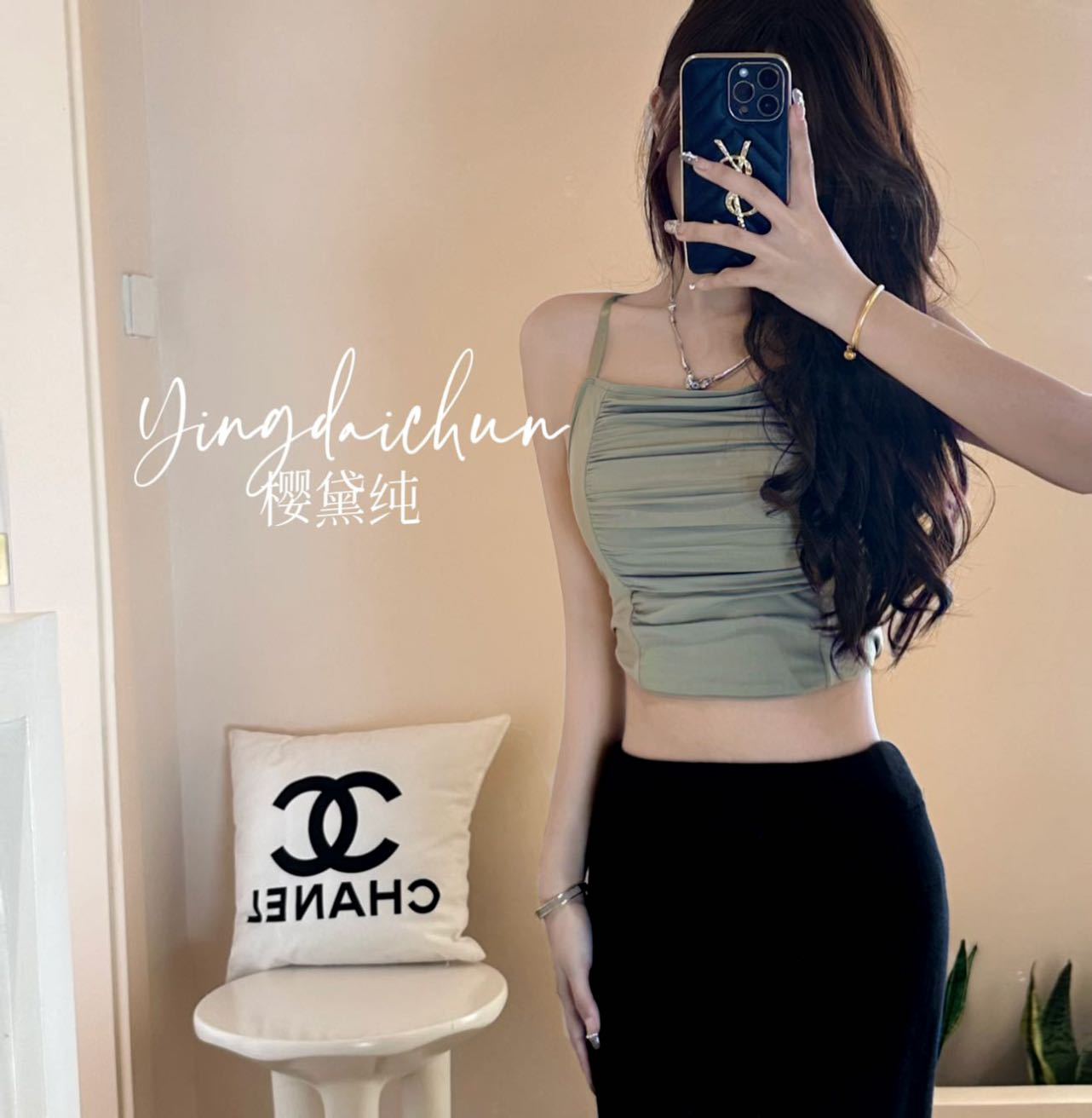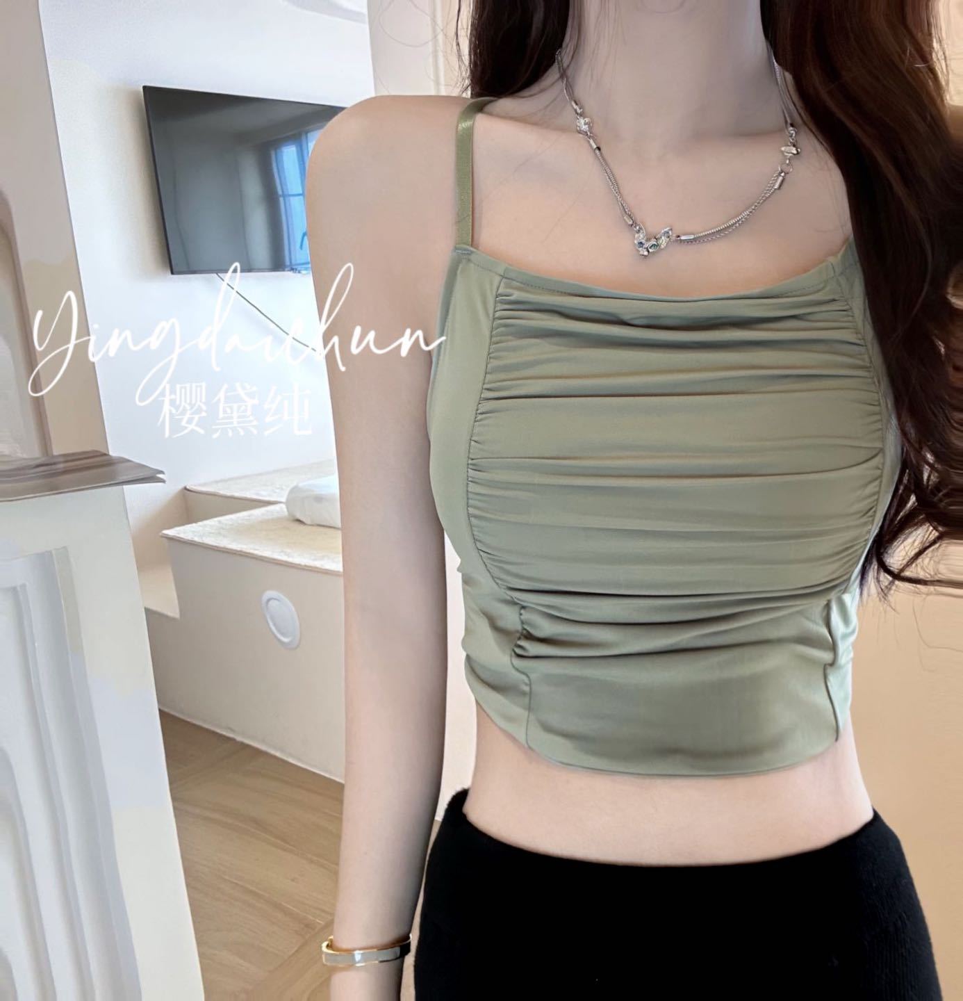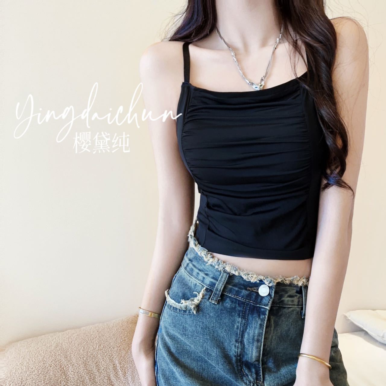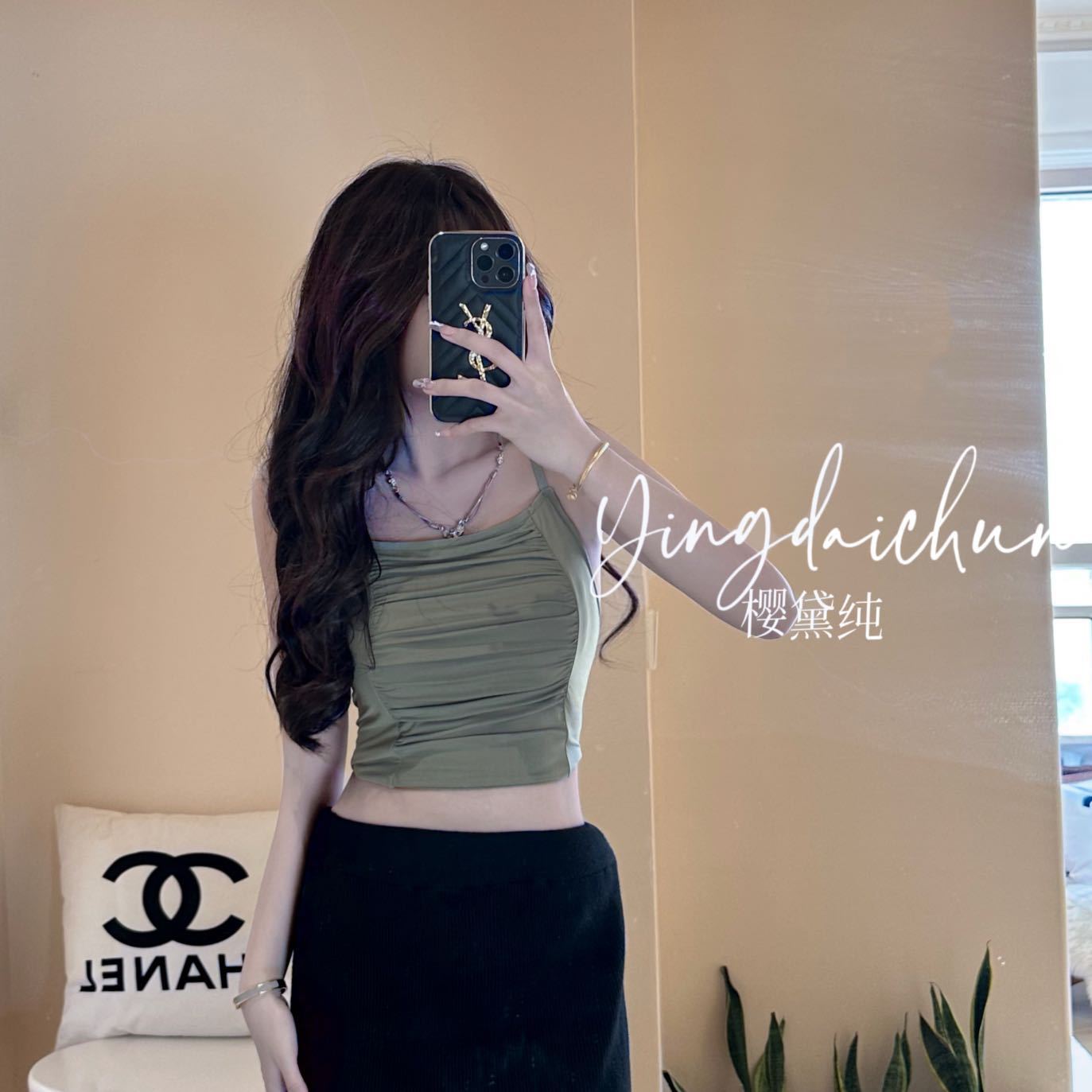 오리지널 아이스 실크 앞면 주름 디자인으로 슬림한 효과를 주는 태국식 끈탑, 가슴 패드가 있는 여성 이너웨어, 외부에서도 착용 가능한 싱글 조끼