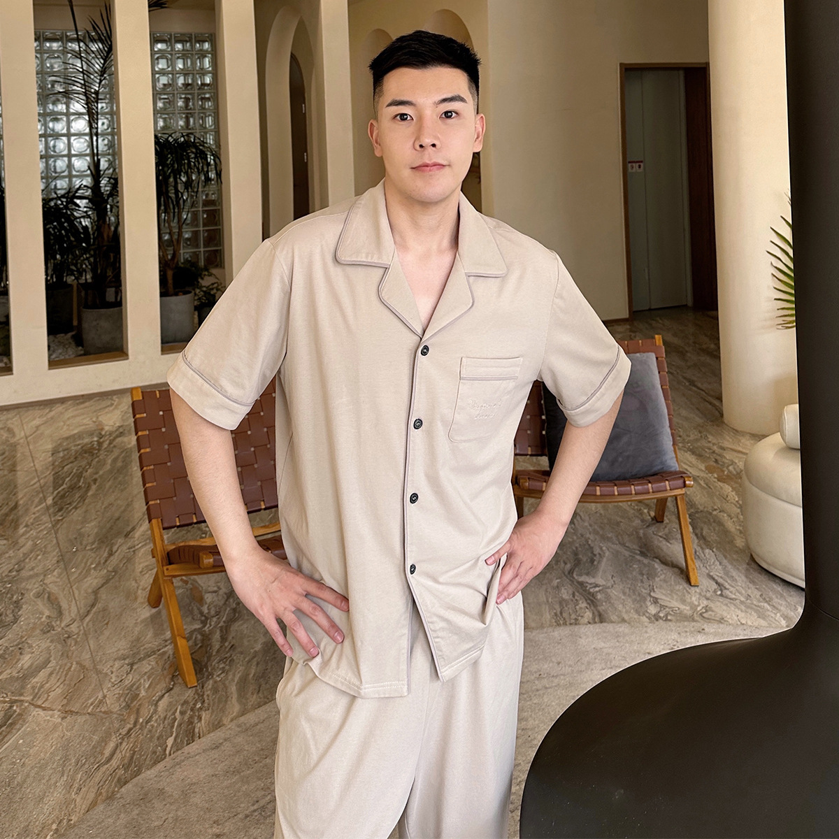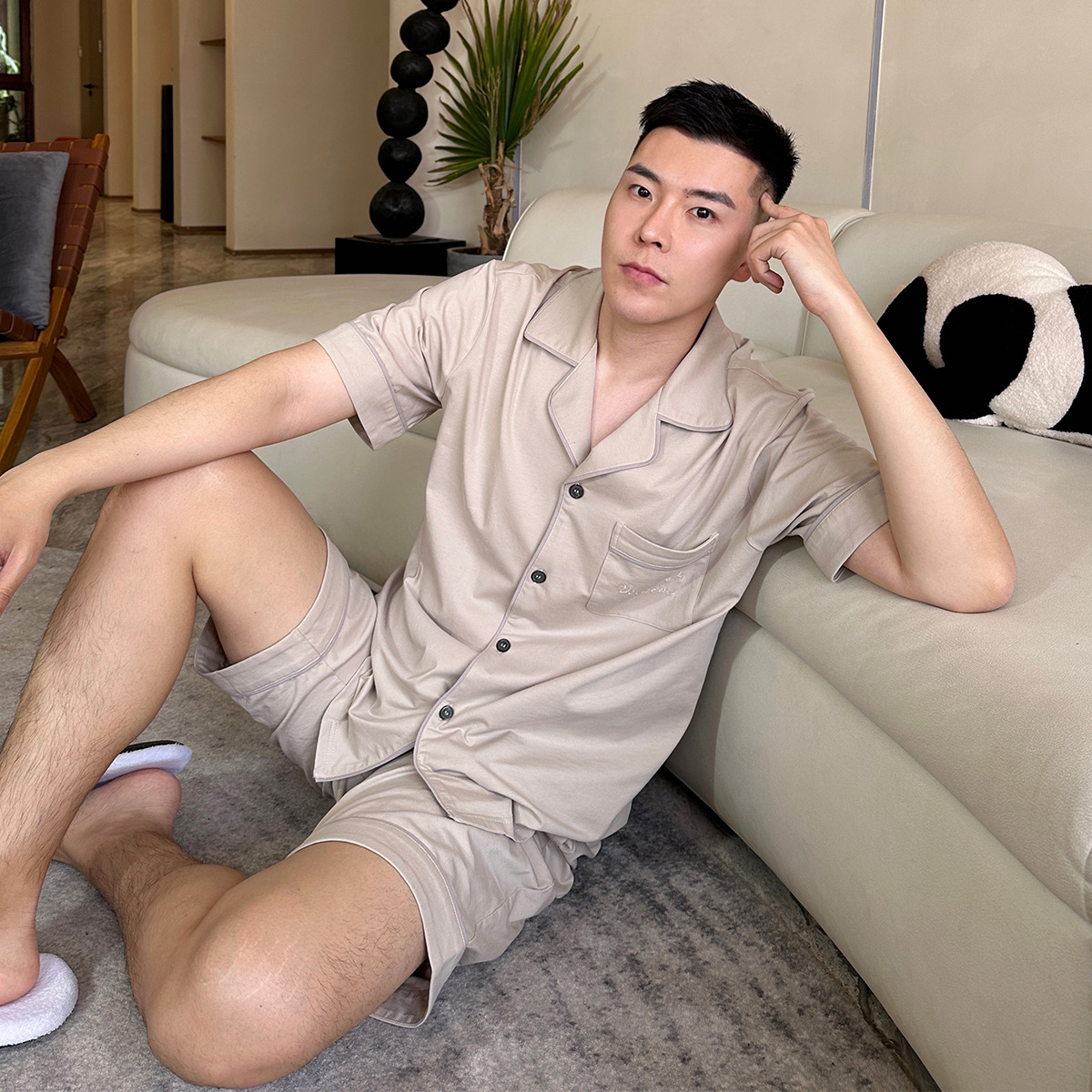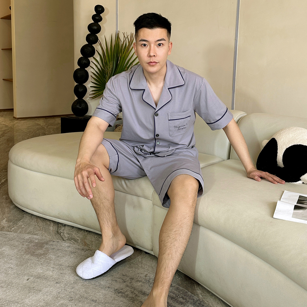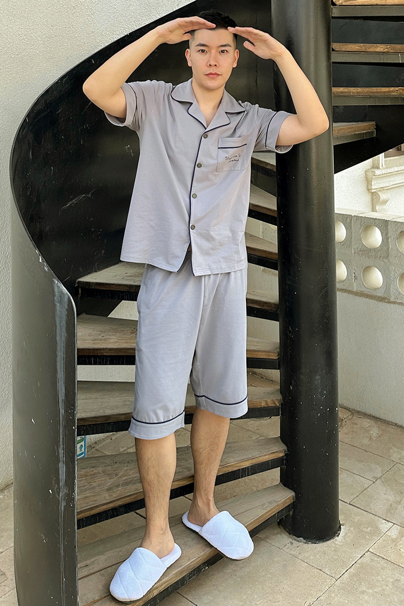 2023 새로운 면 남성 잠옷 반팔 반바지 세트 면 가정 의류 봄과 가을 도매 머리카락의 세대스토어 가기