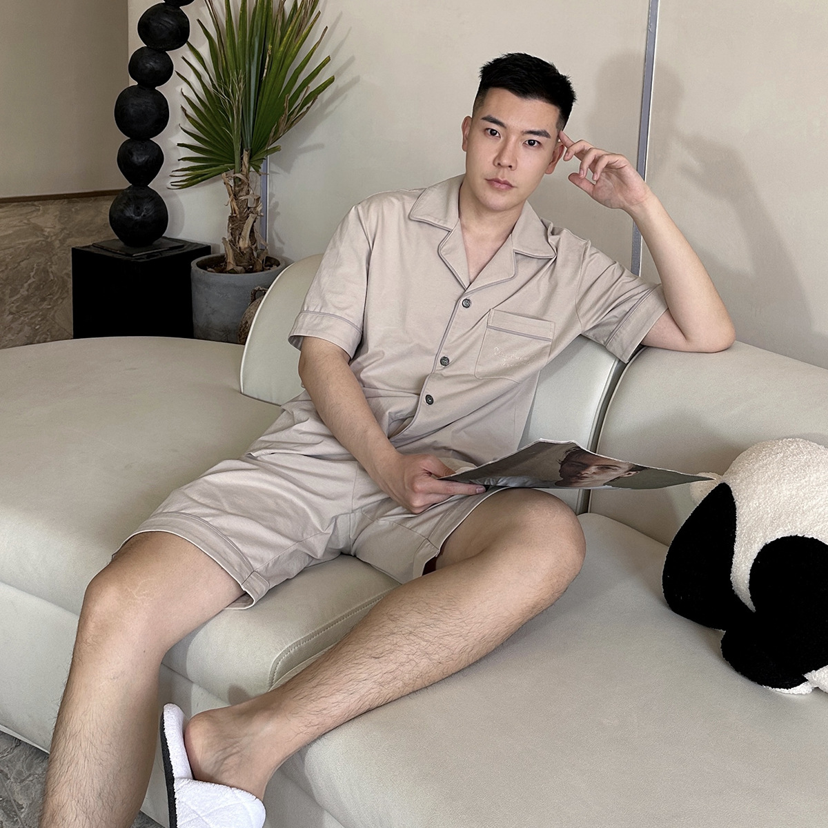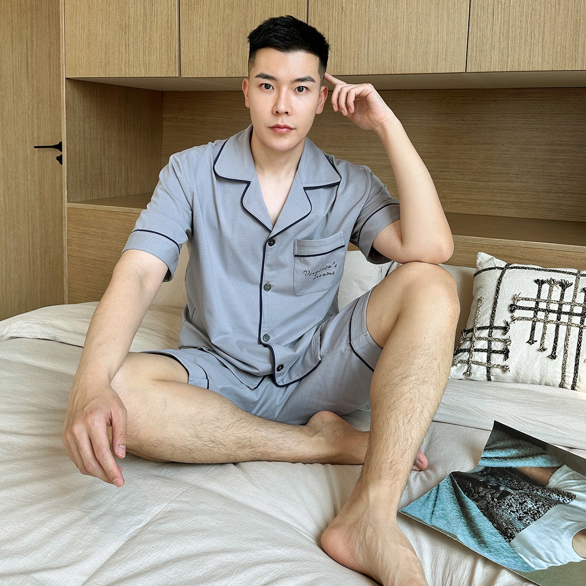 2023 새로운 면 남성 잠옷 반팔 반바지 세트 면 가정 의류 봄과 가을 도매 머리카락의 세대