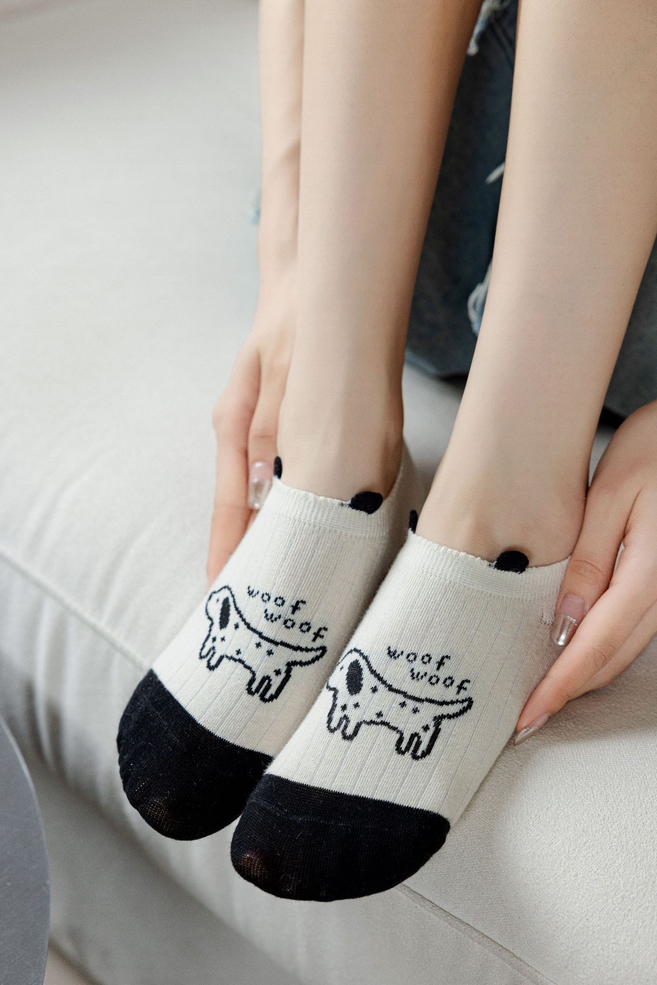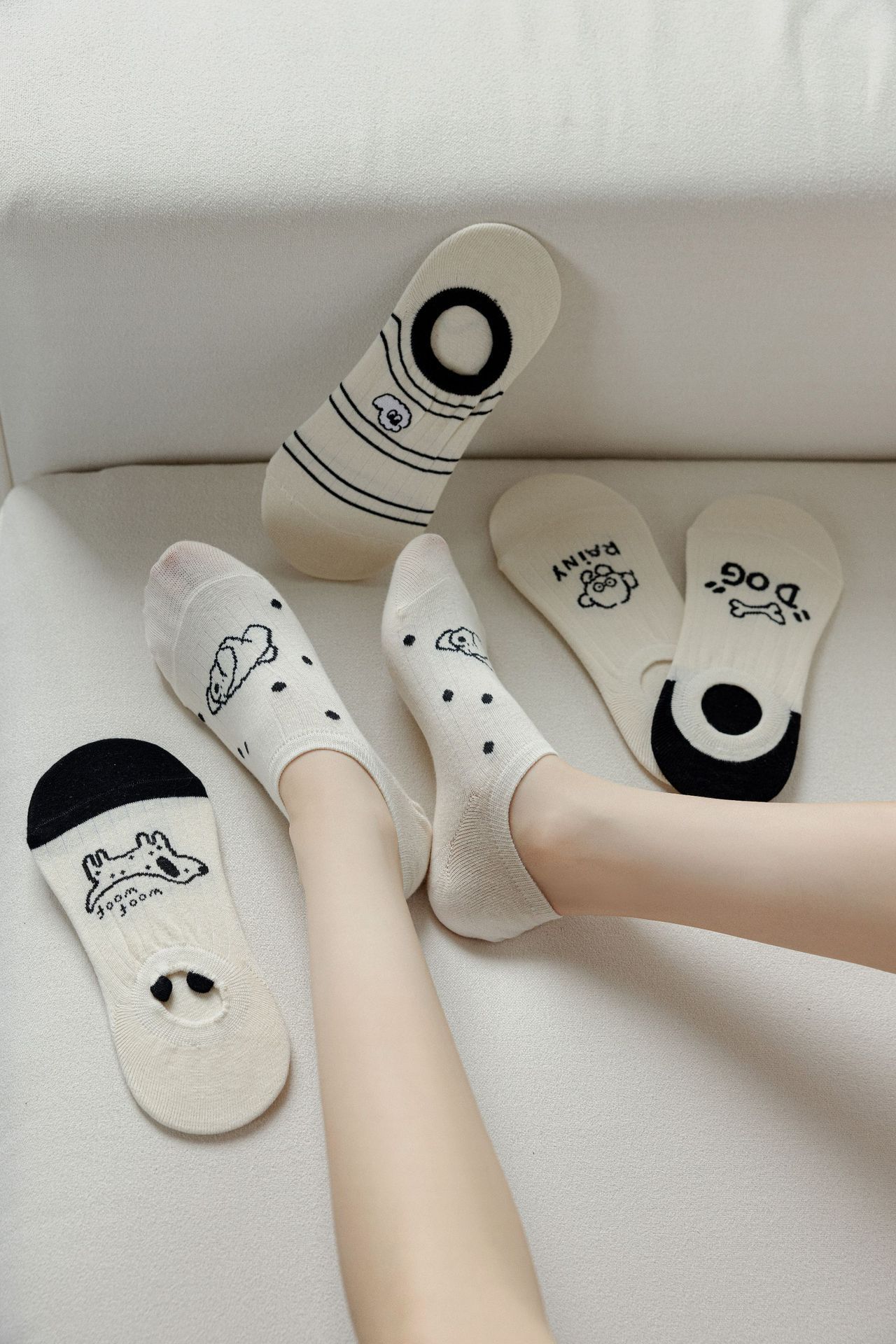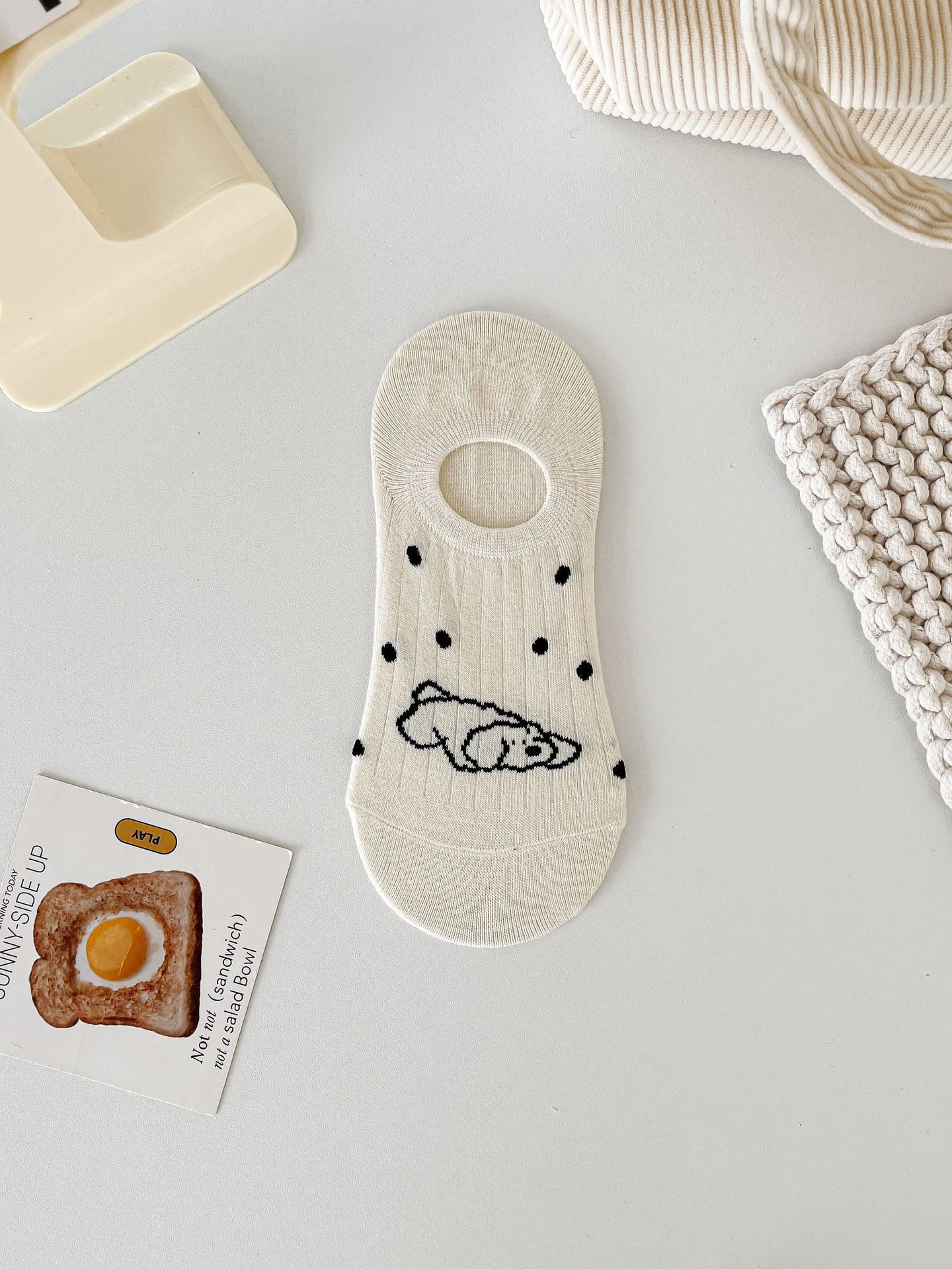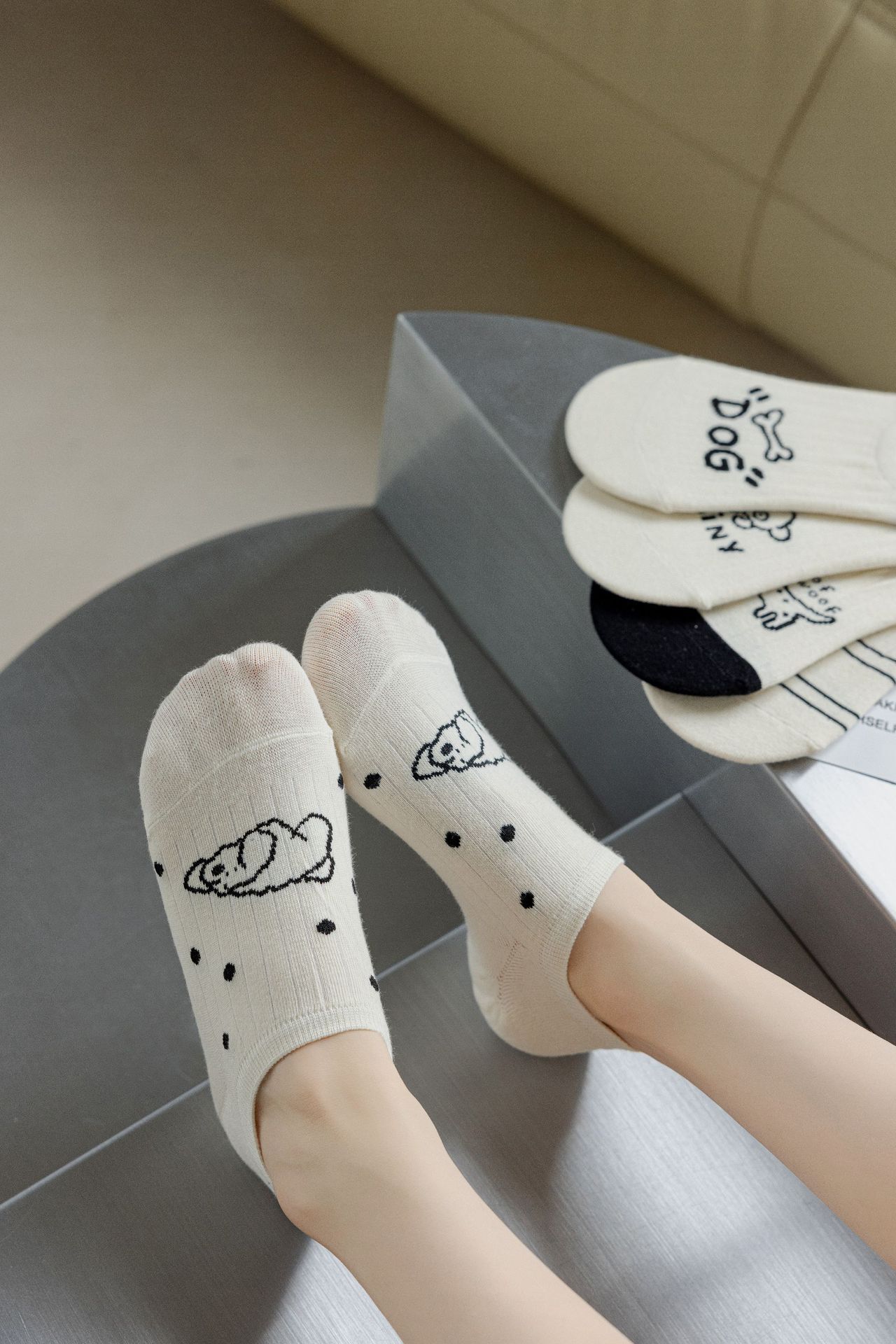 베이지 색 귀여운 강아지 보트 양말 여성 여름 얇은 면 양말 미끄럼 방지 스텔스 양말 여성용 얕은 양말