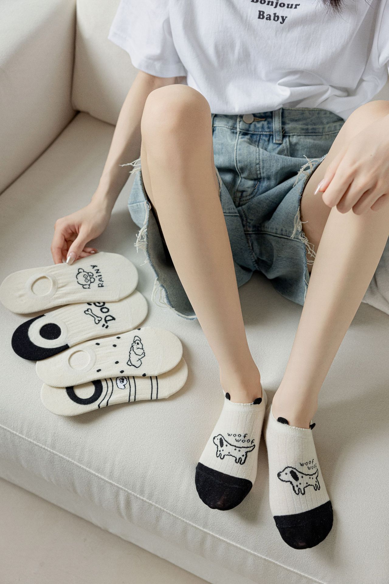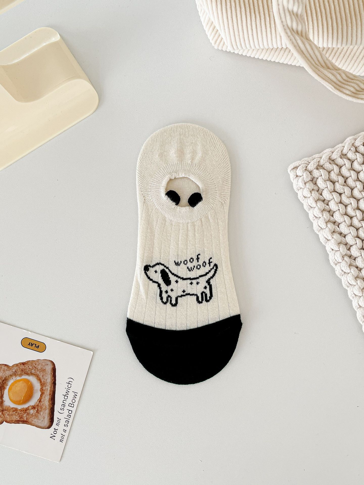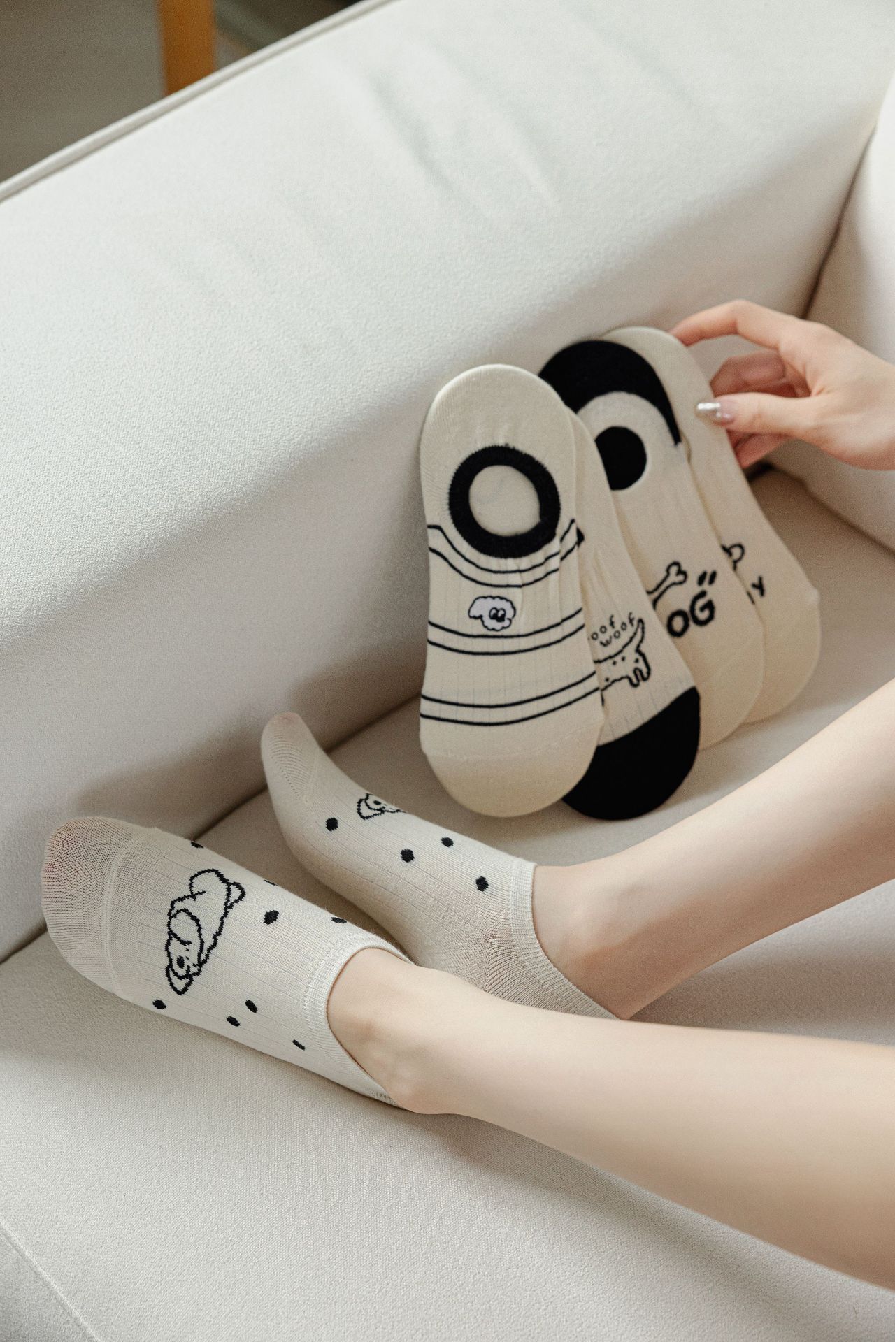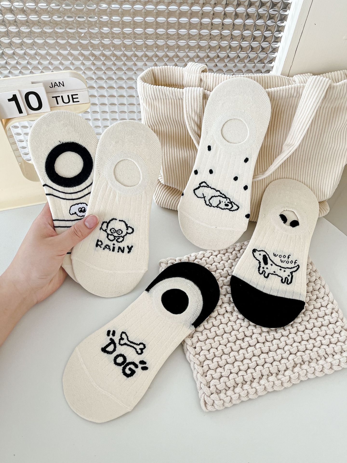 베이지 색 귀여운 강아지 보트 양말 여성 여름 얇은 면 양말 미끄럼 방지 스텔스 양말 여성용 얕은 양말