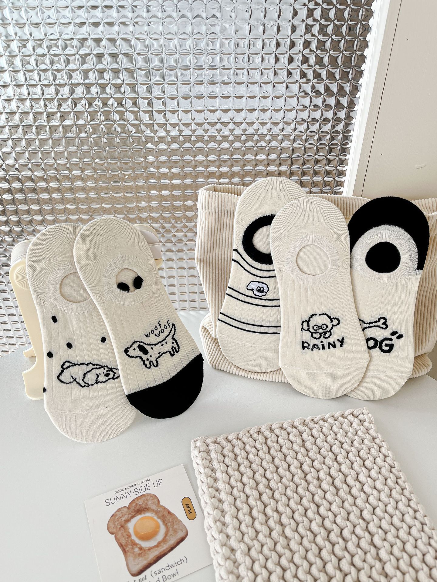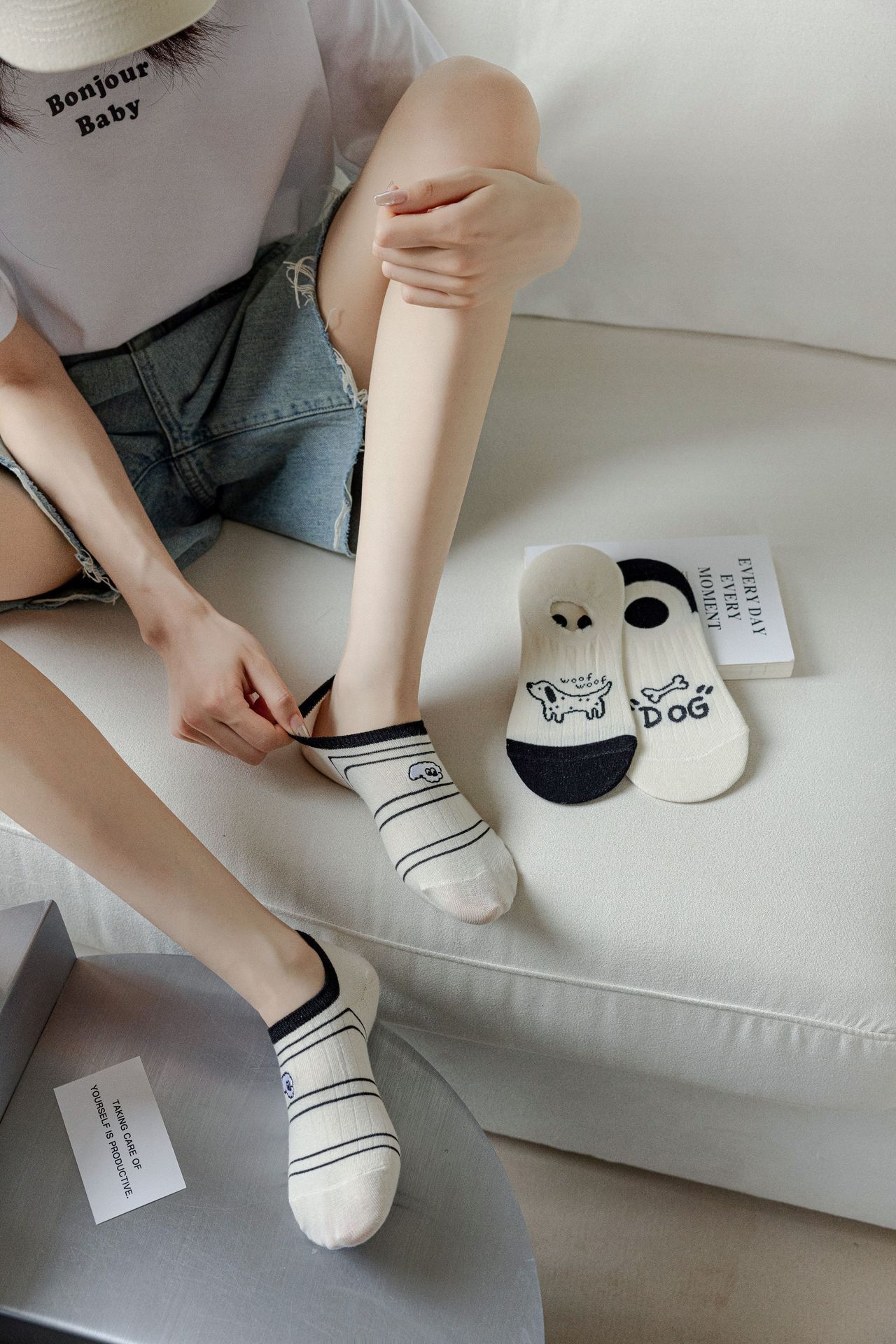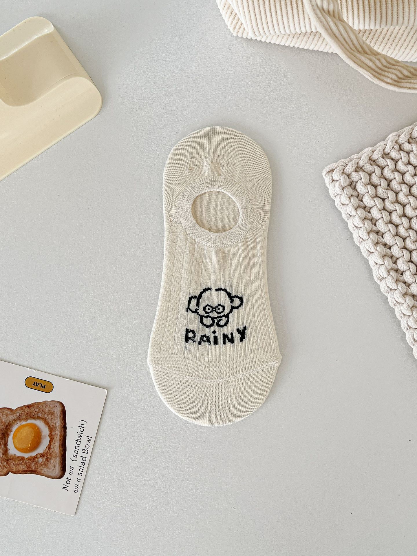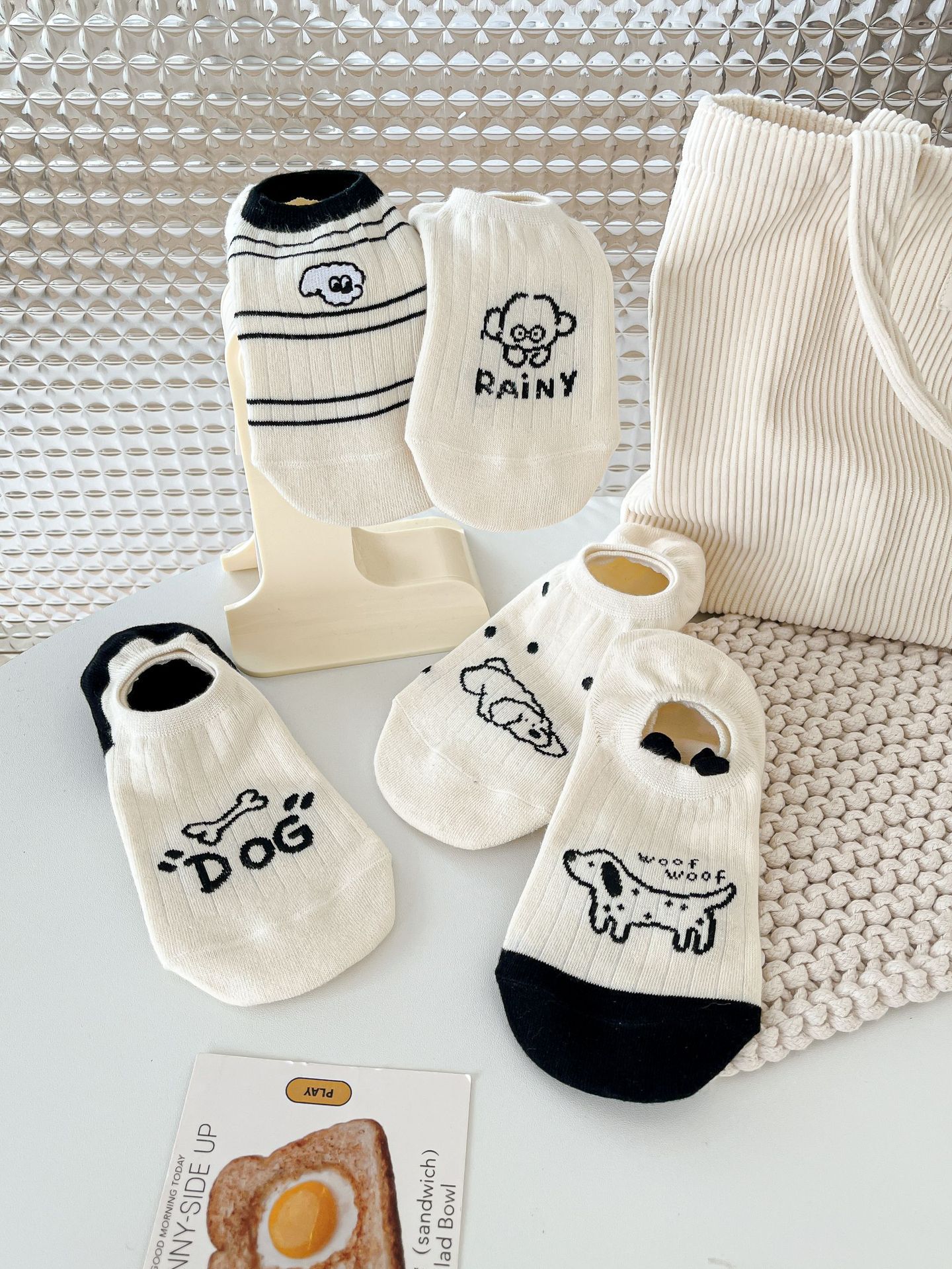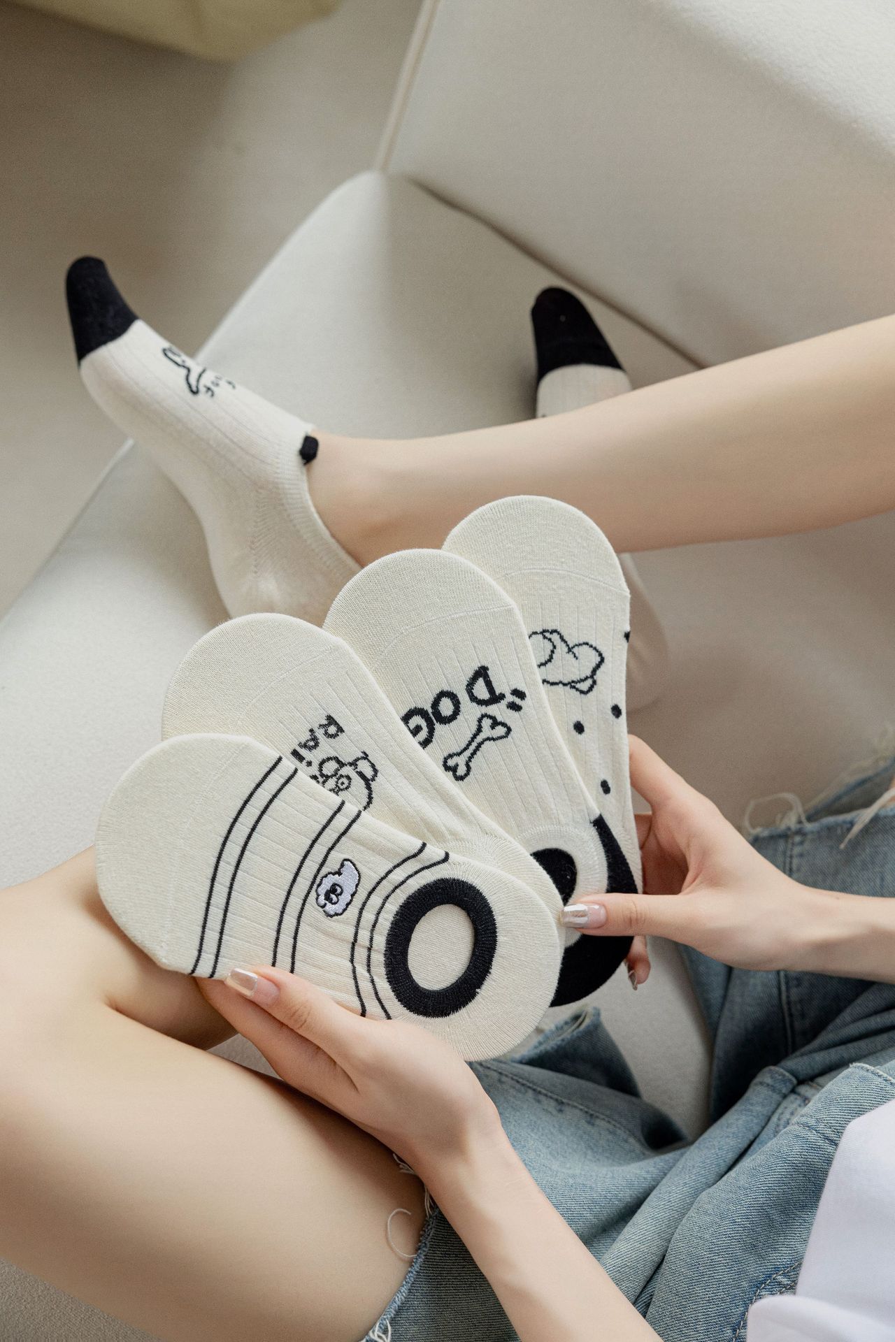 베이지 색 귀여운 강아지 보트 양말 여성 여름 얇은 면 양말 미끄럼 방지 스텔스 양말 여성용 얕은 양말