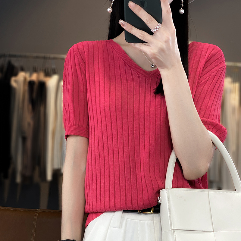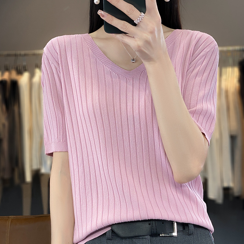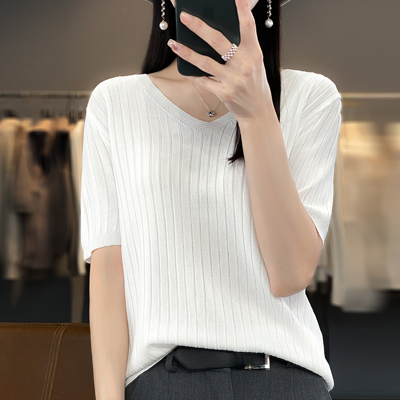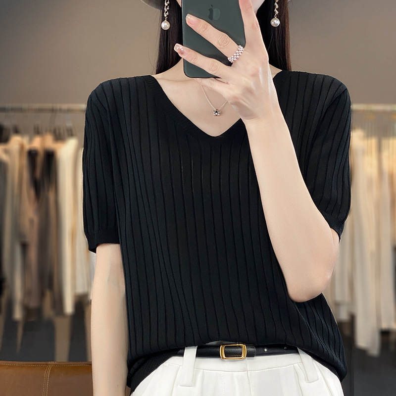 2023 뉴 여름 v 넥 아이스 실크 반팔 니트 여성 느슨한 얇은 아이스 실크 티셔츠 여성 탑 도매스토어 가기